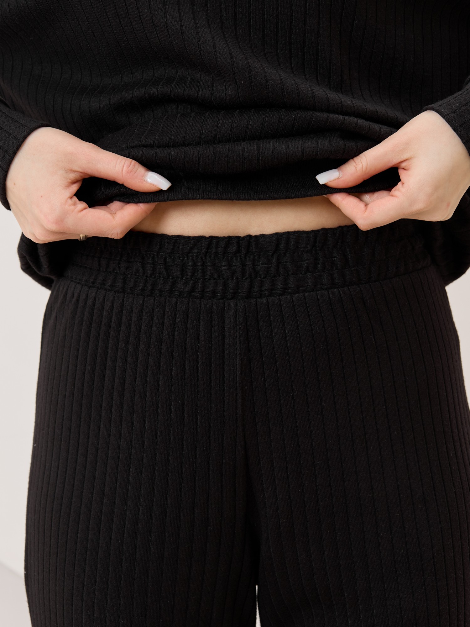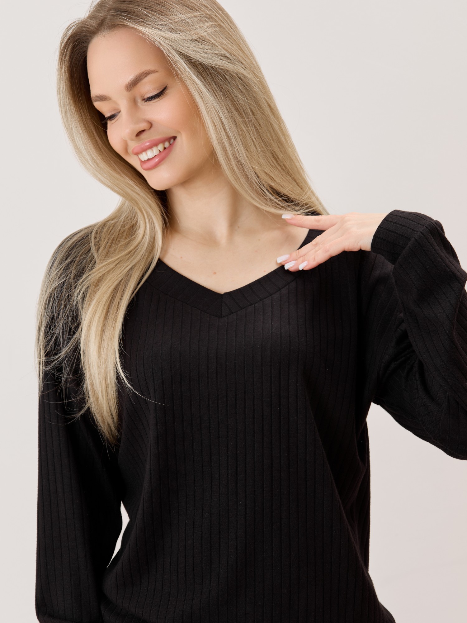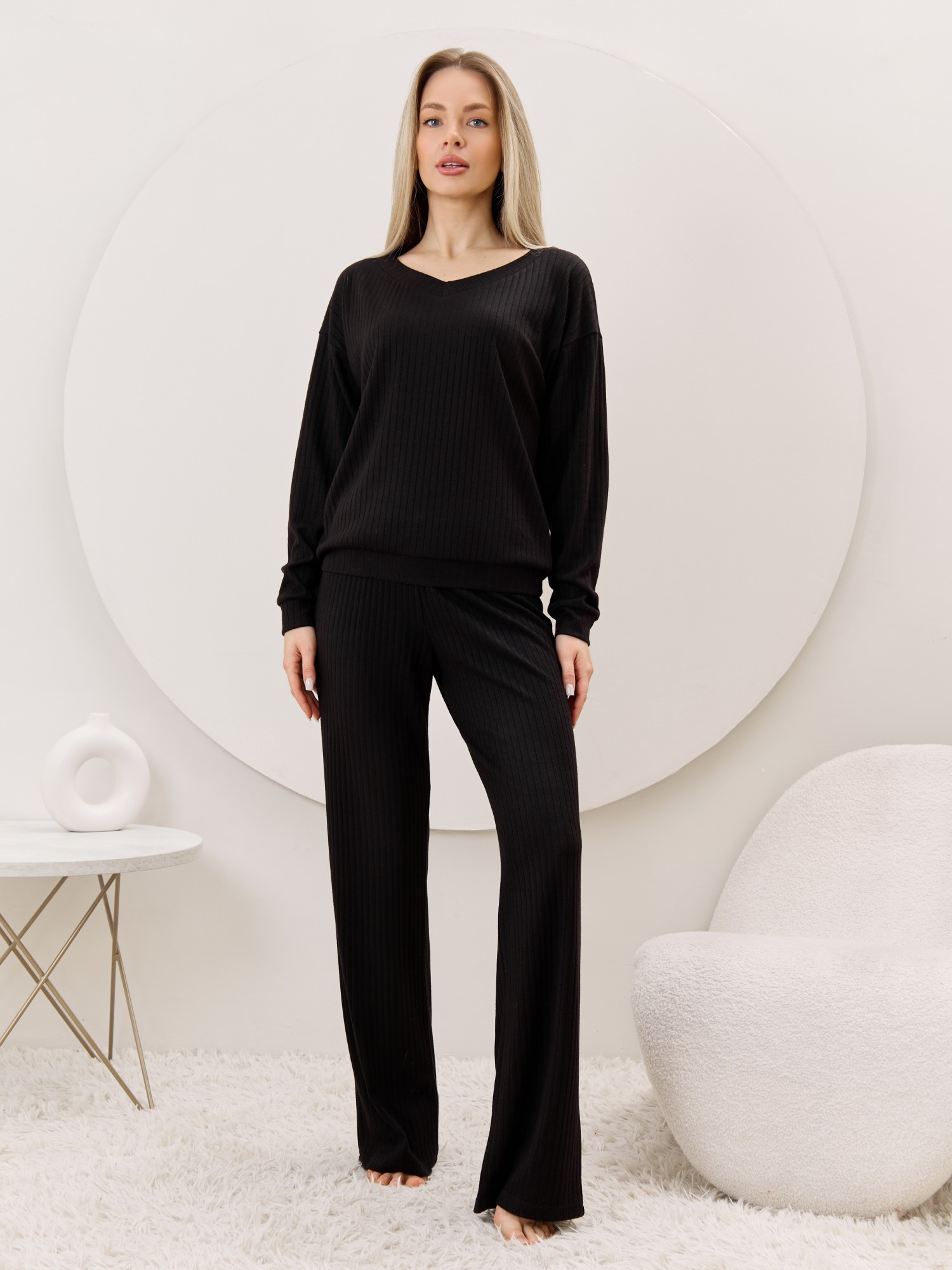 Джемпер женский из гладкокрашенного трикотажного фактурного полотна в «рубчик» с добавлением ангоры, классического покроя, с расширенной V-образной горловиной, обработанной втачной планкой, длинными втачными рукавами. Низ изделия обработан притачным поясом, рукава с манжетами.