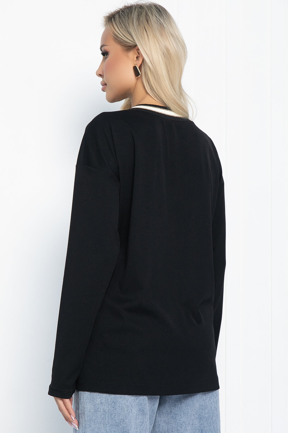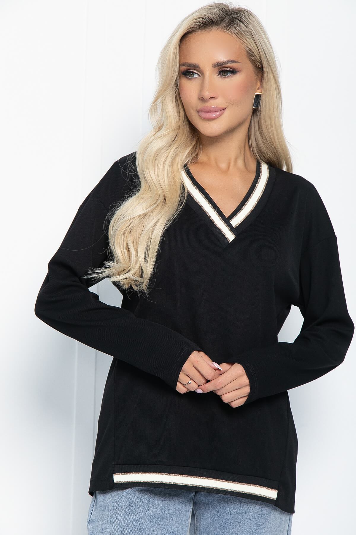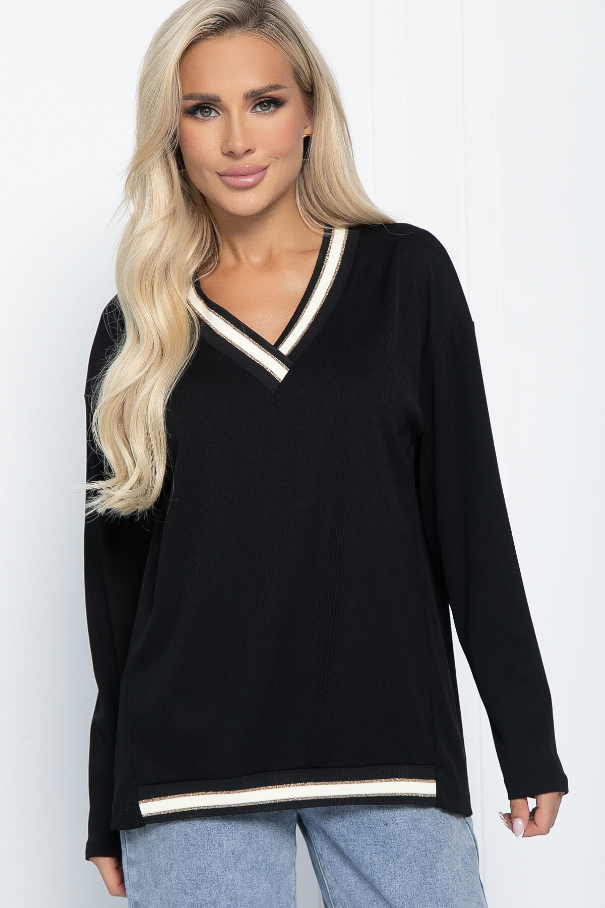 Очаровательный джемпер привнесет нотку шарма и легкости в ваш гардероб! Его уникальная особенность — привлекательный V-образный вырез, украшенный люрексной нитью. Низ изделия декорирован такой же вставкой, как на горловине, которая придает образу спортивный стиль. Джемпер имеет длинный втачной рукав. Такой джемпер отлично будет смотреться как с джинсами, так и с брюками.