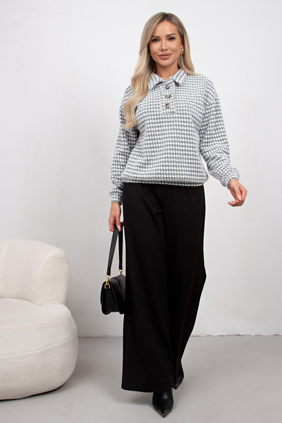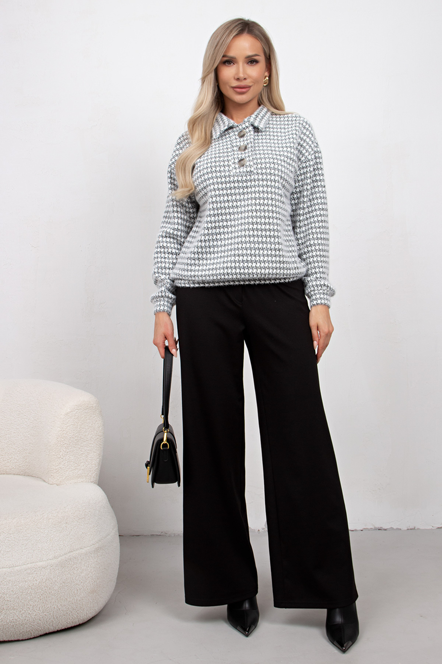 Комфортный джемпер свободного кроя из трикотажного полотна. Длинный втачной рукав со спущенным плечом присобран на манжету. Отложной воротник. Перед оформлен планкой с застежкой на петли и пуговицы. Низ на манжете.