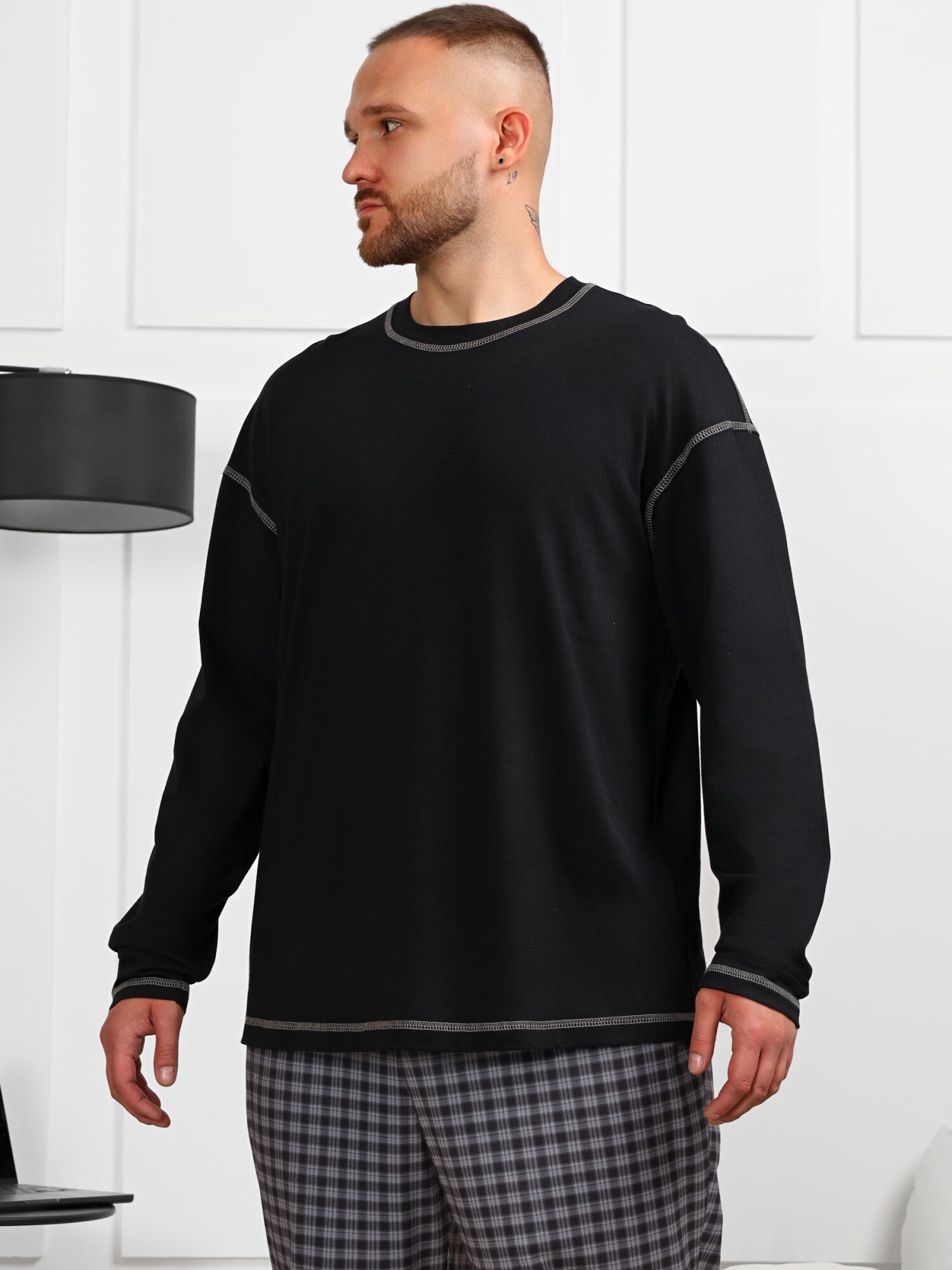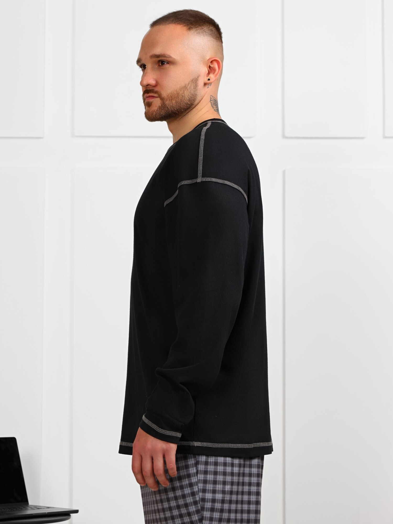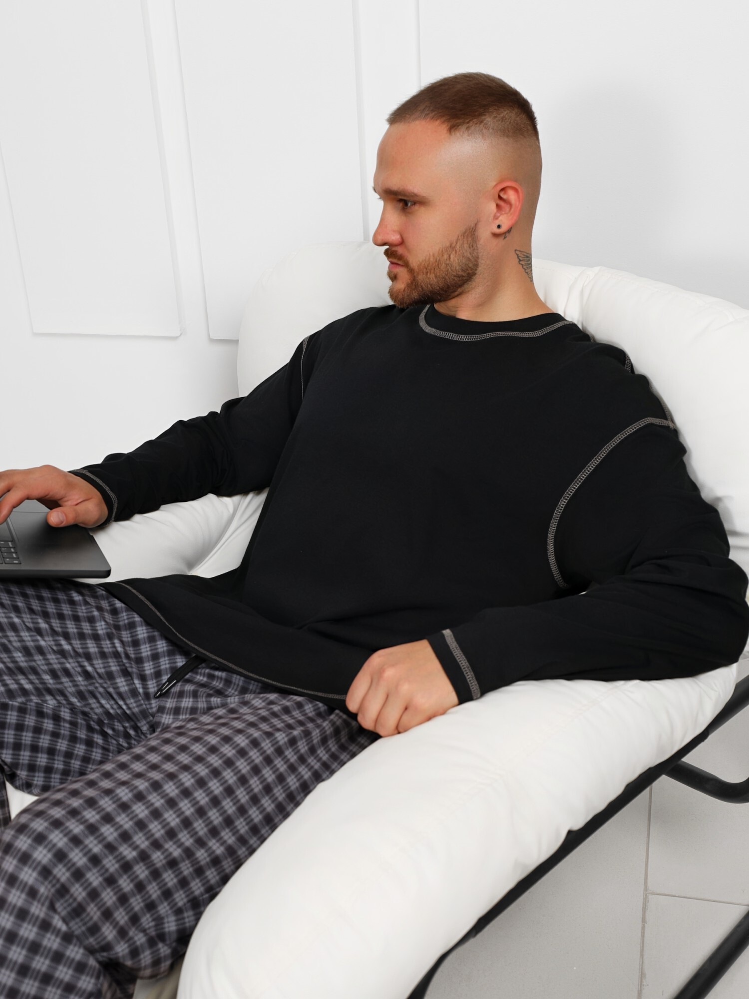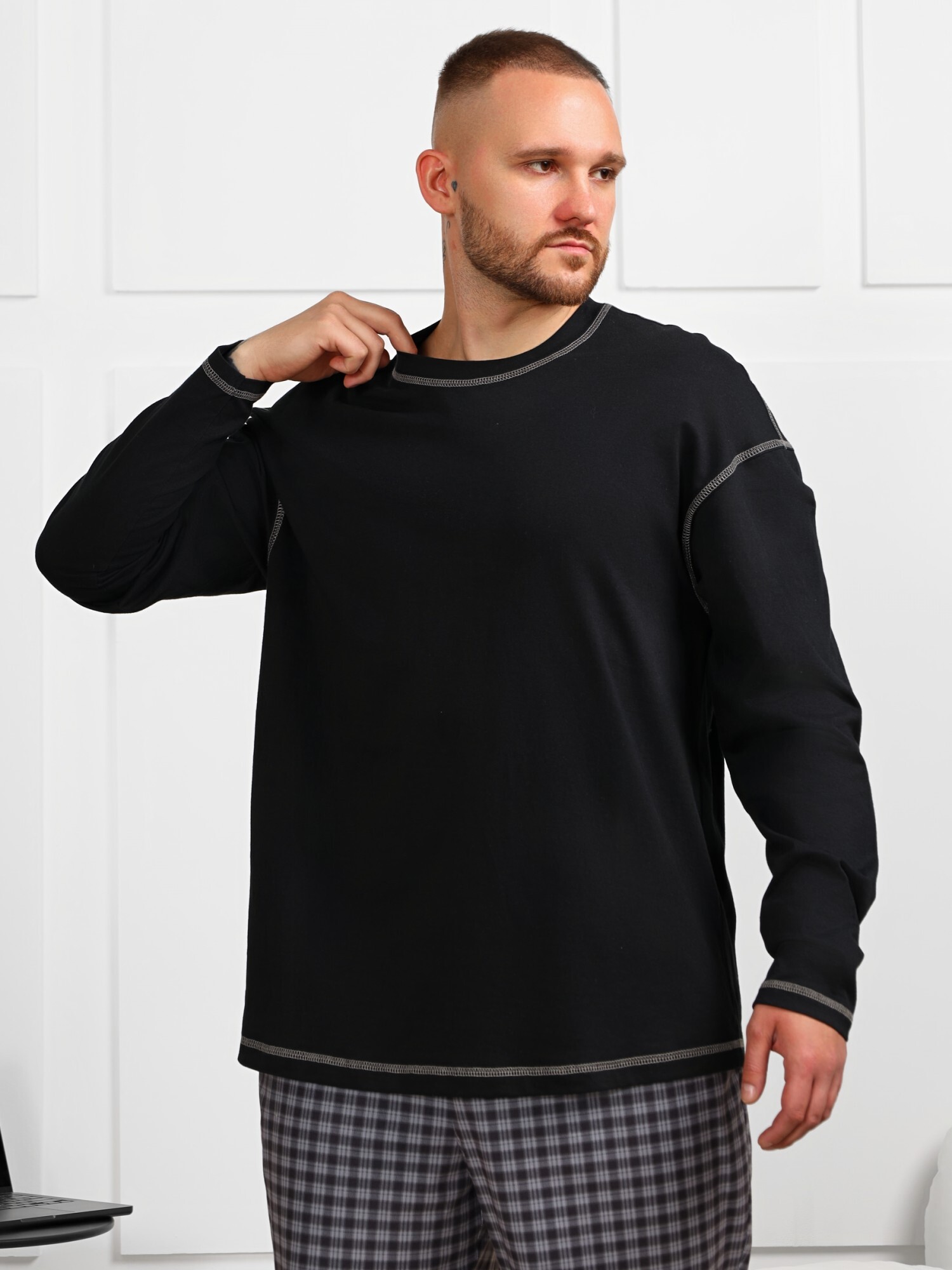 Джемпер мужской черный из трикотажного полотна кулирного переплетения. Модель со спущенной линией плеч, втачными рукавами, горловиной овальной формы, обработанной втачной планкой. В верхней части спинки - декоративная нашивка; по горловине, плечам, проймам, низу рукавов и низу джемпера - декоративные строчки контрастными нитками. Джемпер хорошо сочетается с брюками "Генри-1".