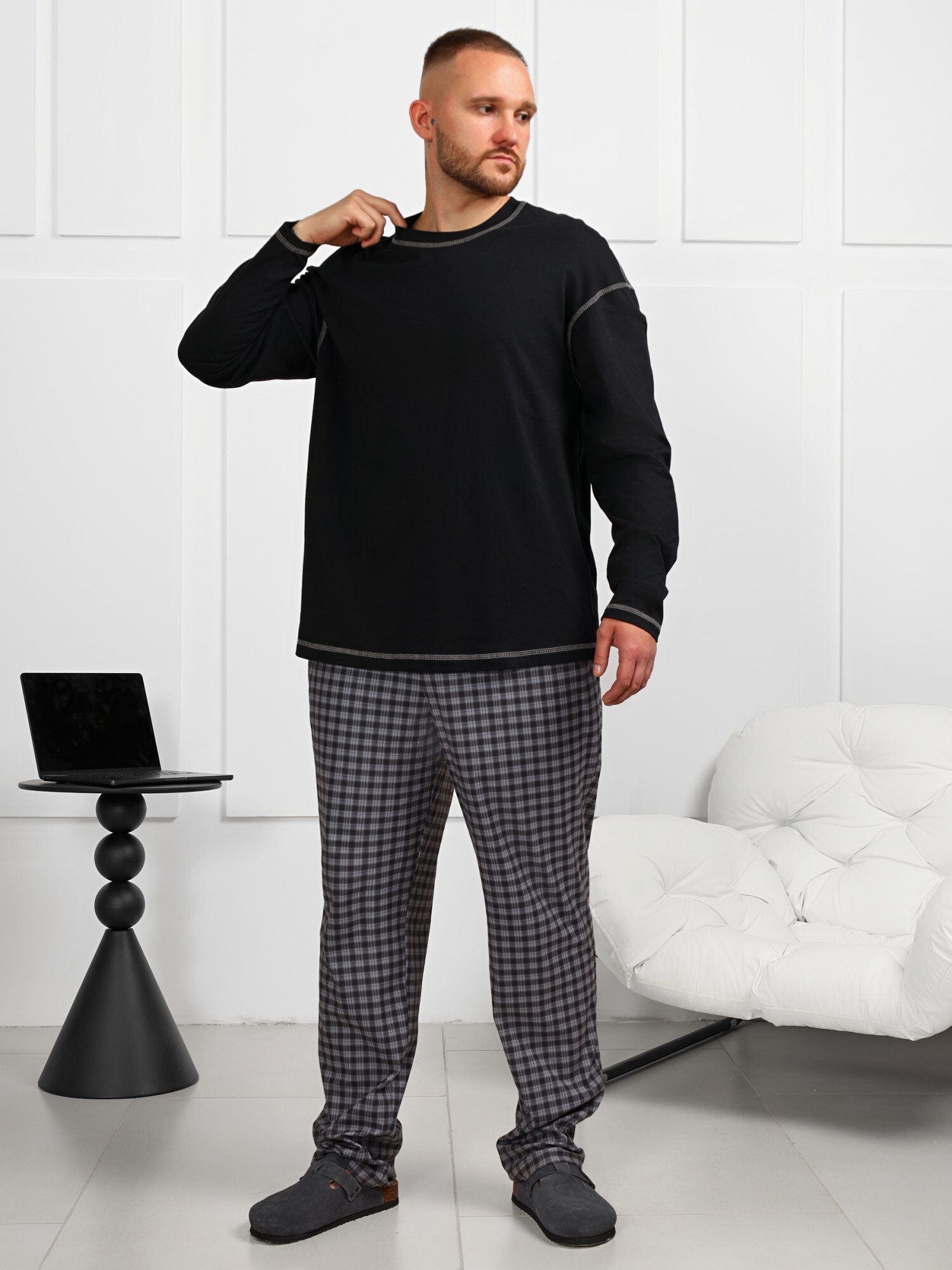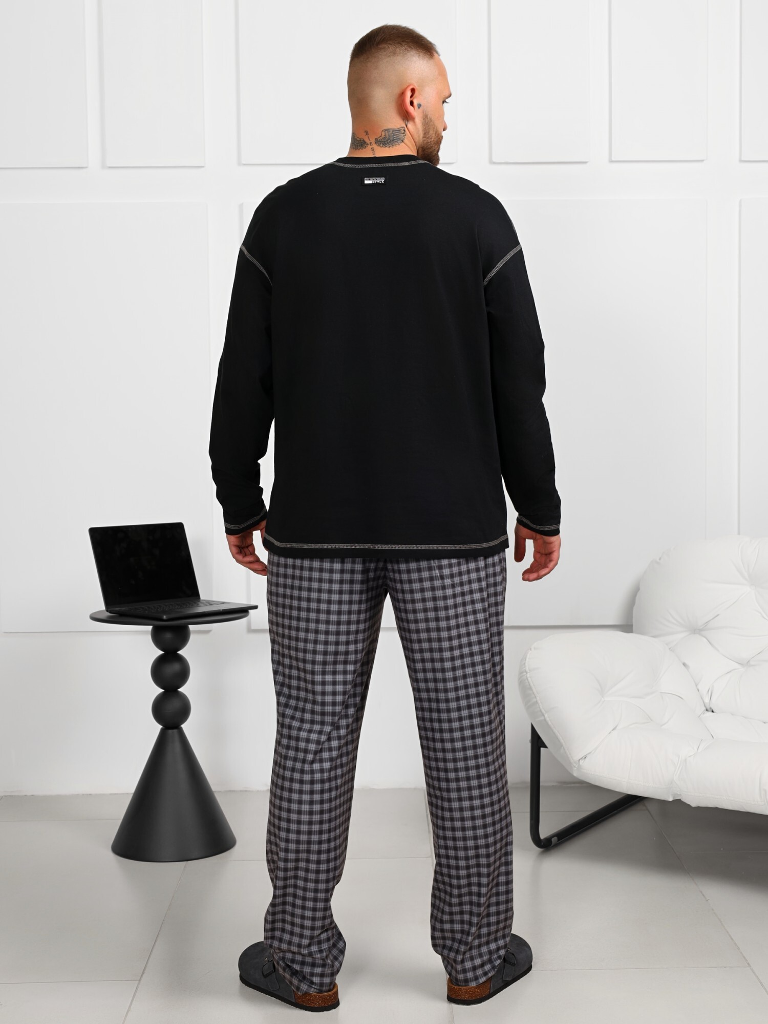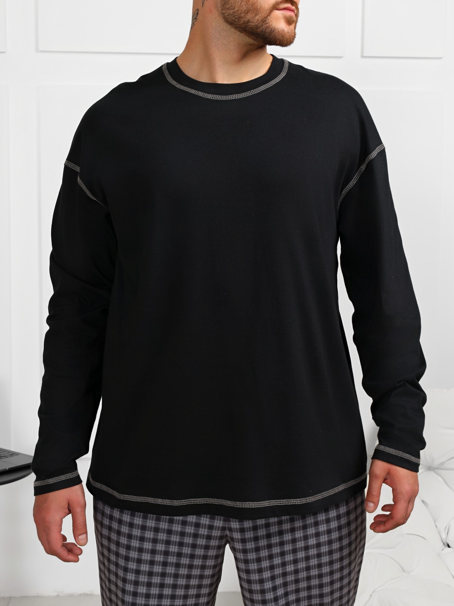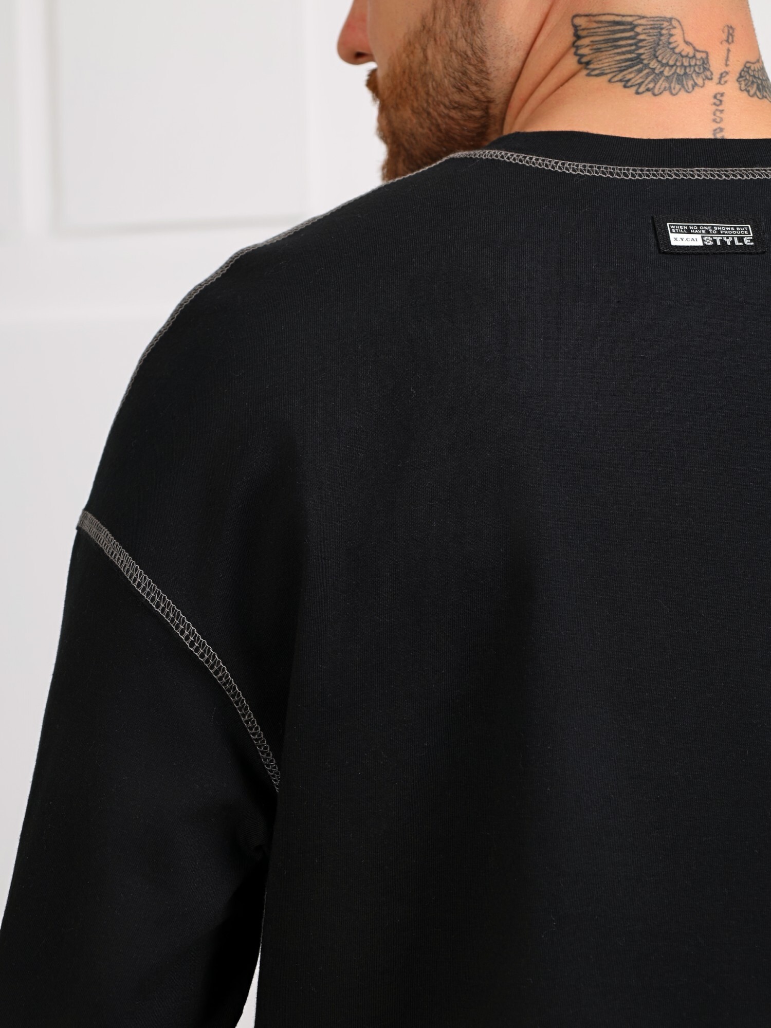 Джемпер мужской черный из трикотажного полотна кулирного переплетения. Модель со спущенной линией плеч, втачными рукавами, горловиной овальной формы, обработанной втачной планкой. В верхней части спинки - декоративная нашивка; по горловине, плечам, проймам, низу рукавов и низу джемпера - декоративные строчки контрастными нитками. Джемпер хорошо сочетается с брюками "Генри-1".