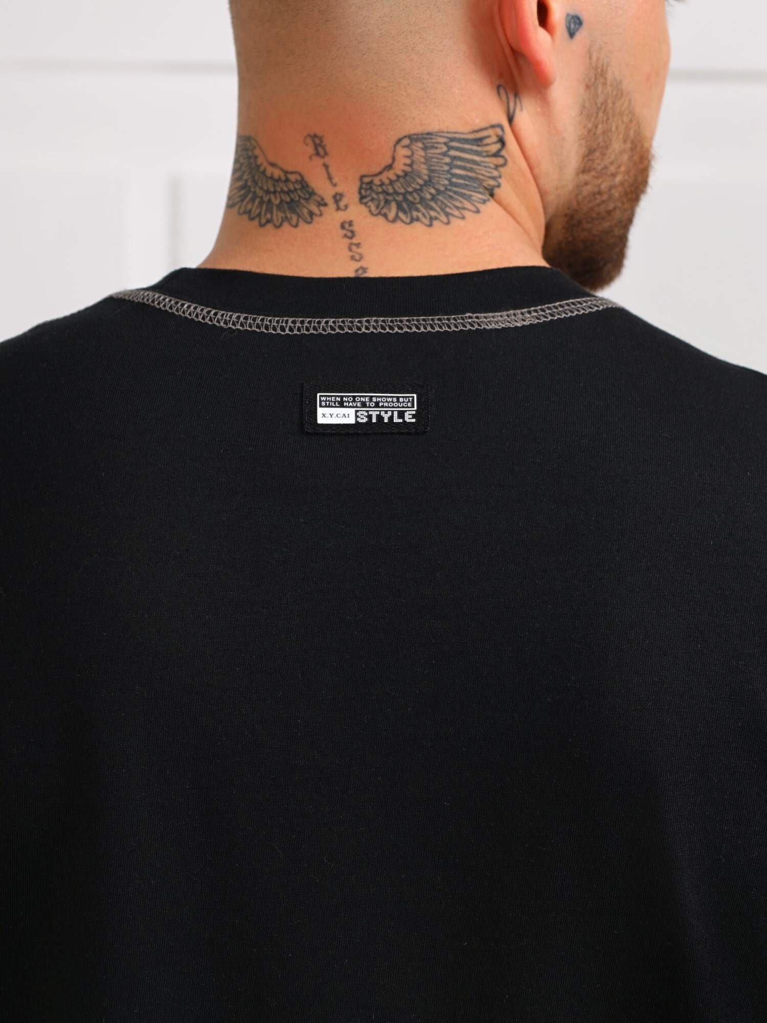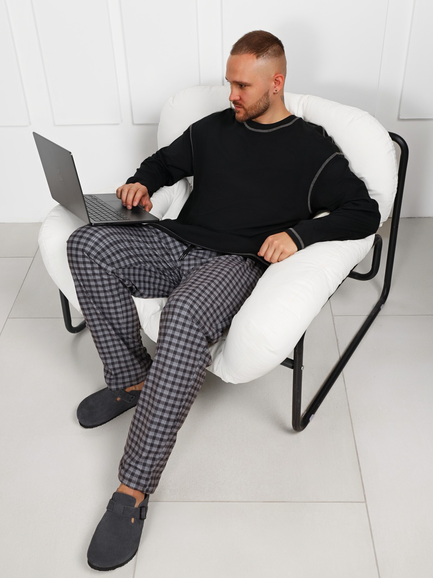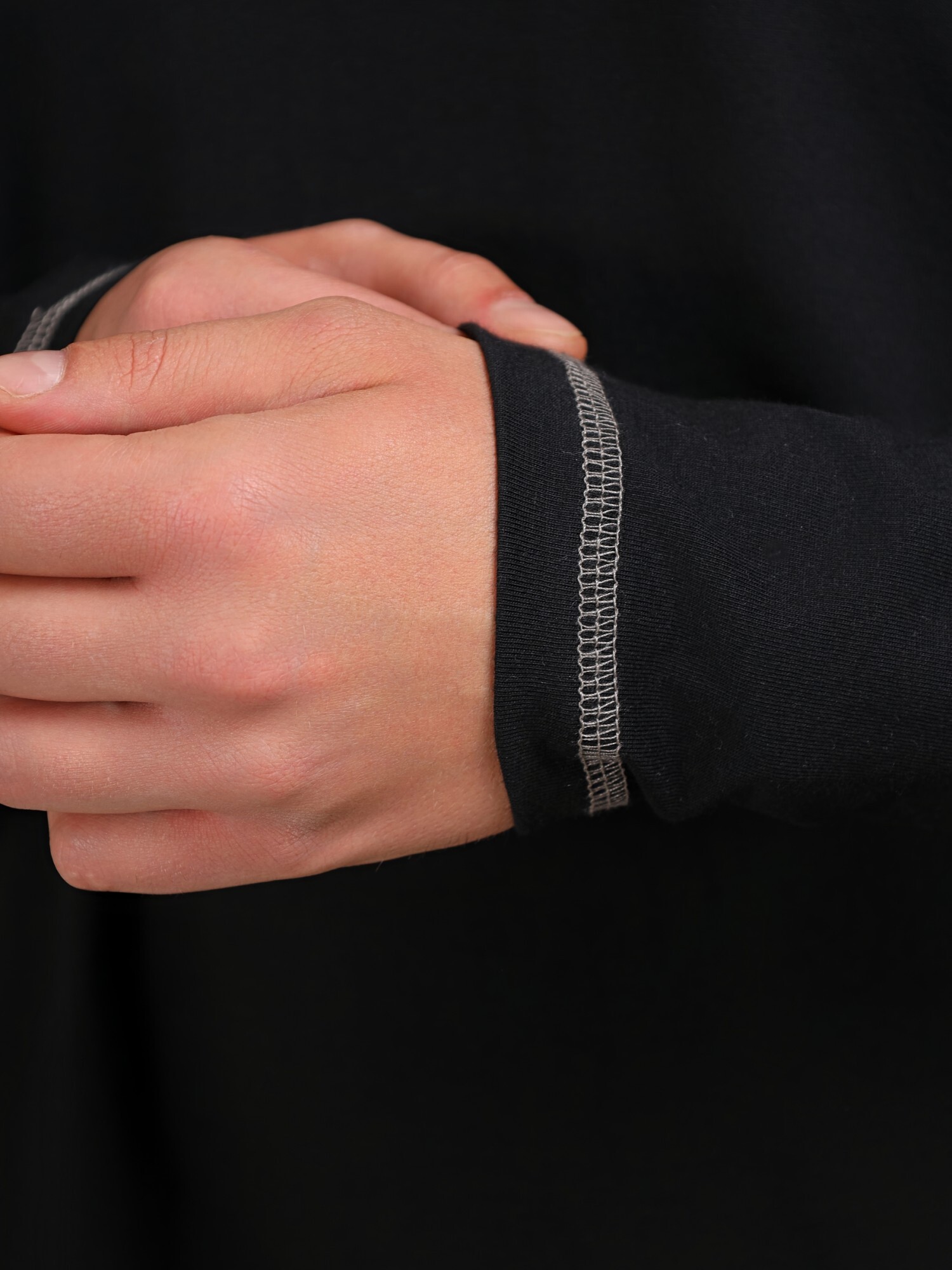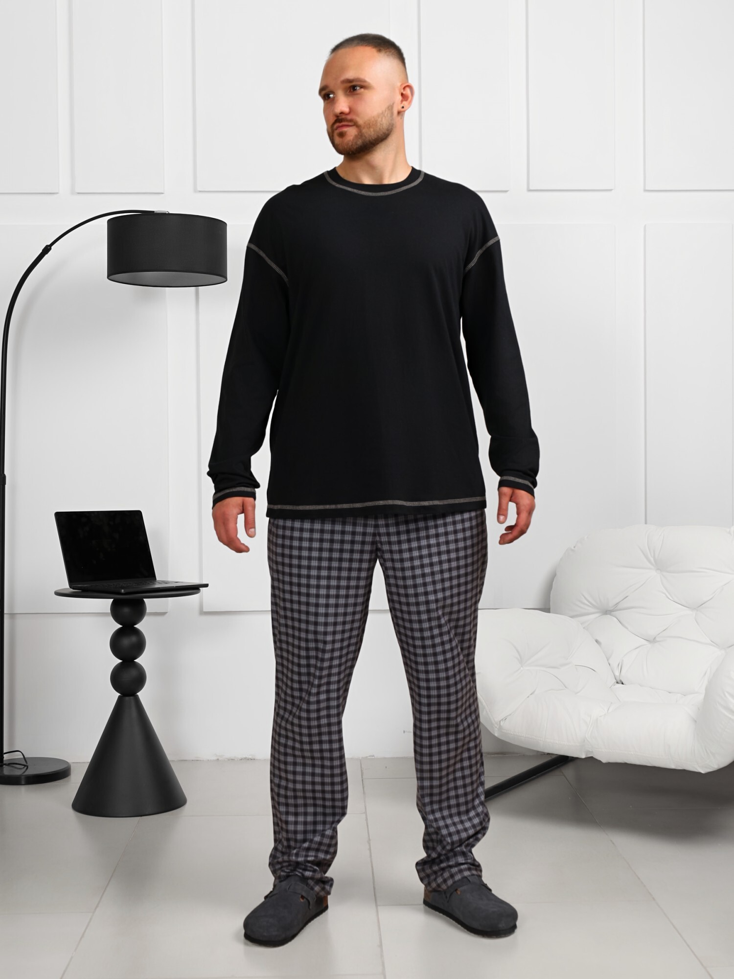 Джемпер мужской черный из трикотажного полотна кулирного переплетения. Модель со спущенной линией плеч, втачными рукавами, горловиной овальной формы, обработанной втачной планкой. В верхней части спинки - декоративная нашивка; по горловине, плечам, проймам, низу рукавов и низу джемпера - декоративные строчки контрастными нитками. Джемпер хорошо сочетается с брюками "Генри-1".