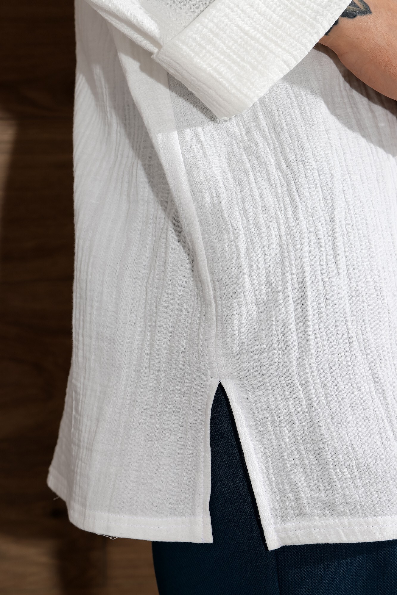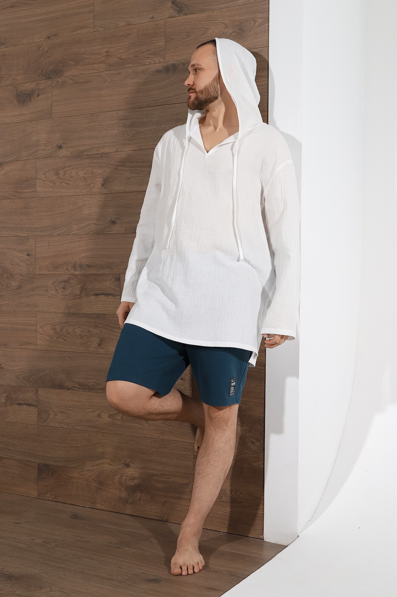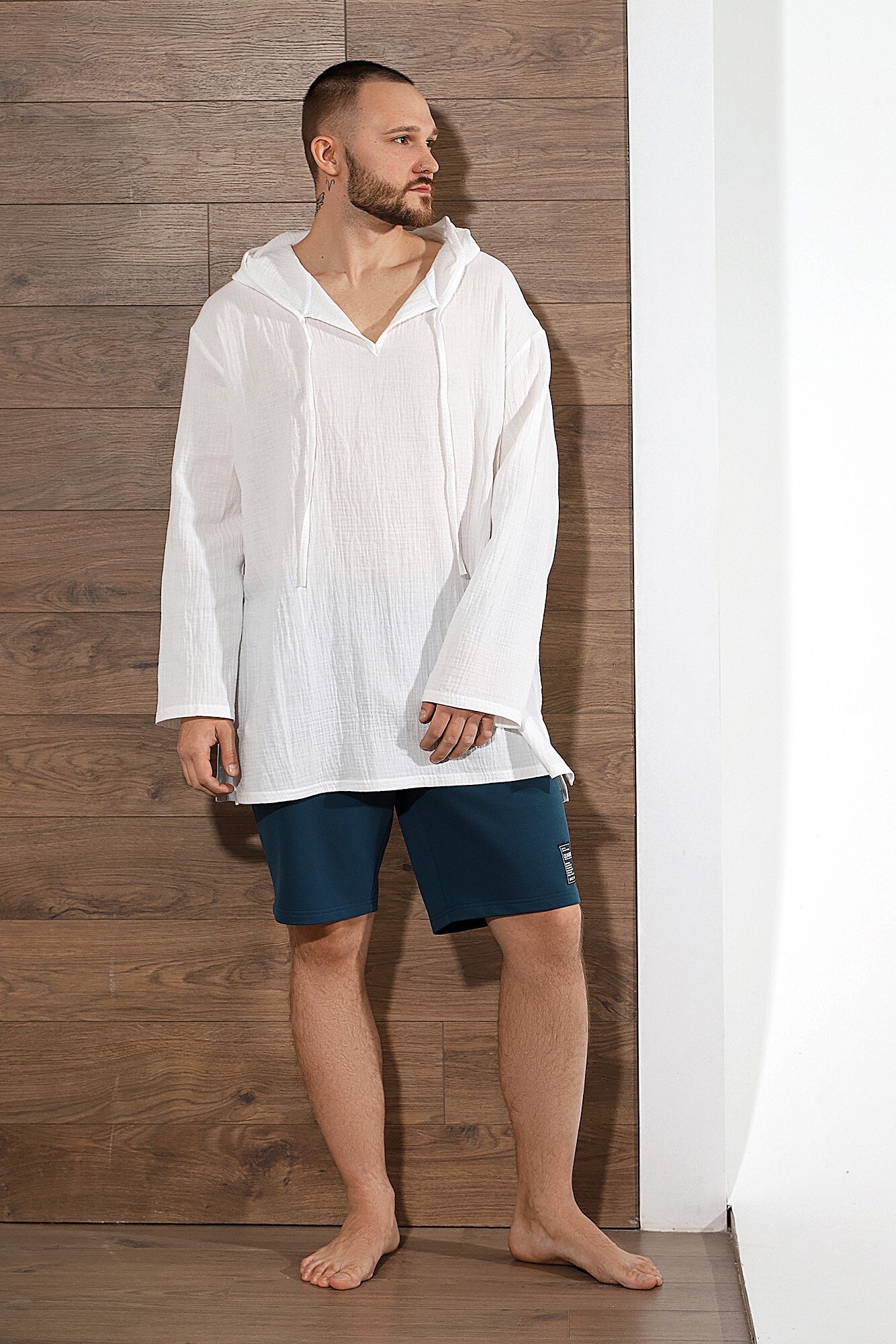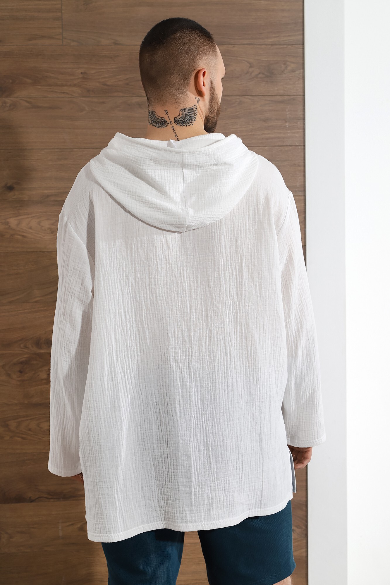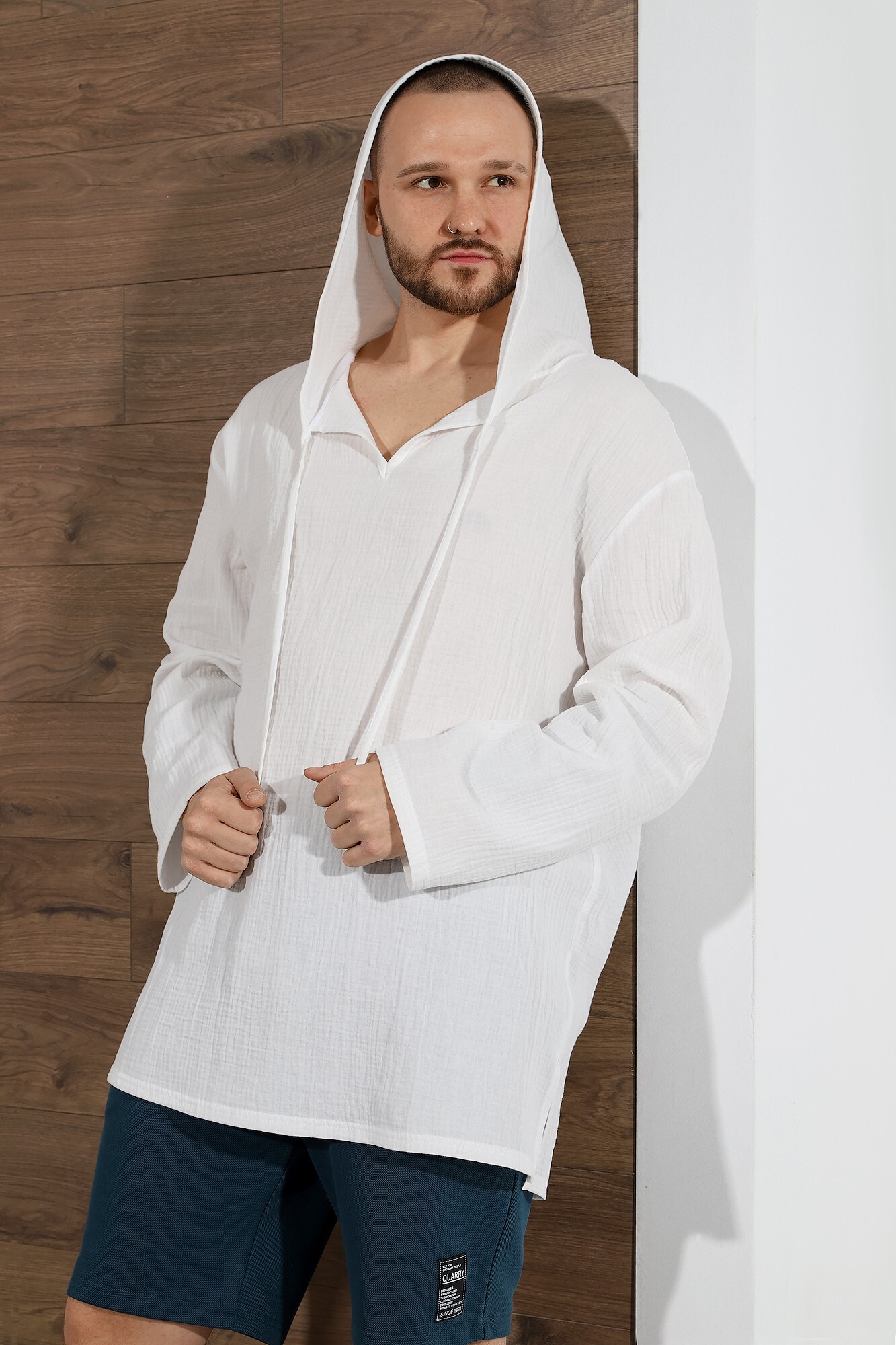 Джемпер мужской из серии Family Look, из муслина. Модель свободная, с капюшоном, с завязками по горловине, с разрезами по низу боковых швов.