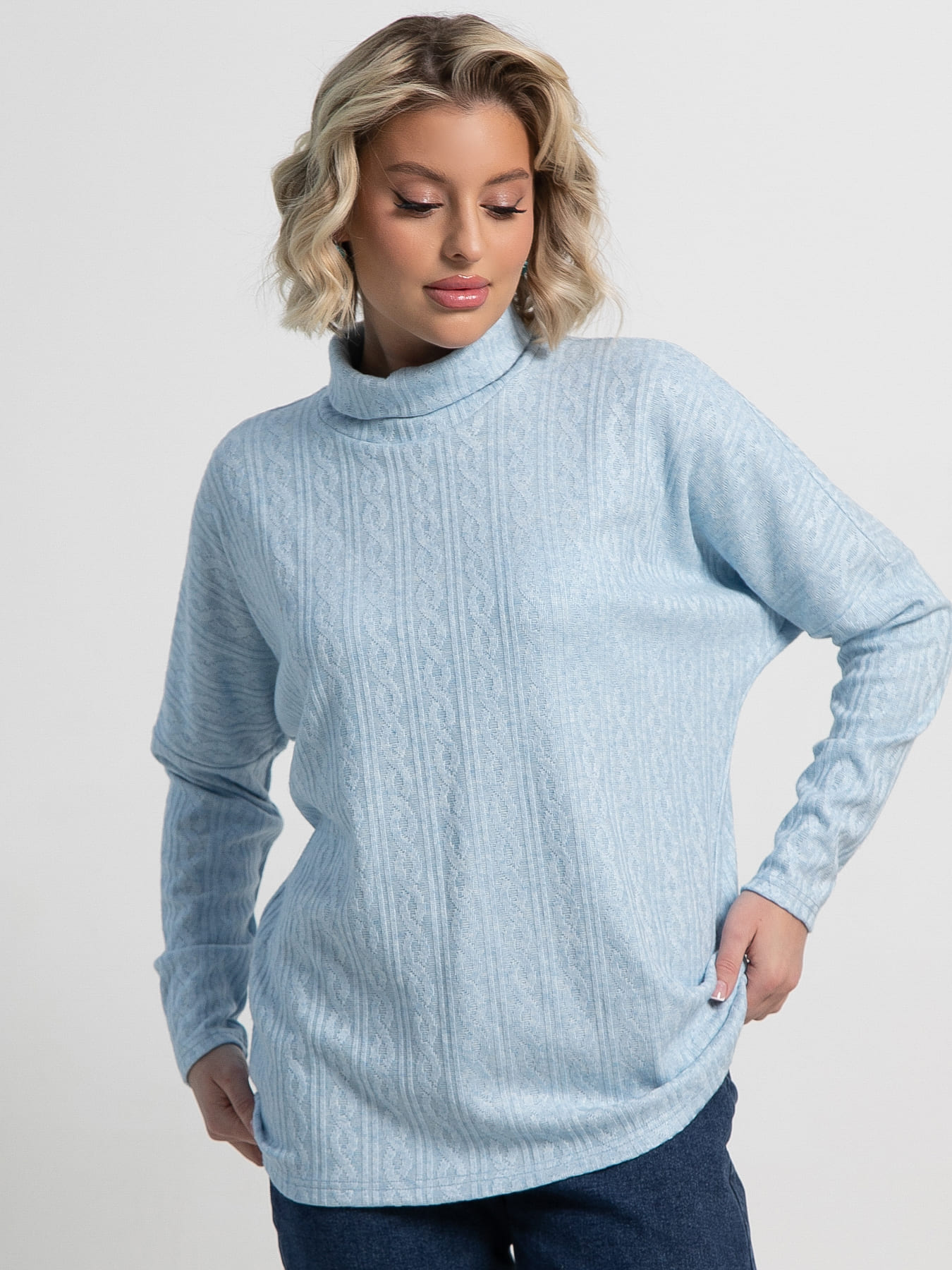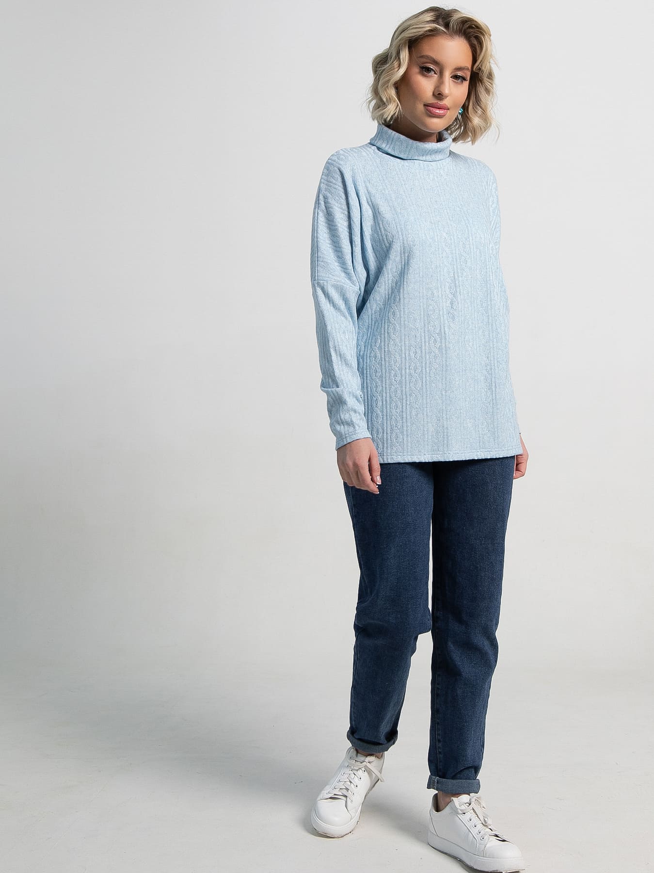 Женский джемпер свободного силуэта, выполненный из мягкого вязаного трикотажа. Округлая горловина, оформленная воротником-хомутом, создает стильный и комфортный образ. Идеальный выбор для уютных повседневных образов, подчеркнет вашу женственность и добавит уюта в ваш гардероб.