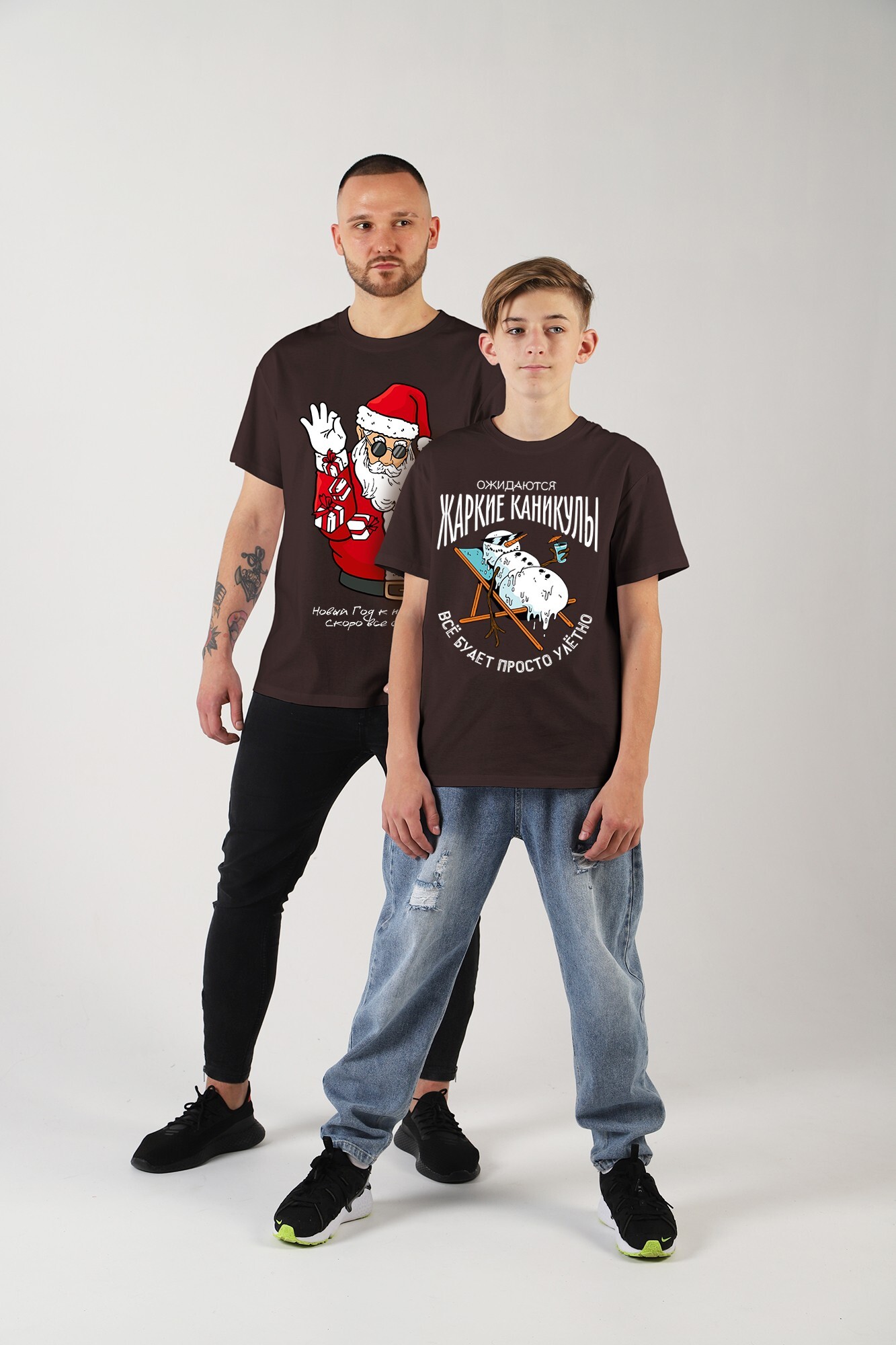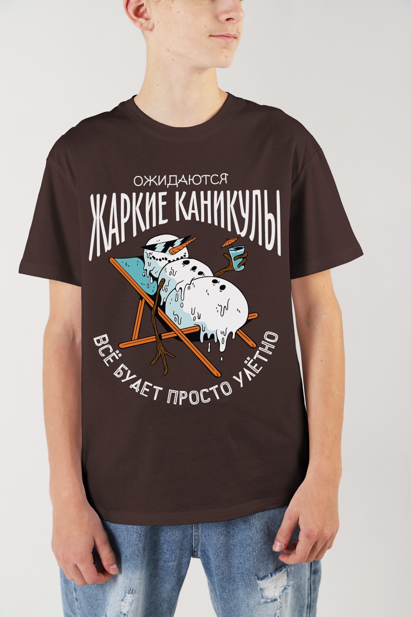 Футболка для мальчика классического покроя: с короткими втачными рукавами, горловиной овальной формы, обработанной втачной планкой, и принтом в центре переда, выполненным в технике шелкографии. По шву втачивания планки в горловину настрочена отделочная строчка на двухигольной машине. неижние срезы рукавов и изделия обработаны подгибкой.