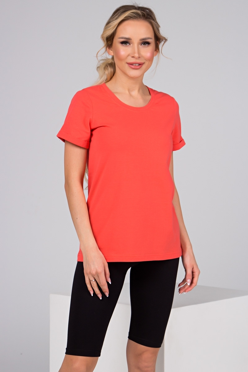 Стильная футболка прямого силуэта из однотонного трикотажного полотна. Короткий втачной рукав оканчивается манжетой с отворотом. Круглая горловина. Низ прямой, без разрезов.