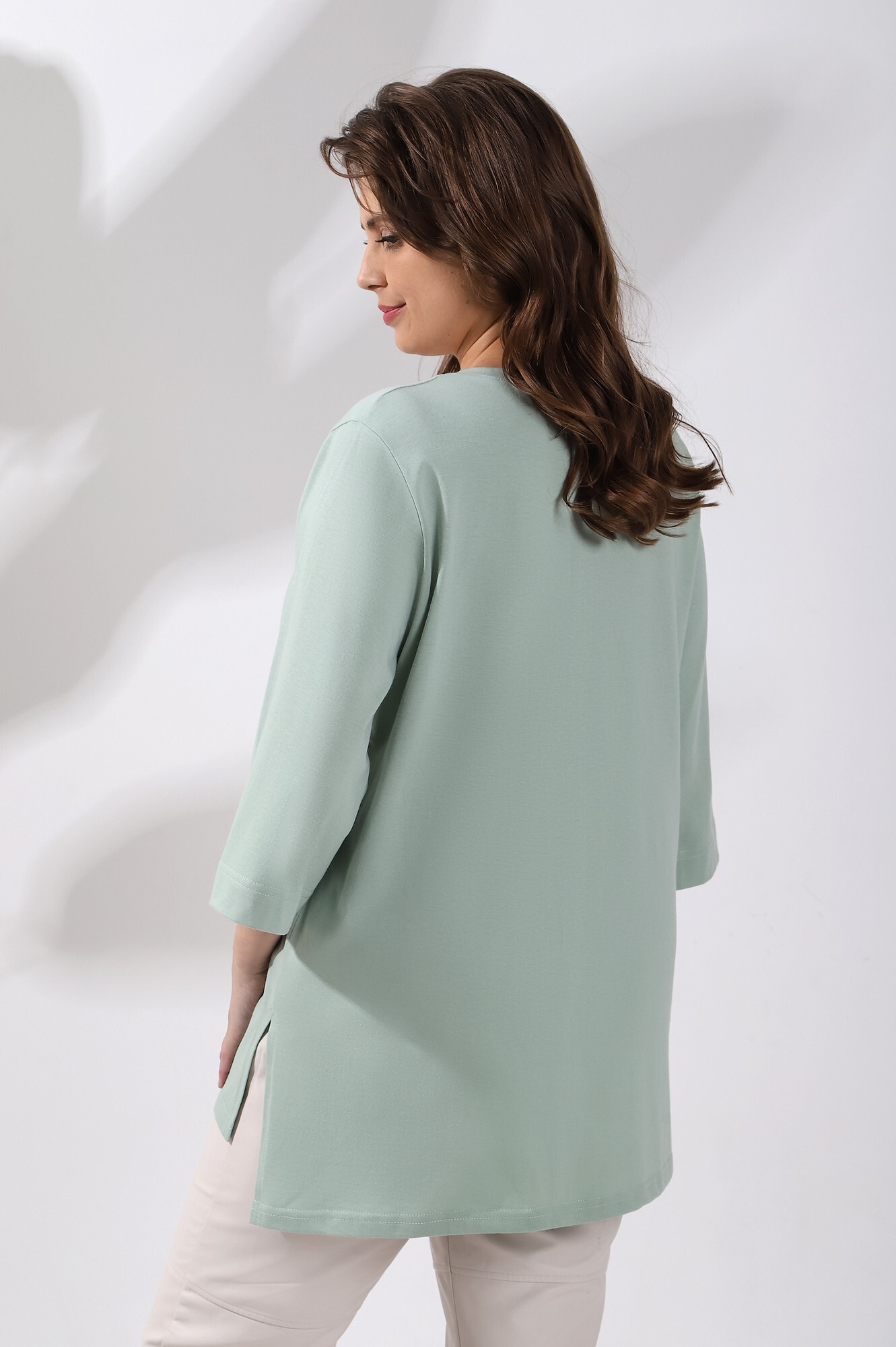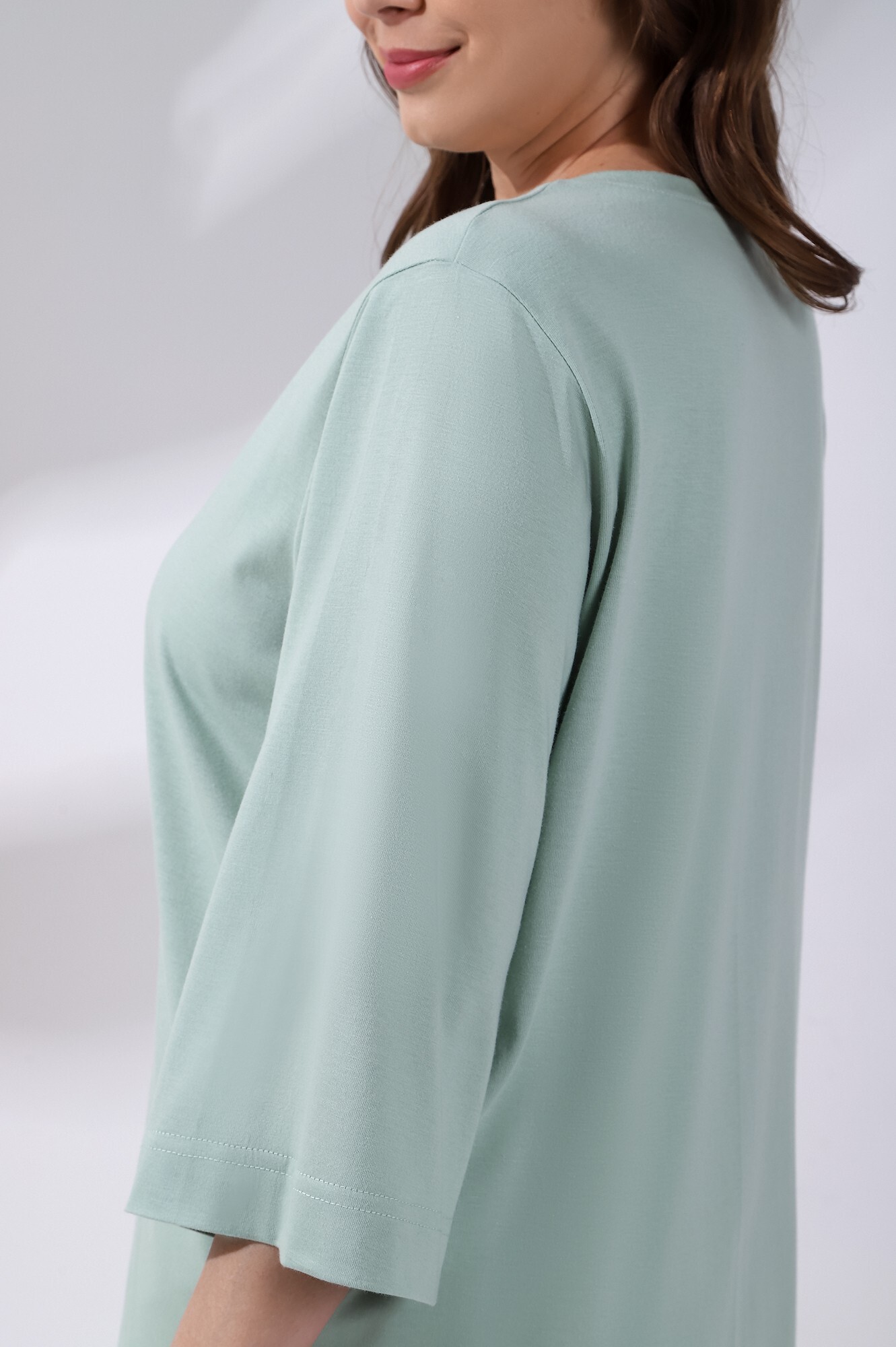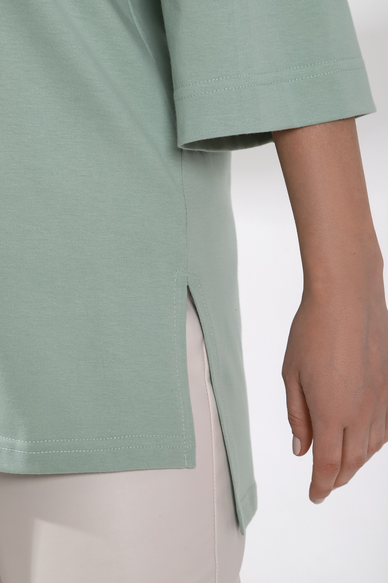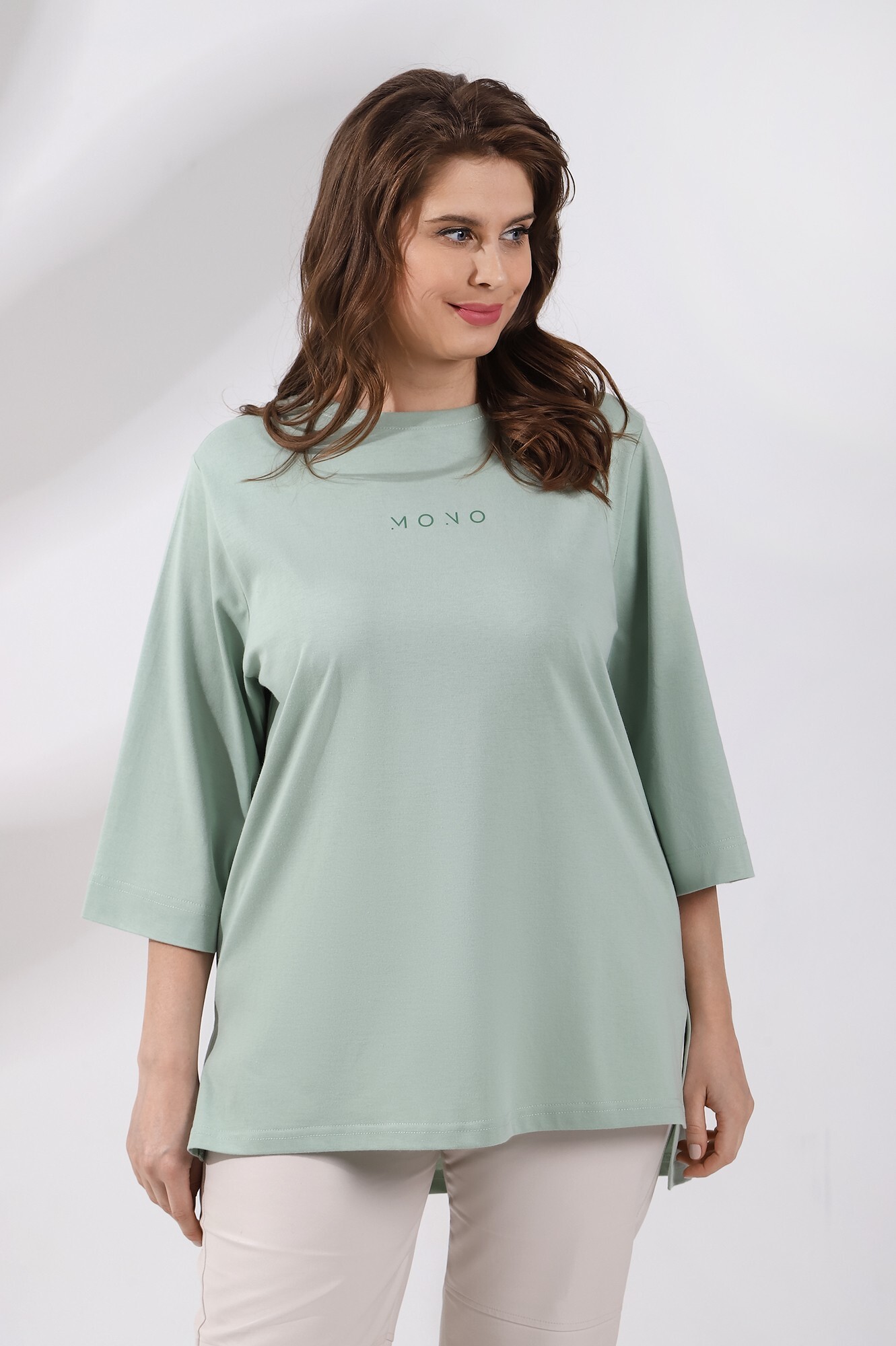 Футболка женская из гладкокрашенного трикотажного полотна «кулирка с лайкрой», свободного покроя, со спущенным плечом и втачными рукавами длиной до локтя, горловиной овальной формы, обработанной втачной планкой, на полочке выполнена печать в технике «шелкографии». В нижней части боковых швов – разрезы.