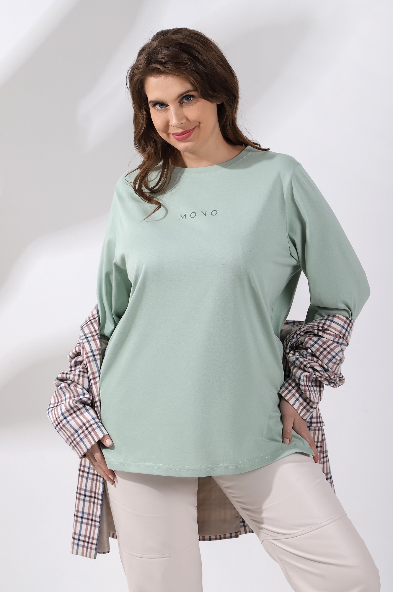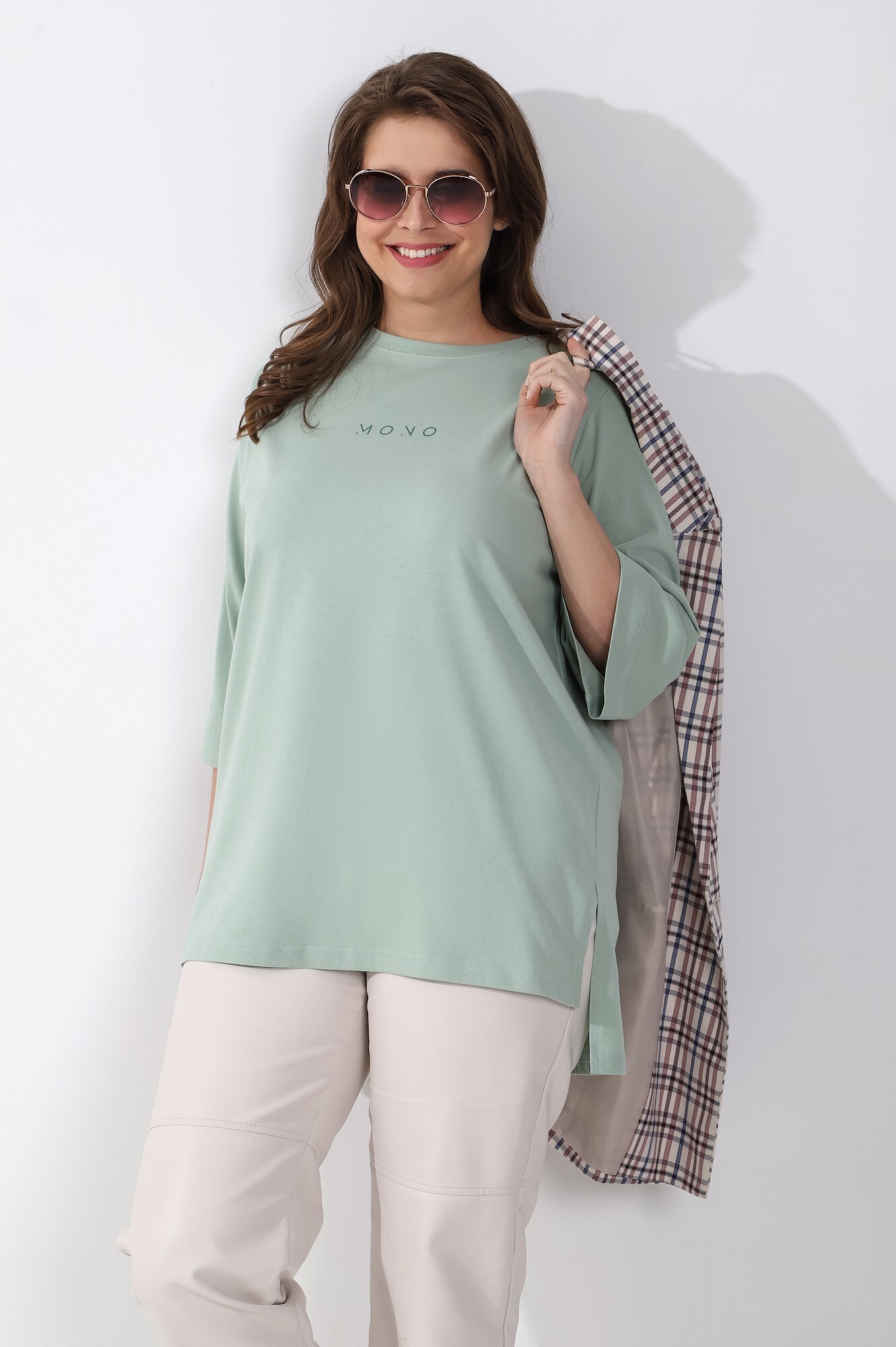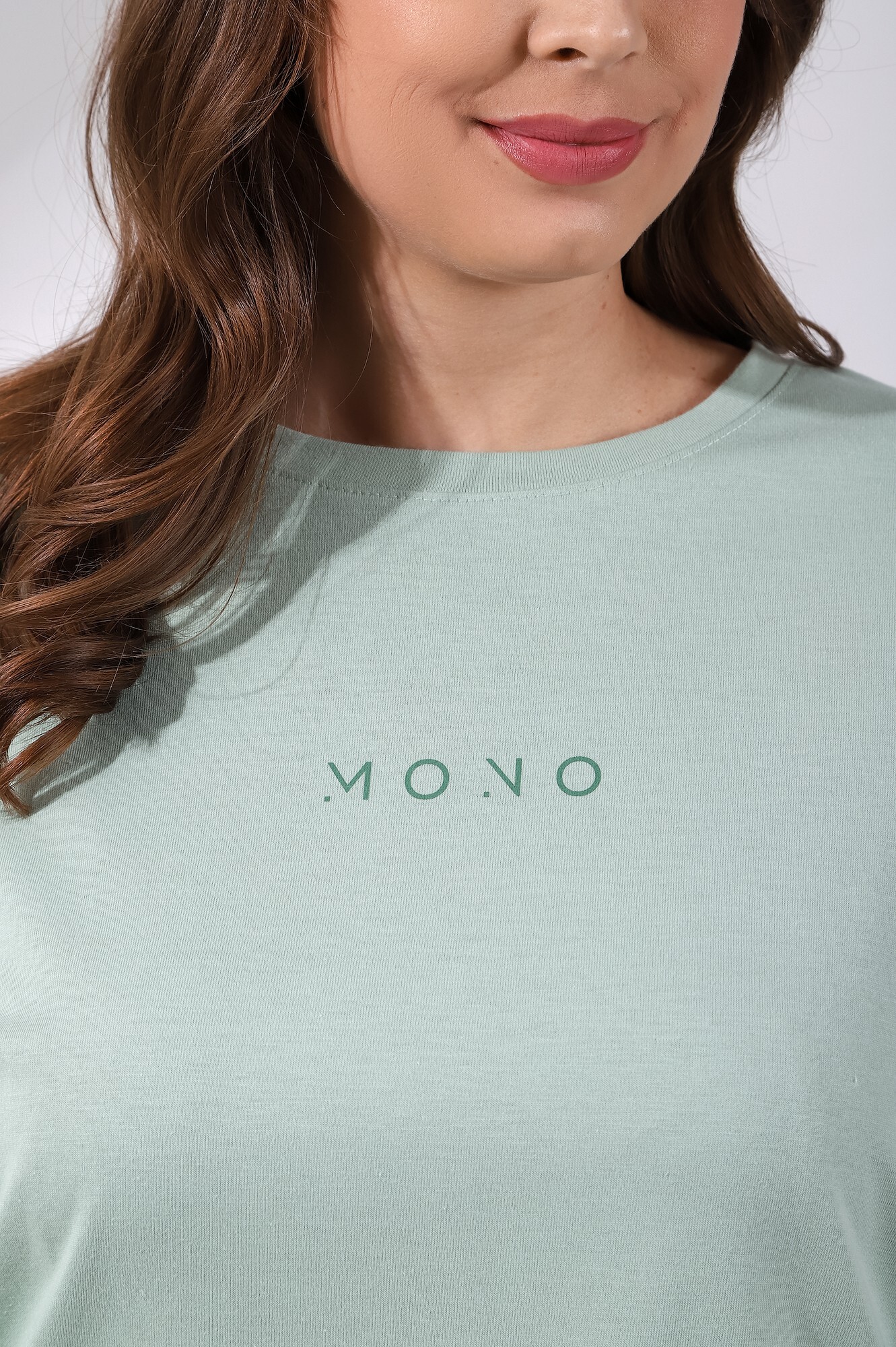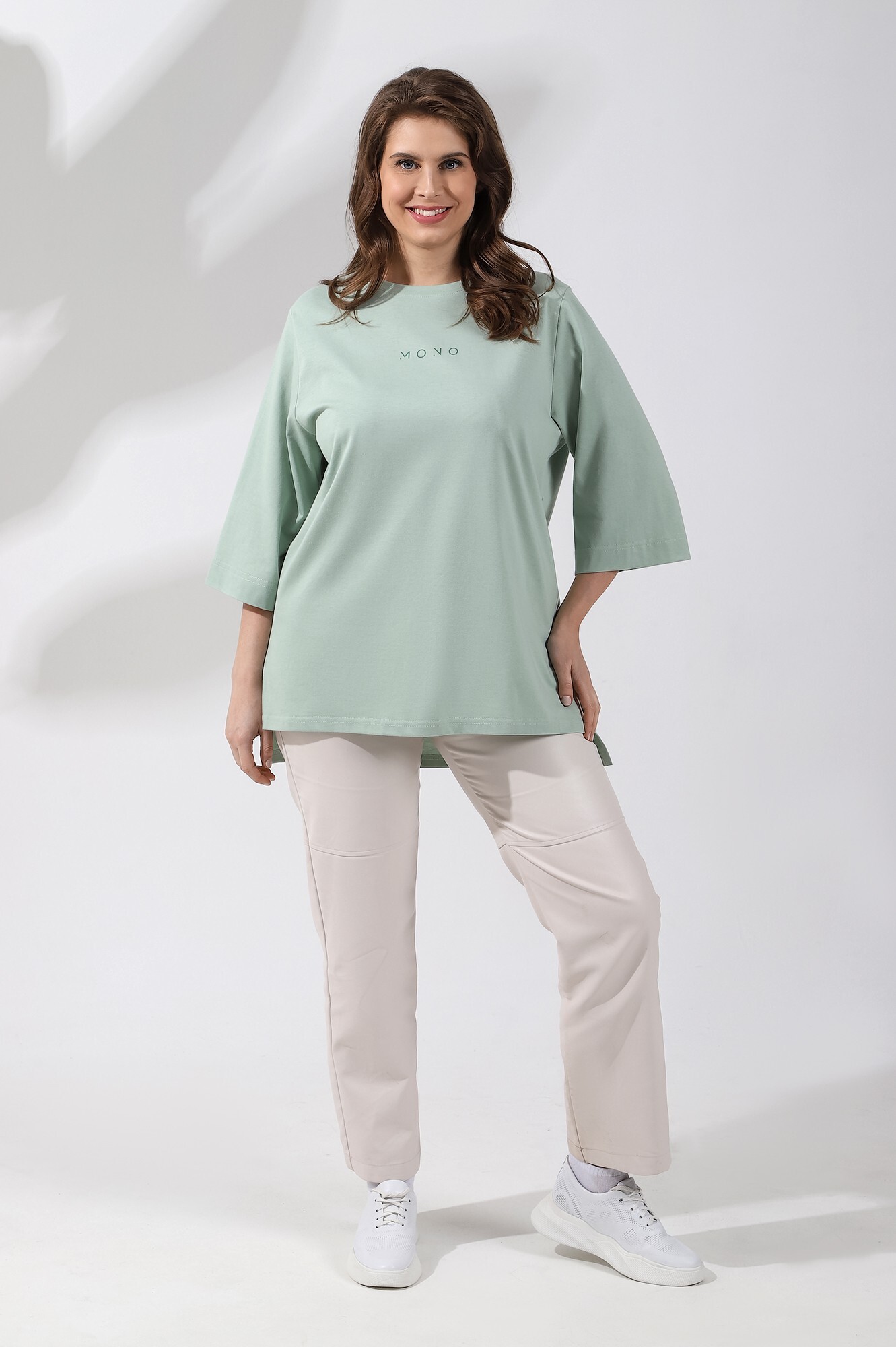 Футболка женская из гладкокрашенного трикотажного полотна «кулирка с лайкрой», свободного покроя, со спущенным плечом и втачными рукавами длиной до локтя, горловиной овальной формы, обработанной втачной планкой, на полочке выполнена печать в технике «шелкографии». В нижней части боковых швов – разрезы.