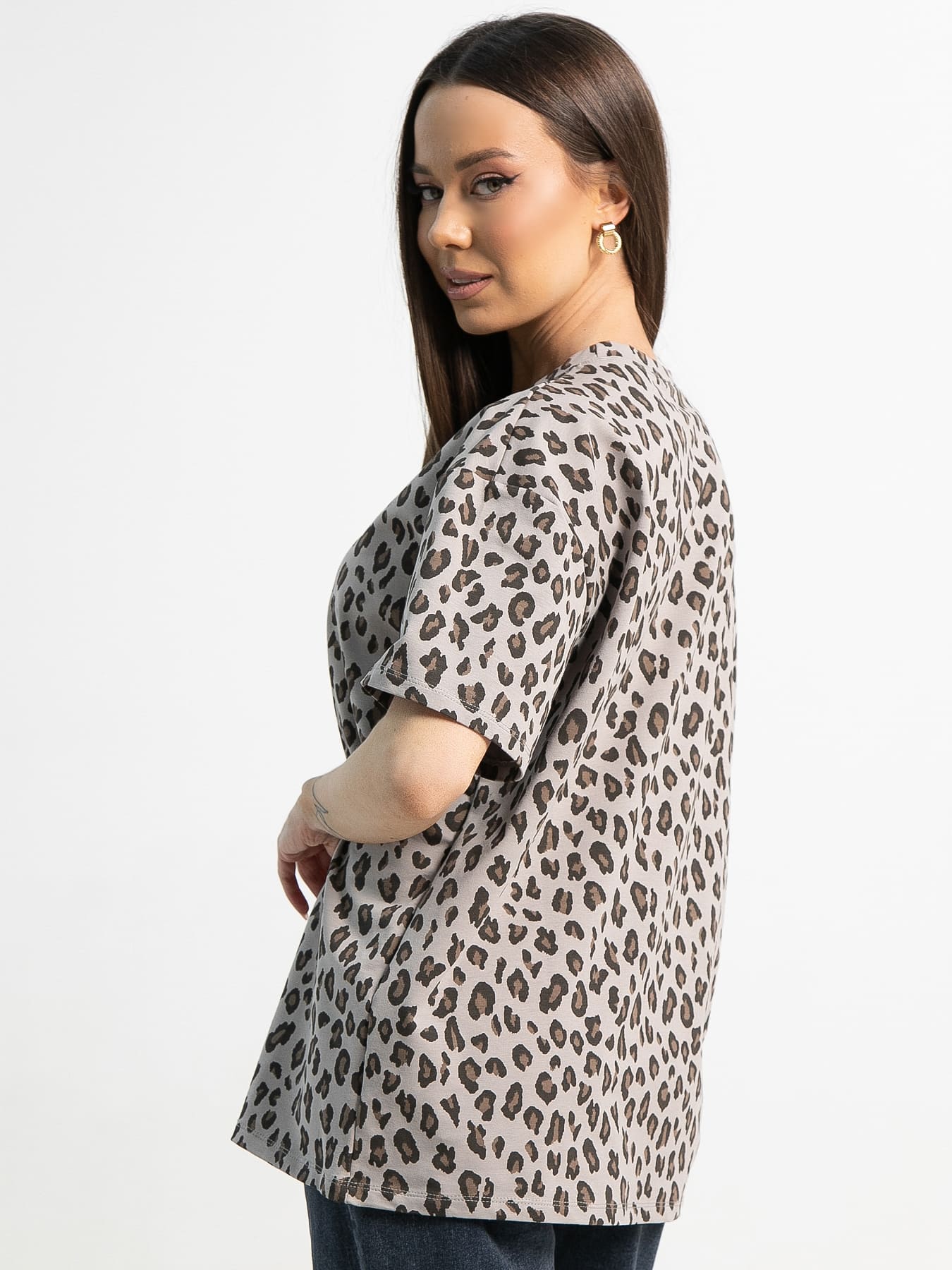 Создайте яркий и запоминающийся образ с помощью этой стильной футболки. Леопардовый принт придает ей дерзость и харизму, делая вас центром внимания. Универсальные бежево-серые цвета позволяют сочетать изделие с различными элементами гардероба, обеспечивая комфорт и стиль в любых ситуациях.