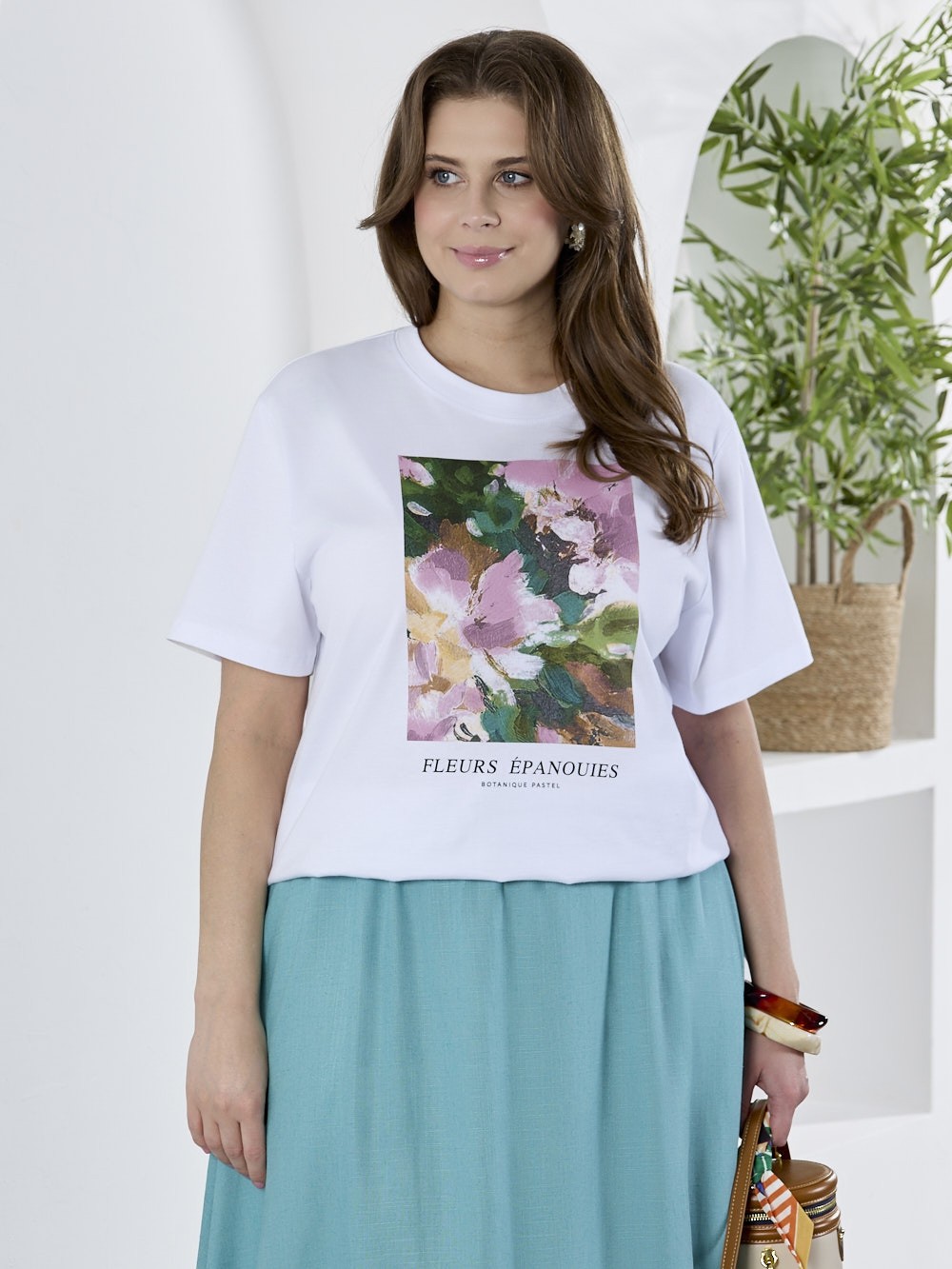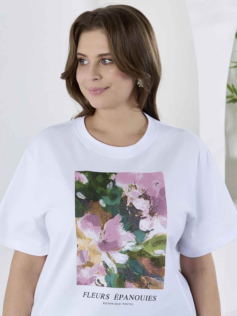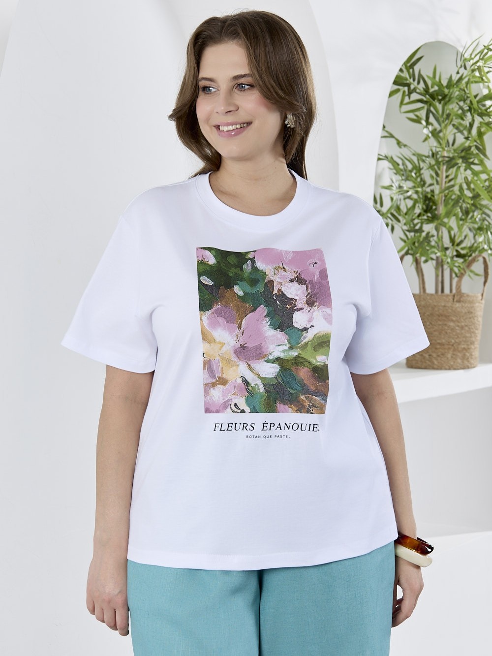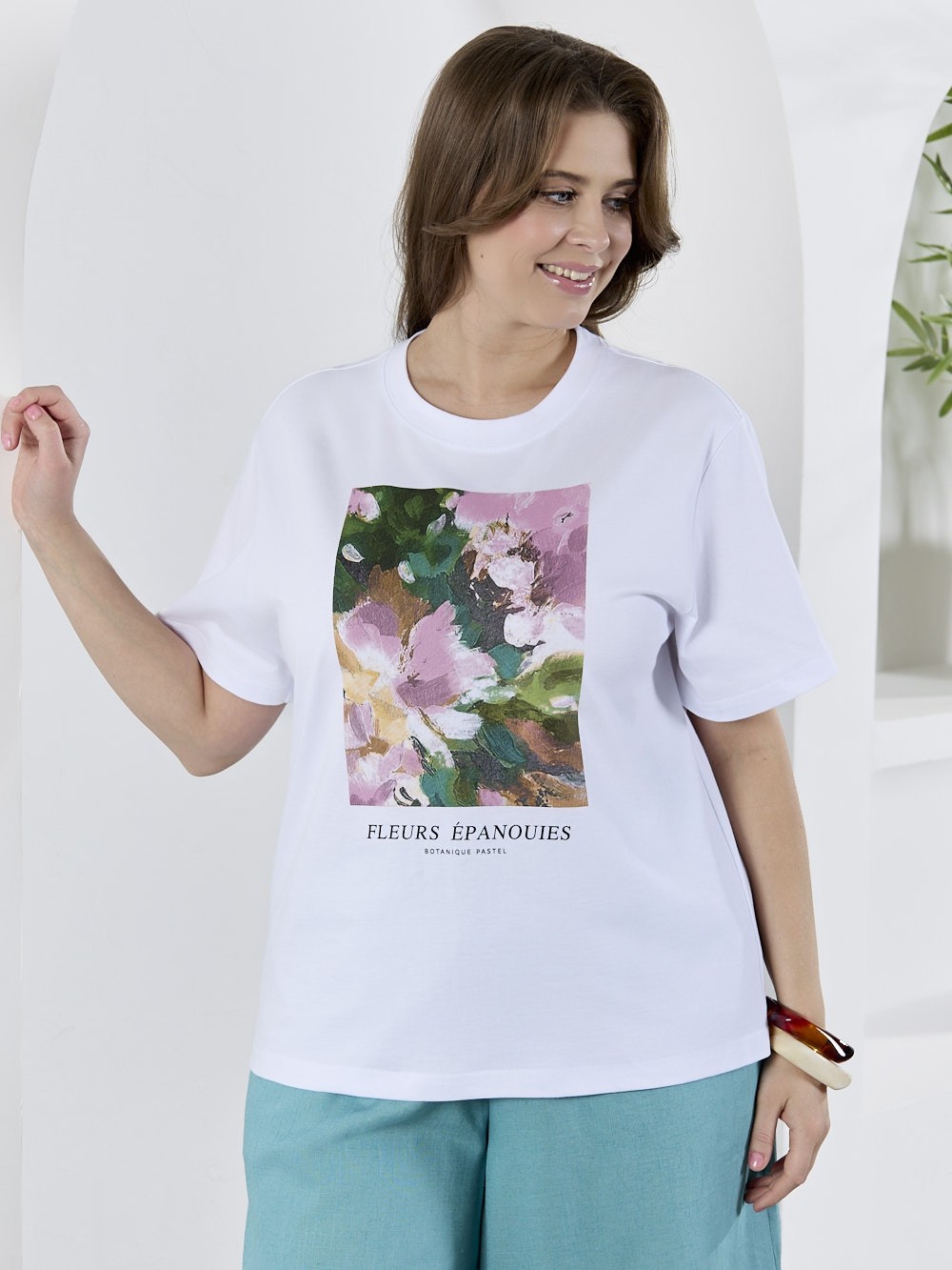 Футболка женская из гладкокрашеного трикотажного полотна «кулирка с лайкрой», полуприталенного силуэта, с короткими втачными рукавами. На полочке выполнена печать в технике «шелкографии». Горловина овальной формы обработана втачной планкой с отделочной строчкой по шву притачивания.