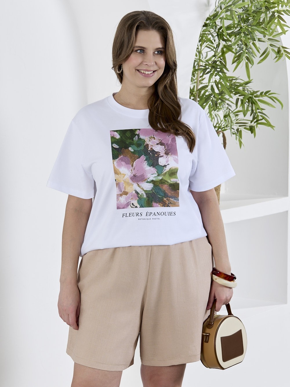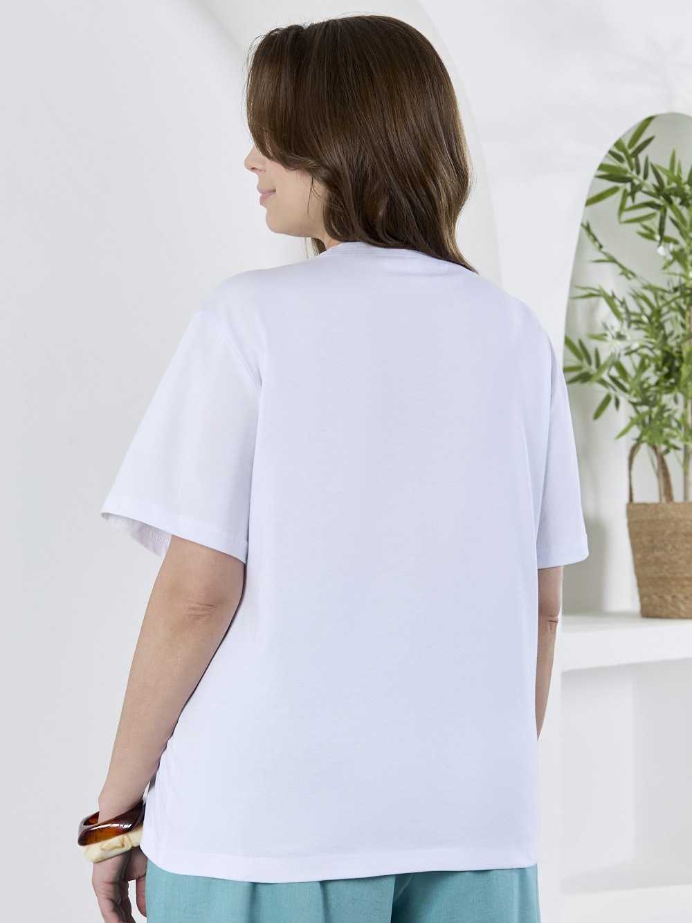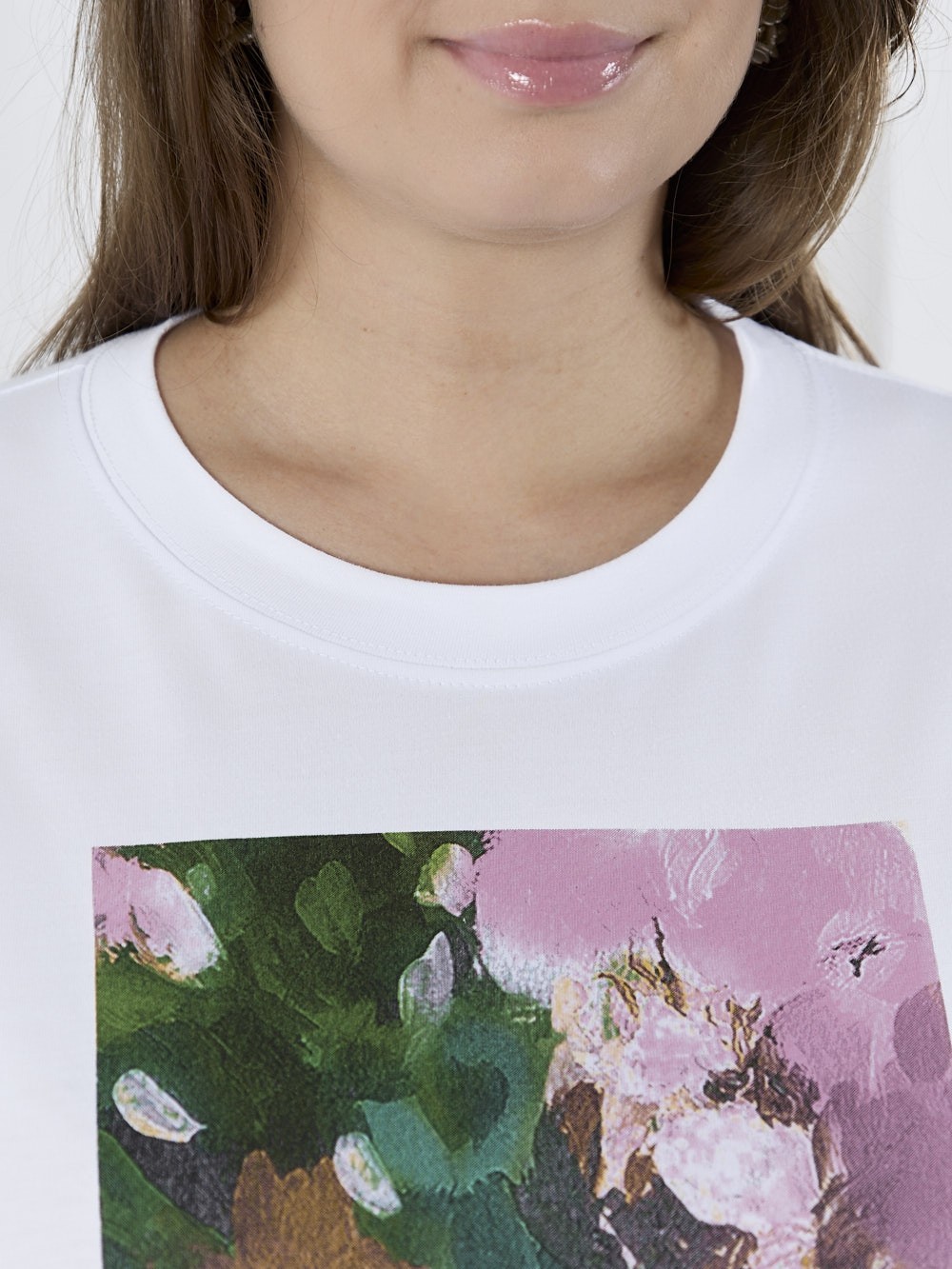 Футболка женская из гладкокрашеного трикотажного полотна «кулирка с лайкрой», полуприталенного силуэта, с короткими втачными рукавами. На полочке выполнена печать в технике «шелкографии». Горловина овальной формы обработана втачной планкой с отделочной строчкой по шву притачивания.