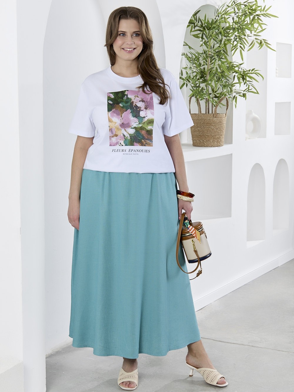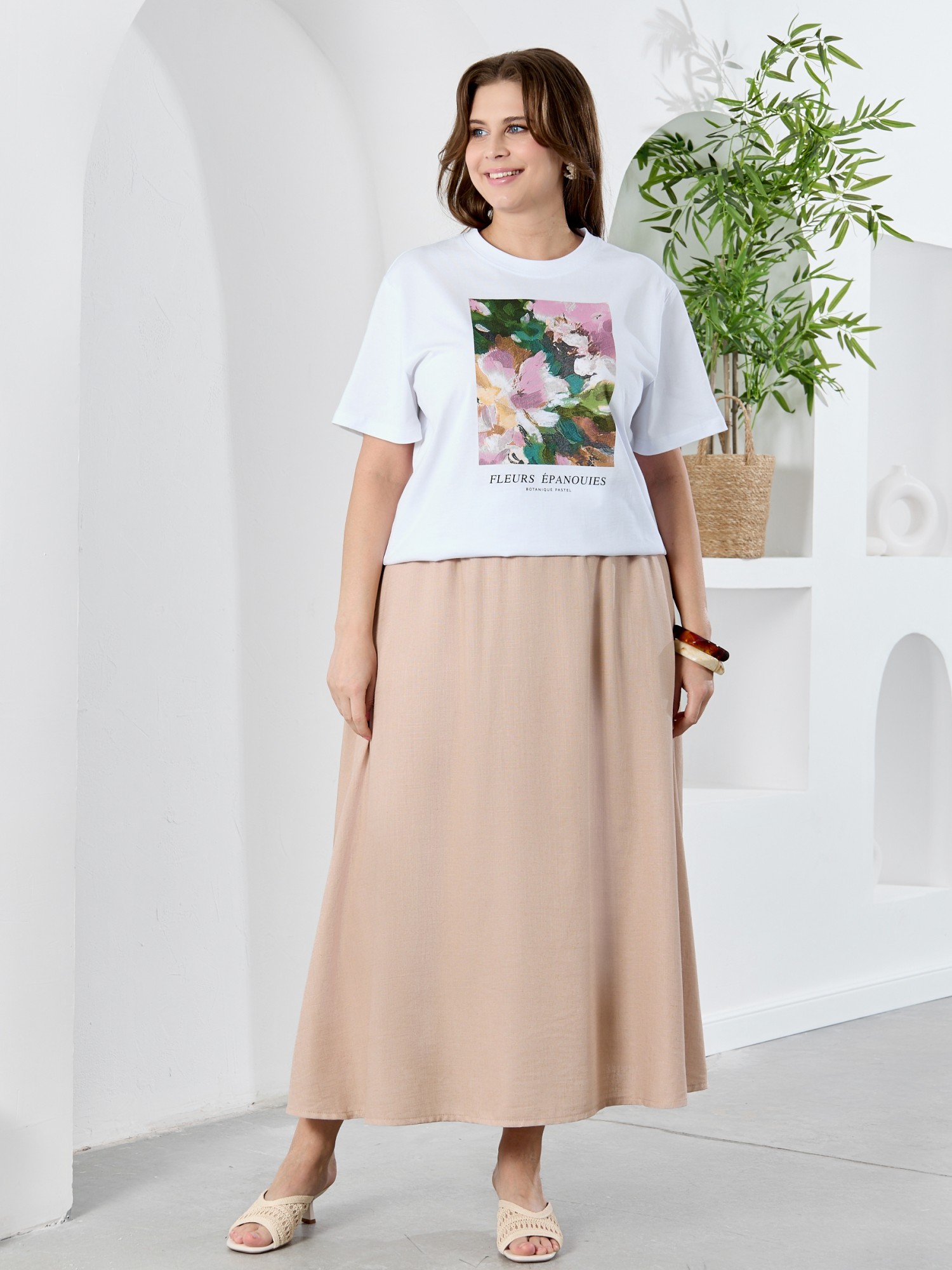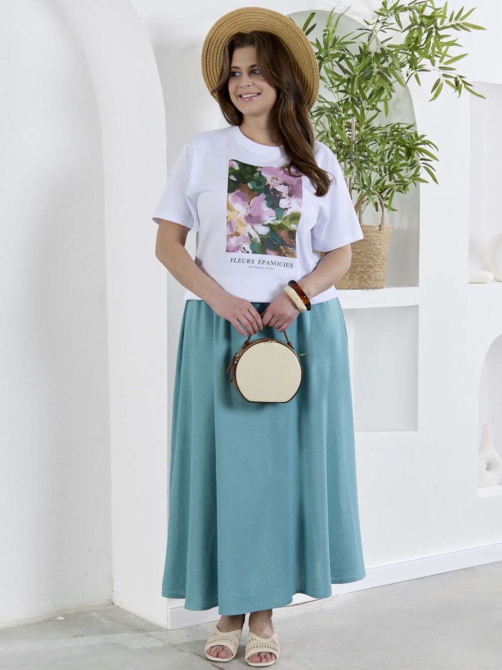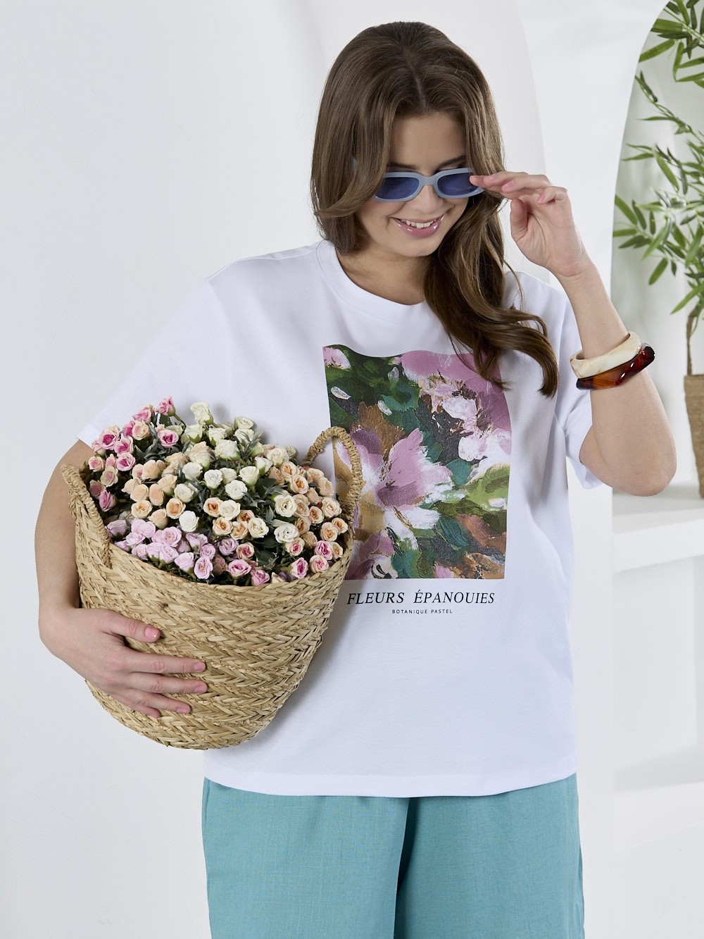 Футболка женская из гладкокрашеного трикотажного полотна «кулирка с лайкрой», полуприталенного силуэта, с короткими втачными рукавами. На полочке выполнена печать в технике «шелкографии». Горловина овальной формы обработана втачной планкой с отделочной строчкой по шву притачивания.