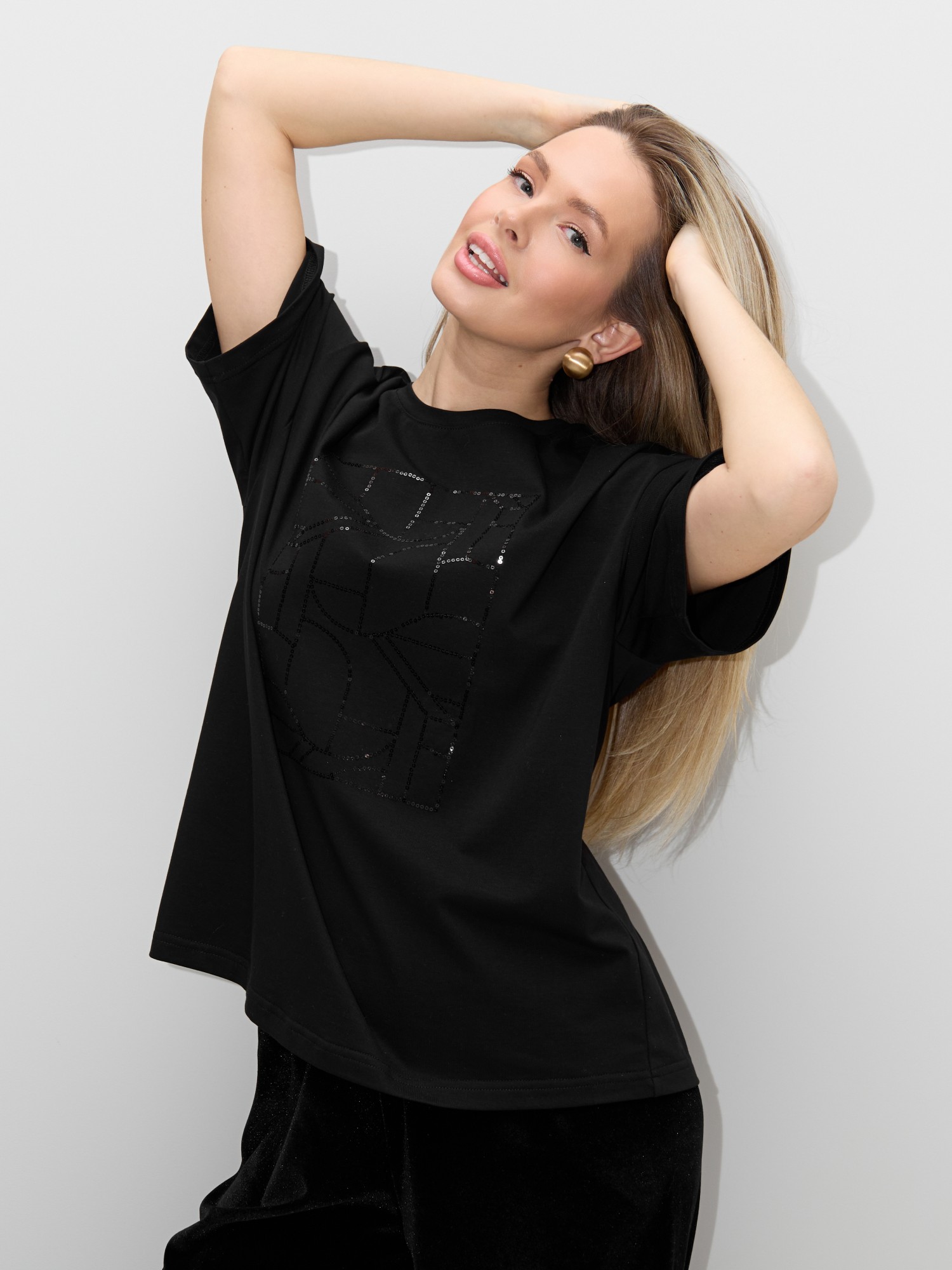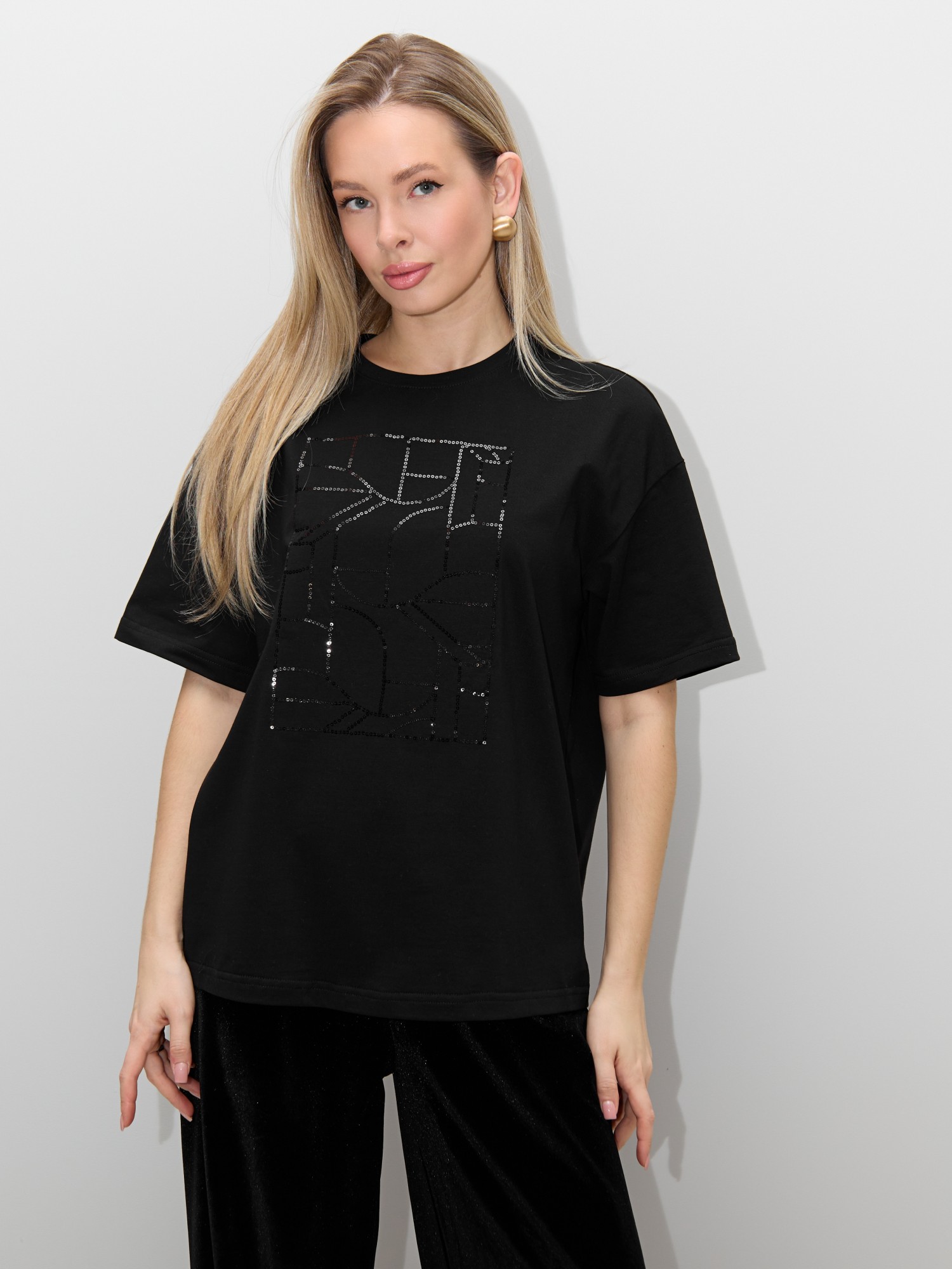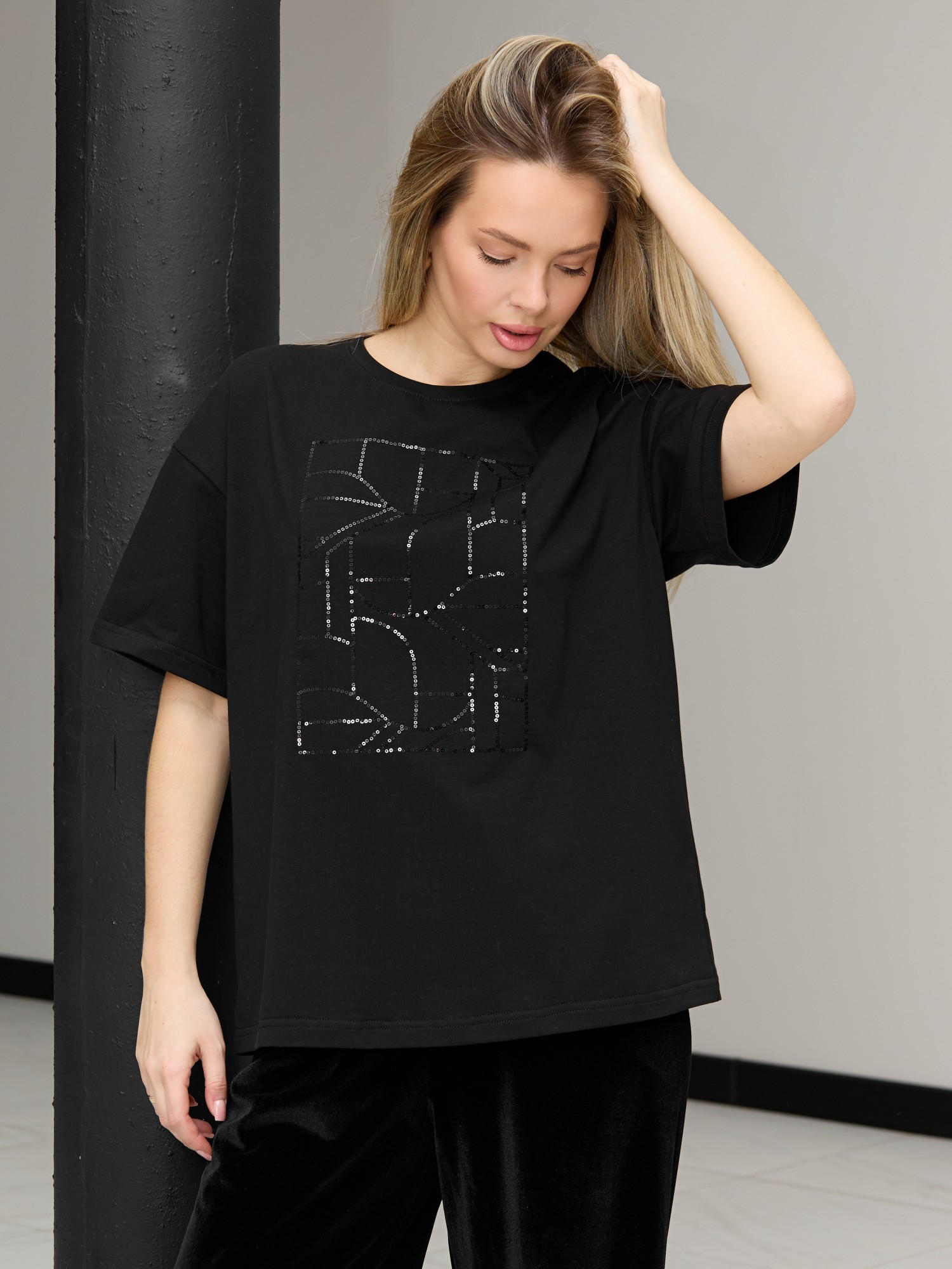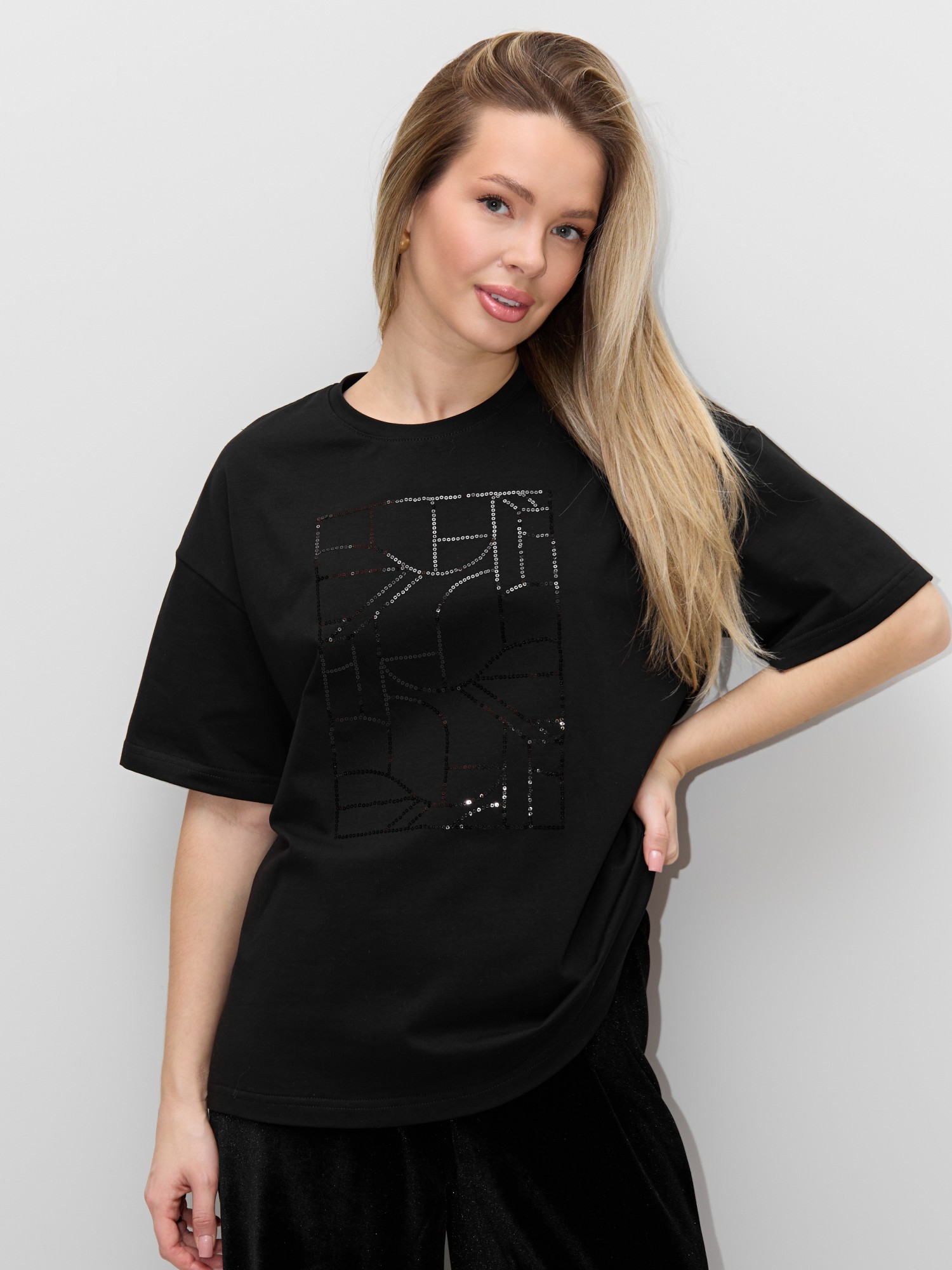 Футболка женская из гладкокрашенного трикотажного полотна «кулирка с лайкрой», свободного покроя, с короткими втачными рукавами, горловиной овальной формы, обработанной втачной планкой. По центру полочки выполнена вышивка «пайетками» в тон изделия.