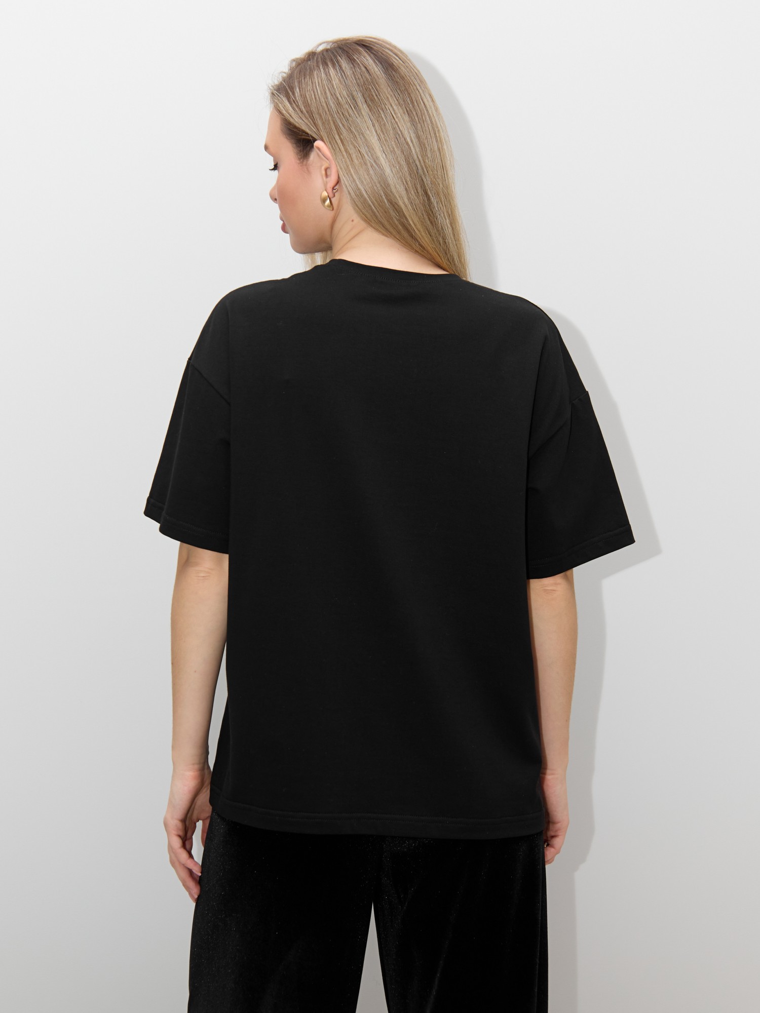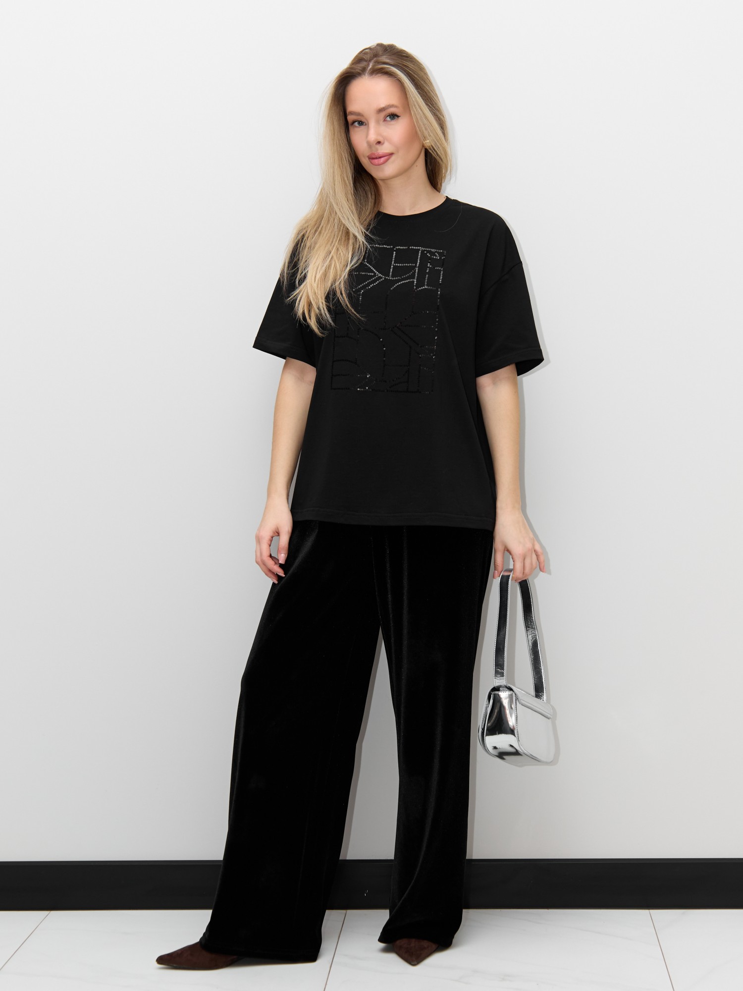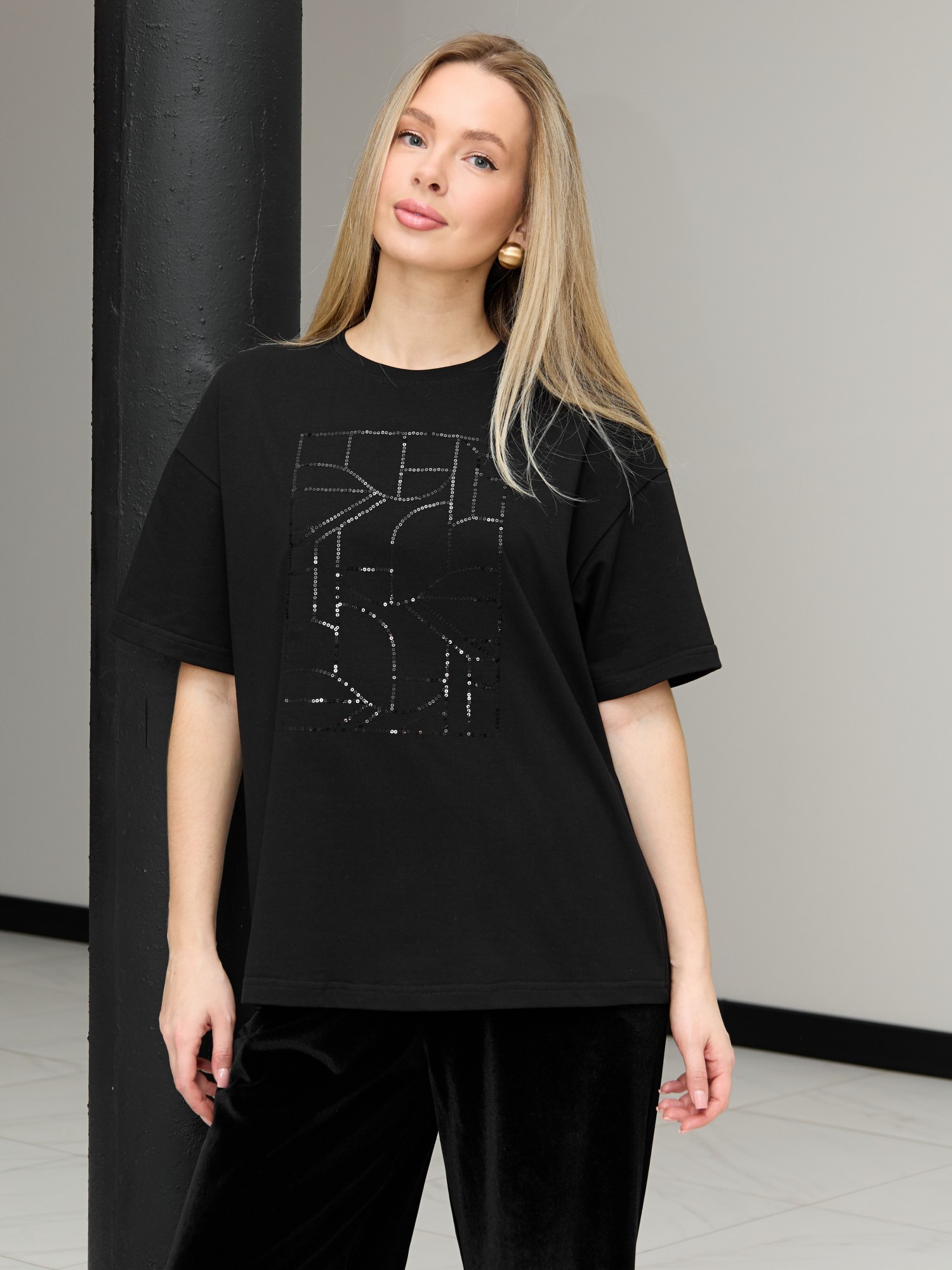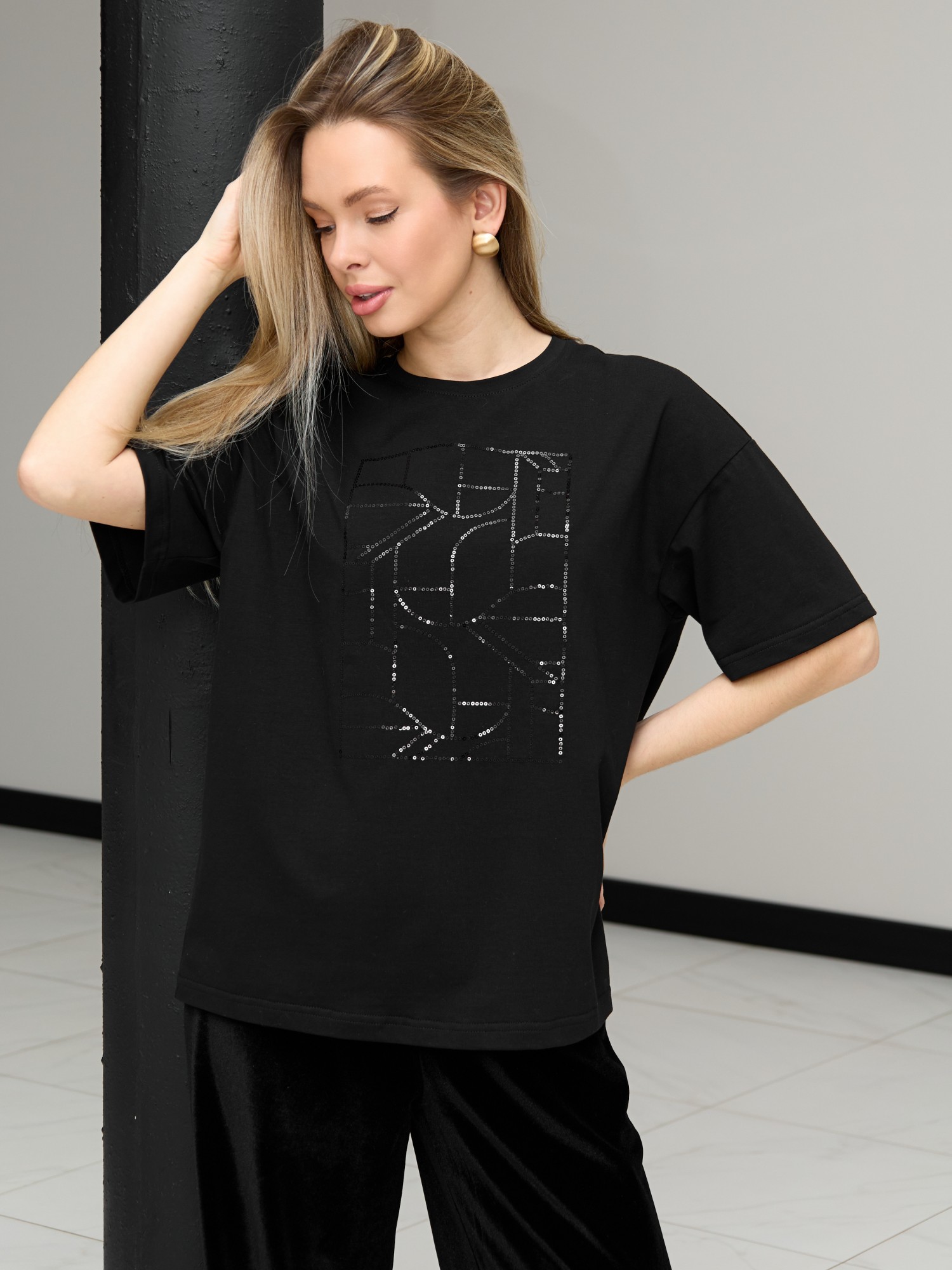 Футболка женская из гладкокрашенного трикотажного полотна «кулирка с лайкрой», свободного покроя, с короткими втачными рукавами, горловиной овальной формы, обработанной втачной планкой. По центру полочки выполнена вышивка «пайетками» в тон изделия.