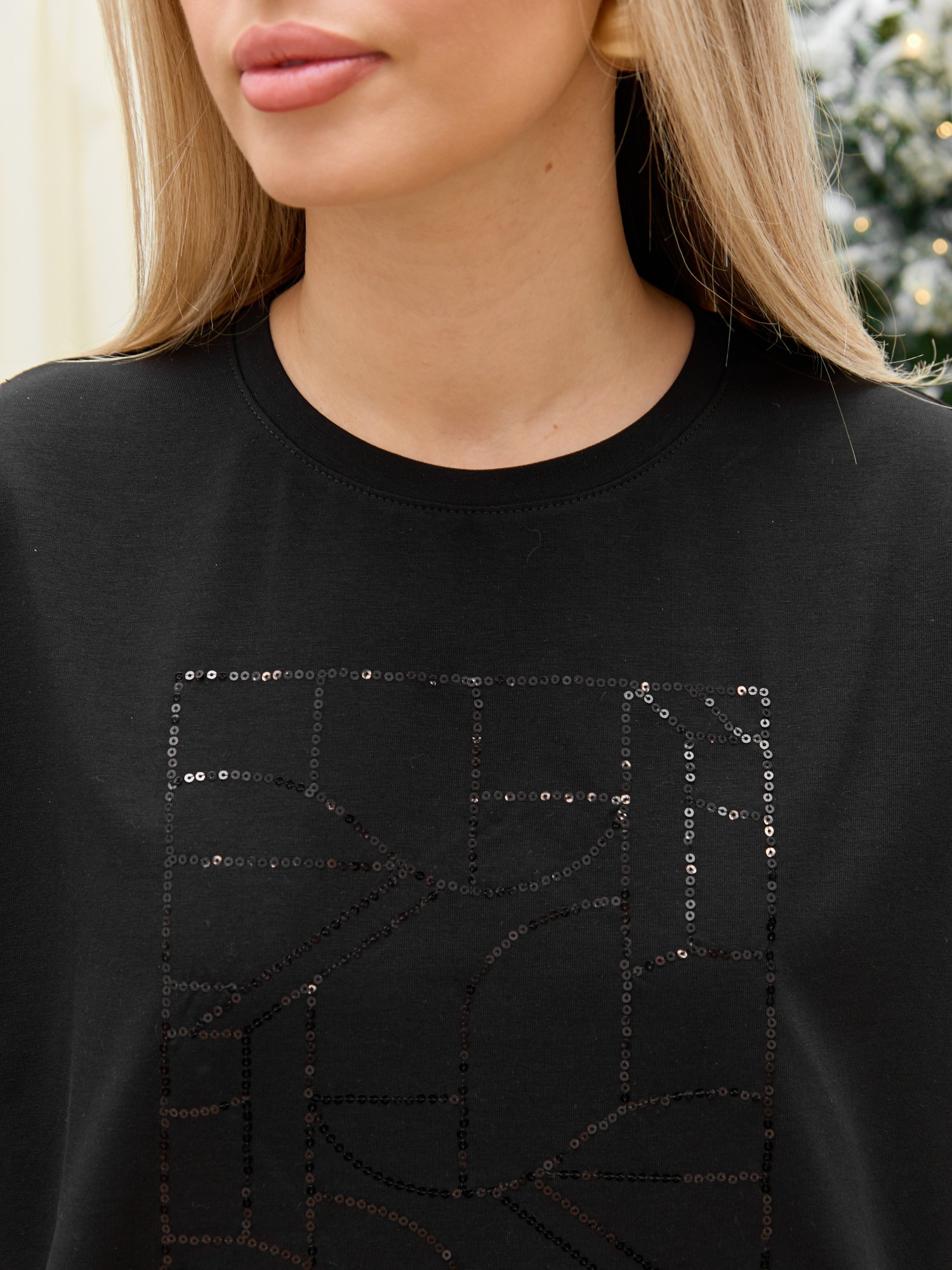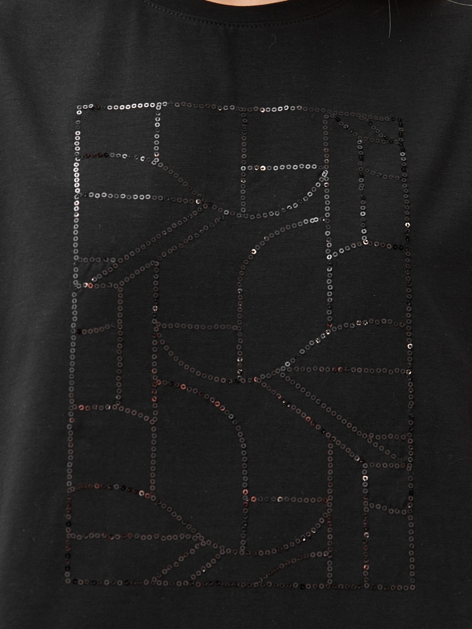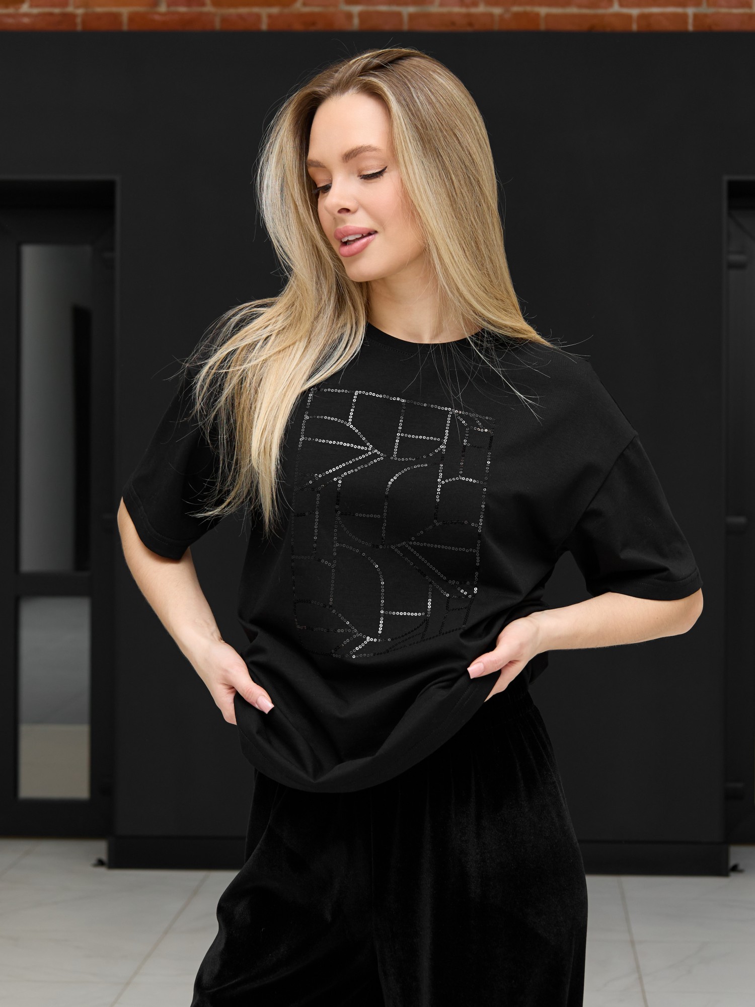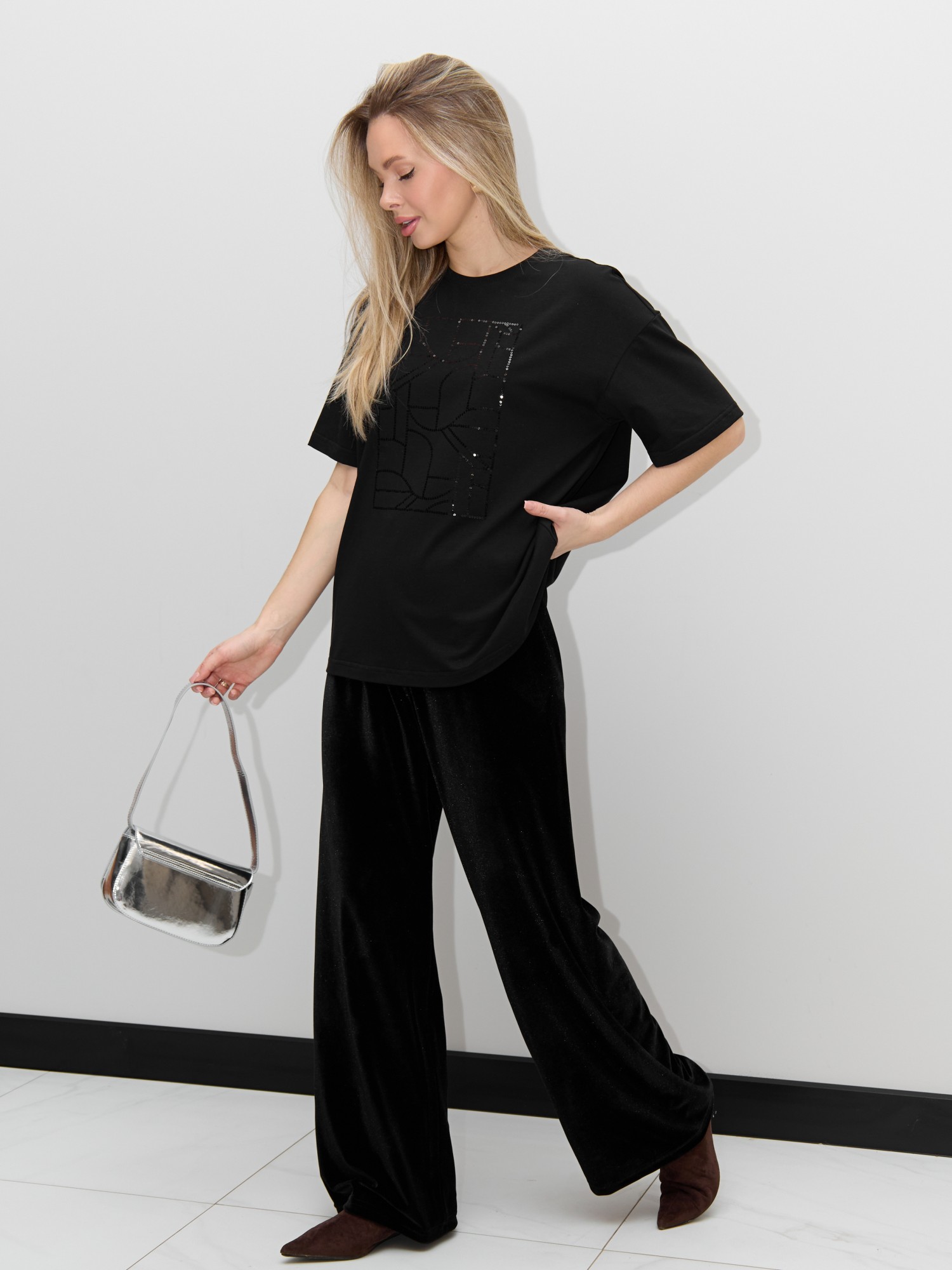 Футболка женская из гладкокрашенного трикотажного полотна «кулирка с лайкрой», свободного покроя, с короткими втачными рукавами, горловиной овальной формы, обработанной втачной планкой. По центру полочки выполнена вышивка «пайетками» в тон изделия.