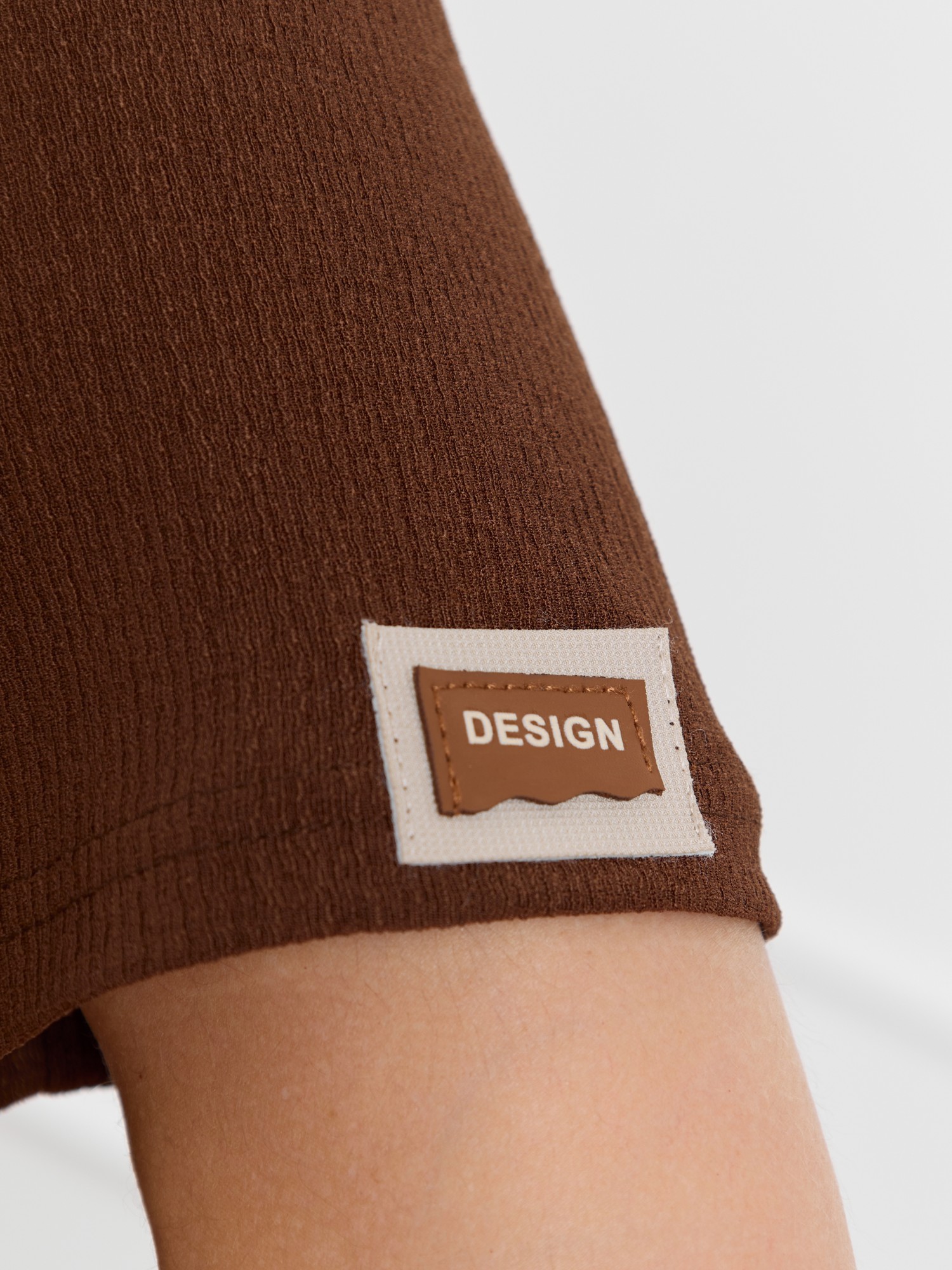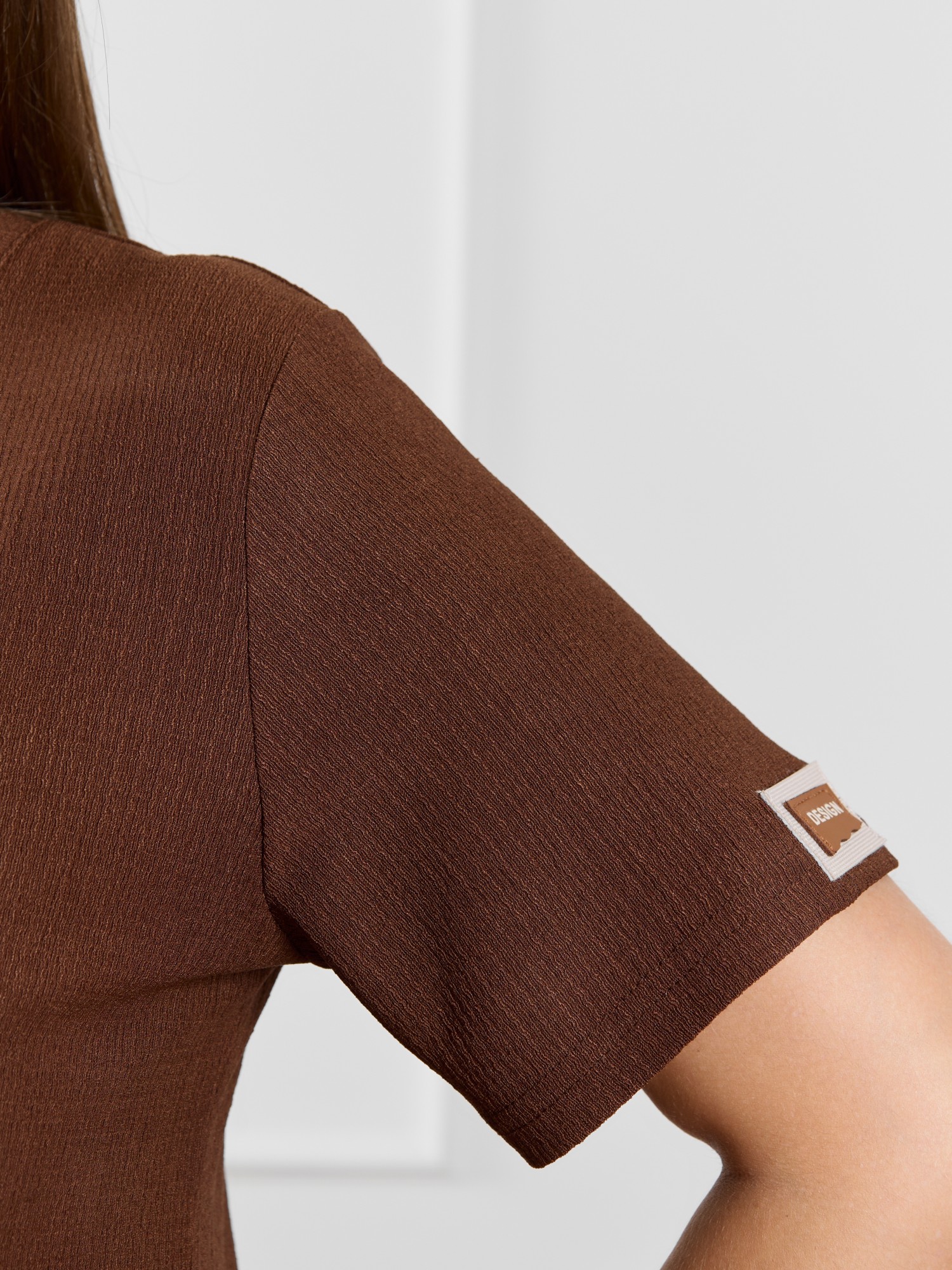Футболка женская из гладкокрашенного трикотажного полотна «бурумчук», прямого силуэта, с короткими втачными рукавами, горловиной овальной формы, обработанной втачной планкой. По центру полочки ниже горловины - настрочен декоративный элемент-нашивка.