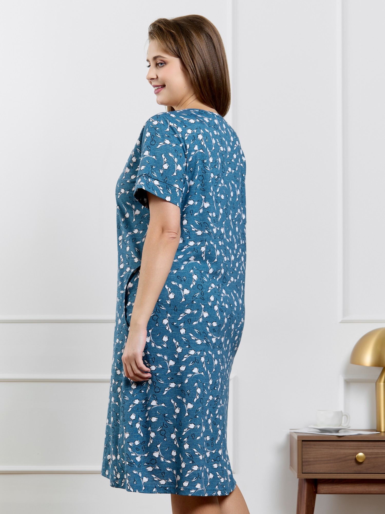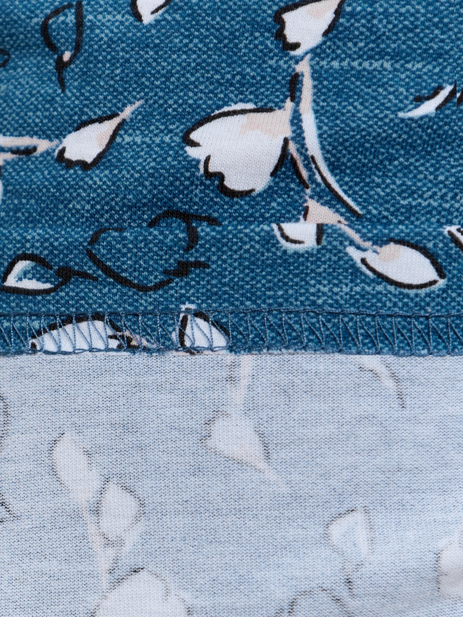 Халат женский из трикотажного полотна кулирка с набивным рисунком, прямого силуэта, с короткими втачными рукавами, обработанными манжетами, бортовой застежкой на тесьму «молния» и карманами в боковых швах. Горловина овальной формы окантована основным материалом.