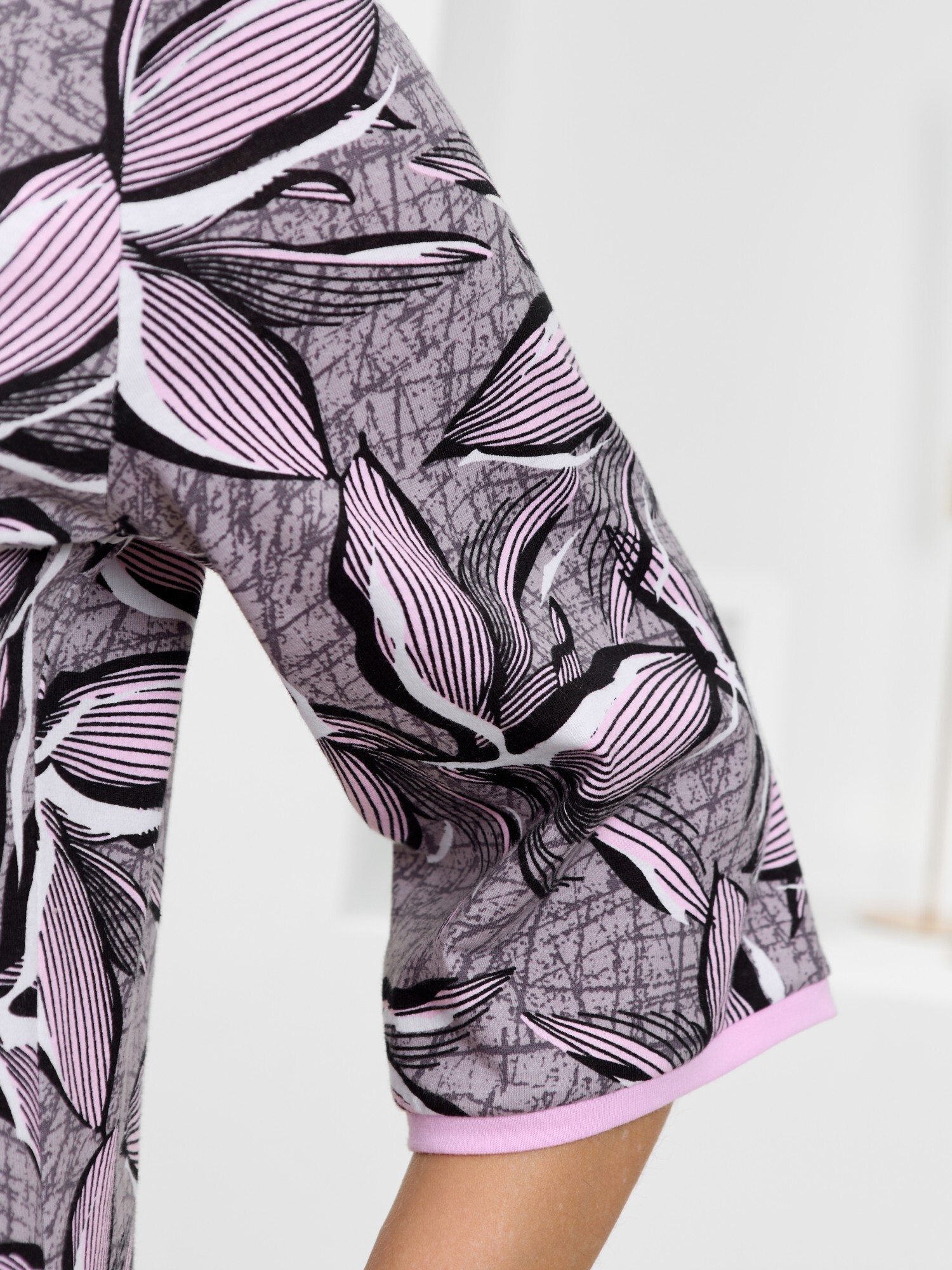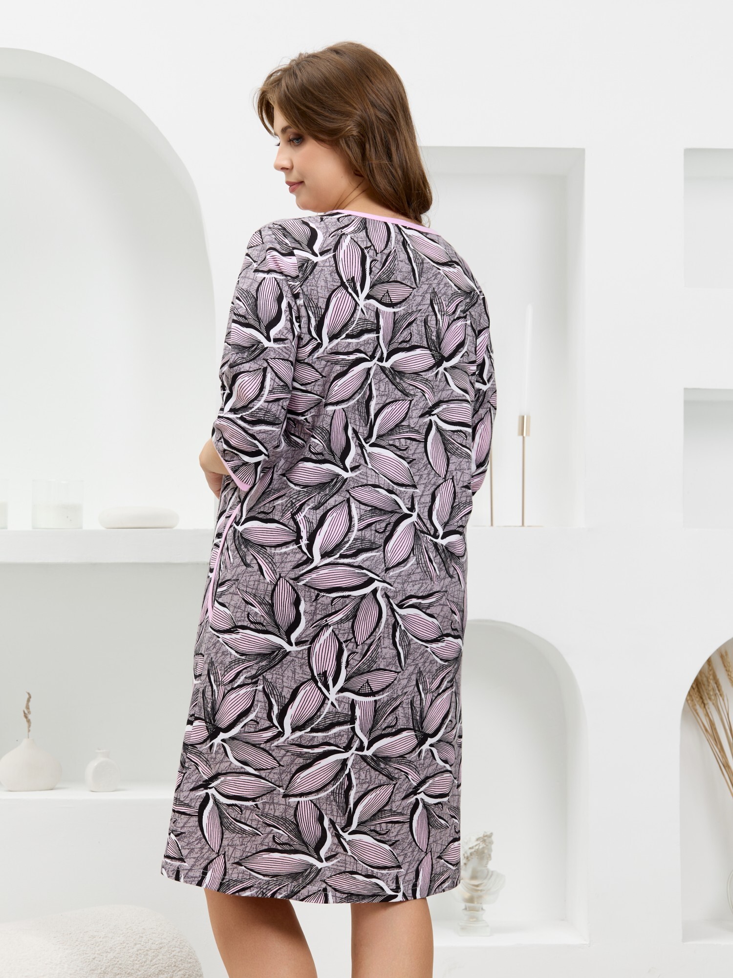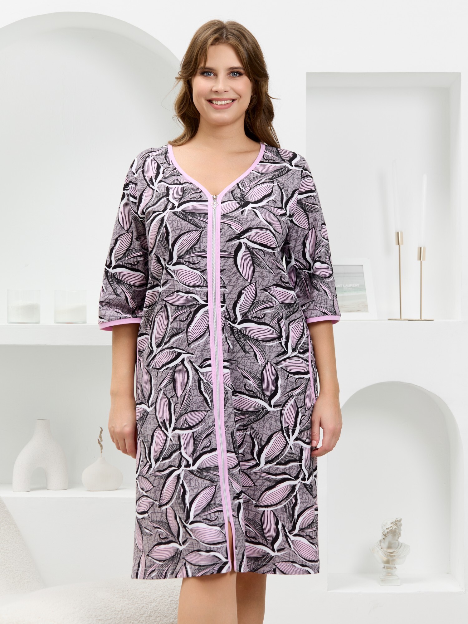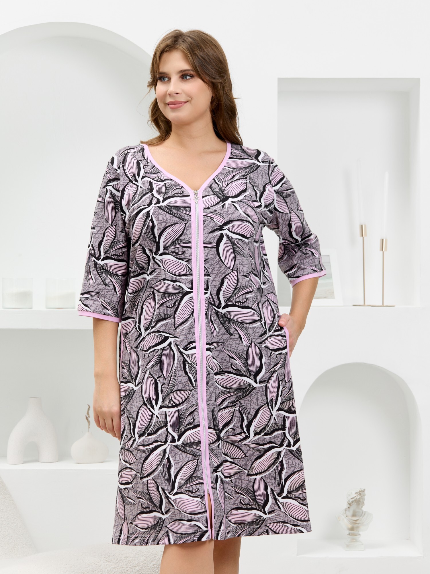 Халат женский из трикотажного полотна «кулирка» с набивным рисунком, прямого силуэта, с короткими втачными рукавами, горловиной овальной формы, карманами в боковых швах и центральной бортовой застежкой на тесьму «молния». Бортовые срезы, горловина и входы в карманы окантованы контрастным материалом.