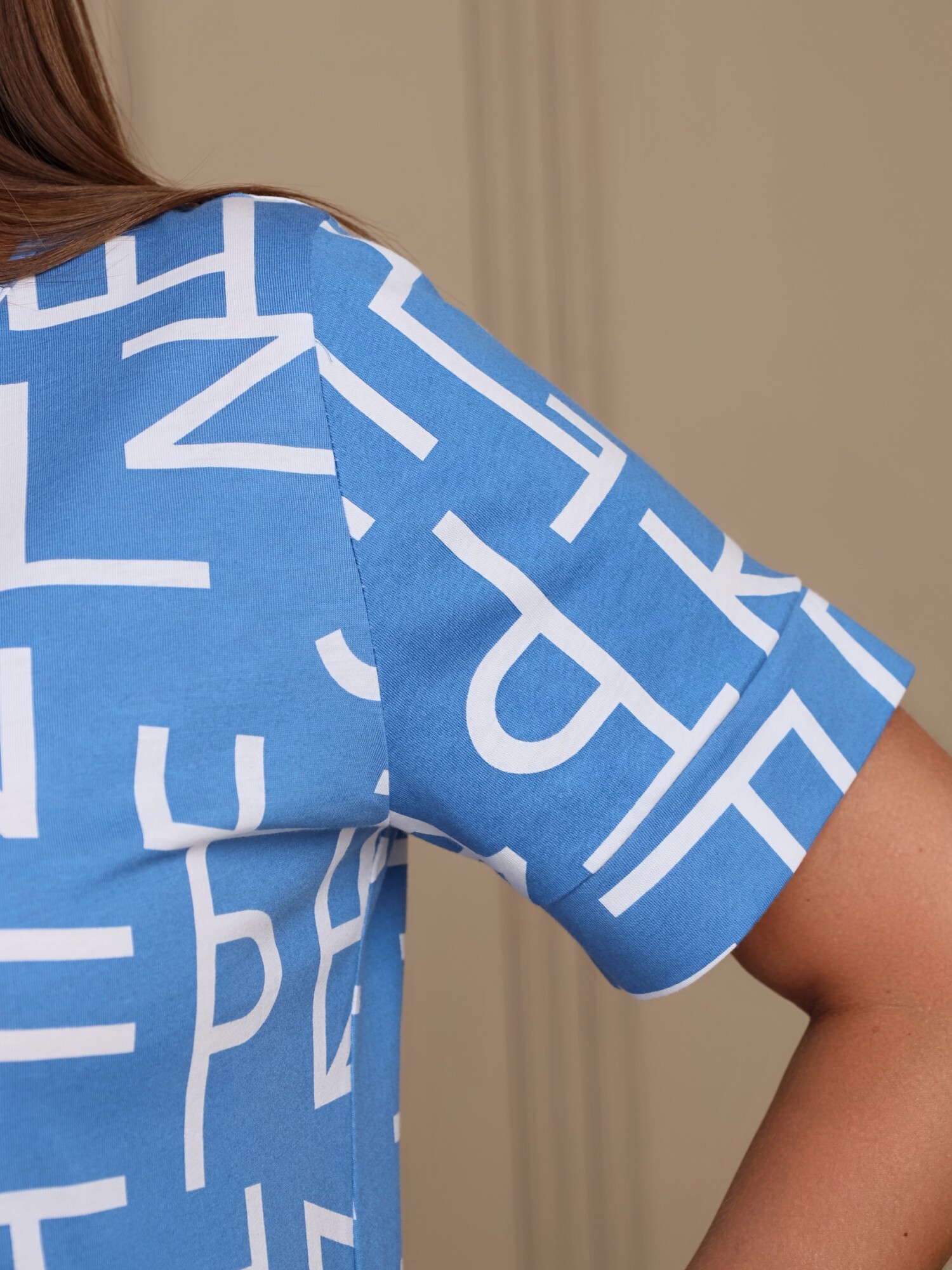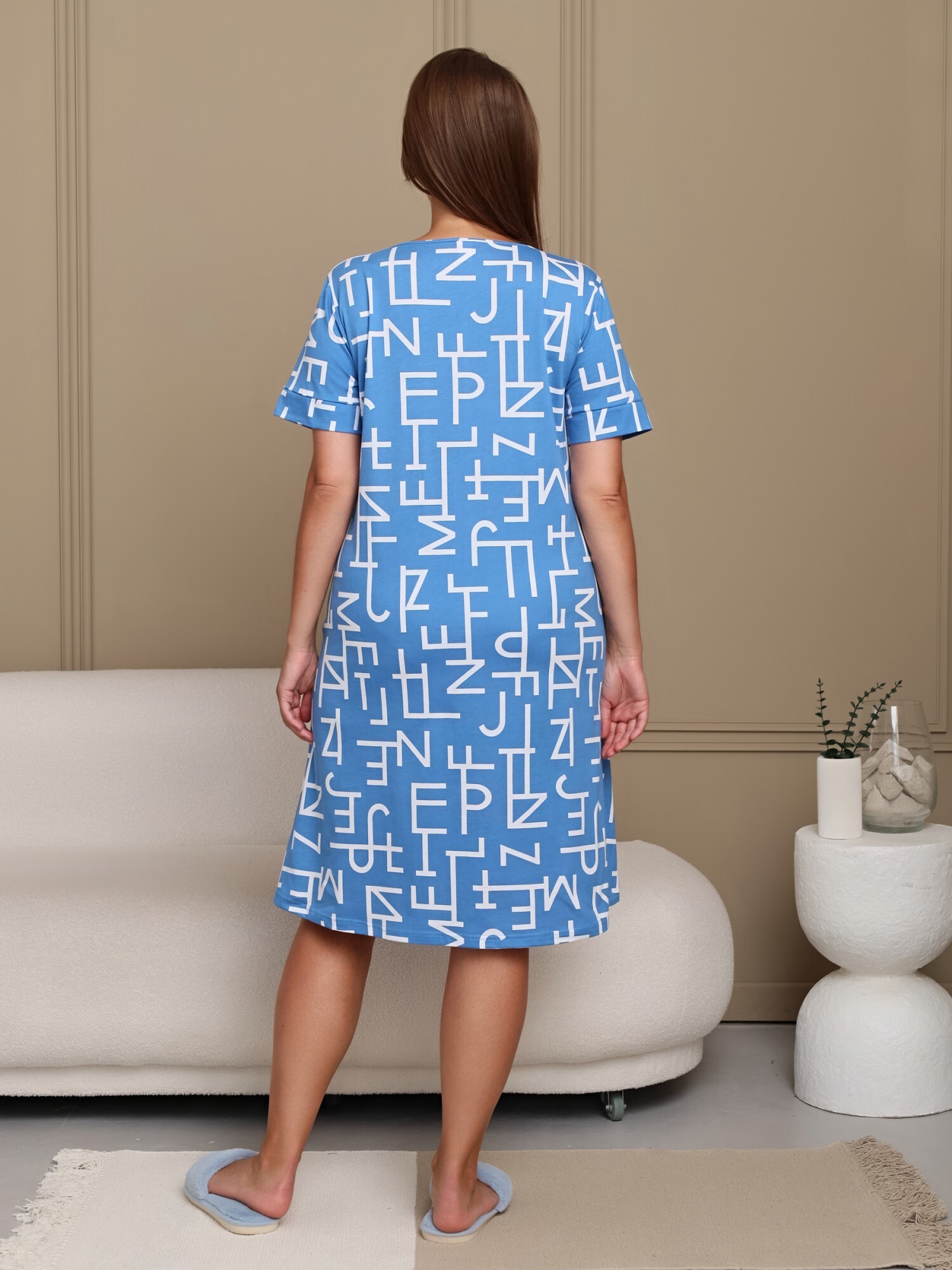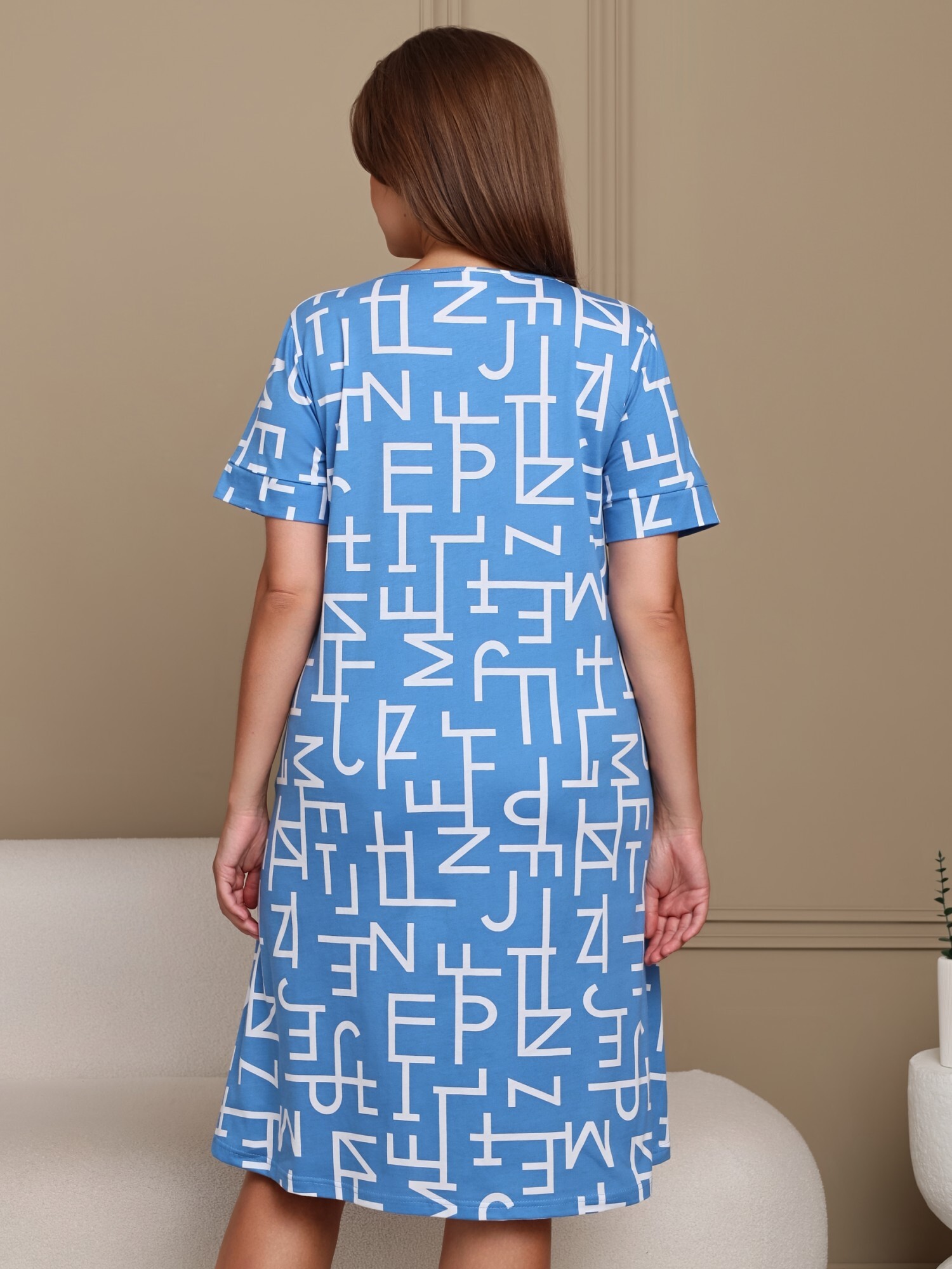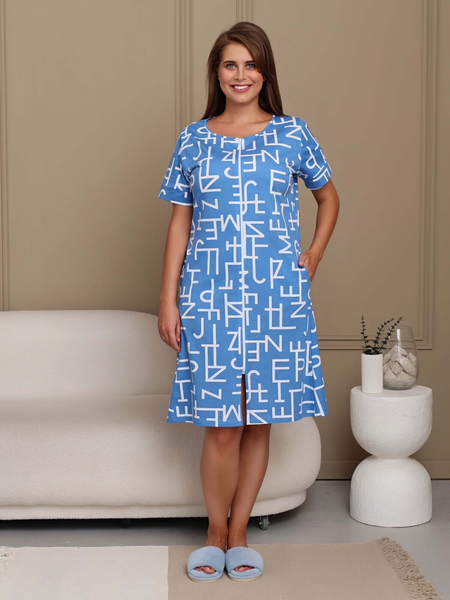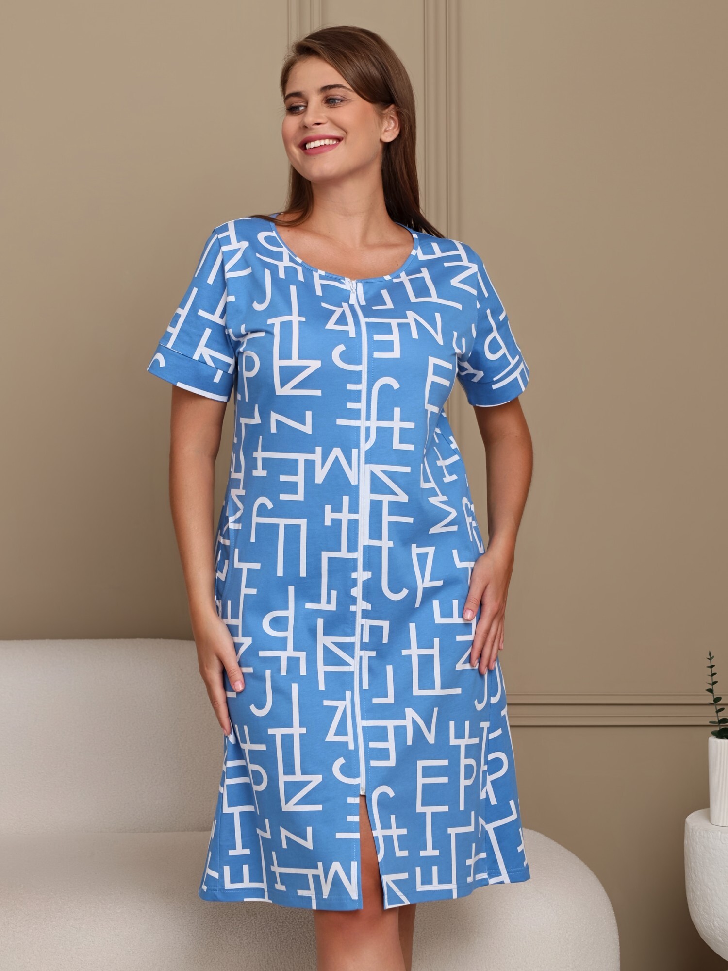 Халат женский из трикотажного полотна «кулирка» с набивным рисунком полуприлегающего силуэта, с горловиной овальной формы, окантованной основным материалом, короткими втачными рукавами с притачными манжетами. В боковых швах, смещенных в сторону полочки, обработаны карманы.
