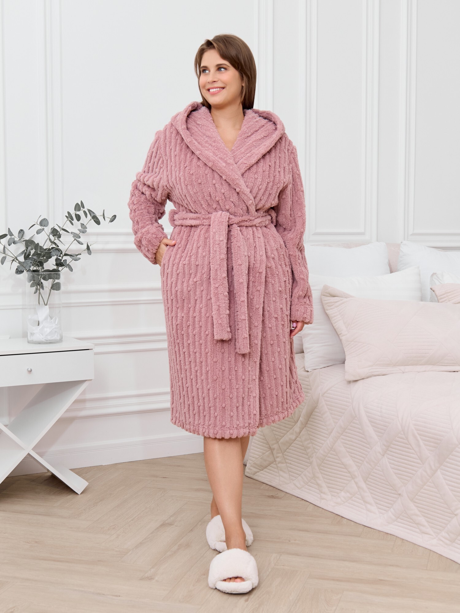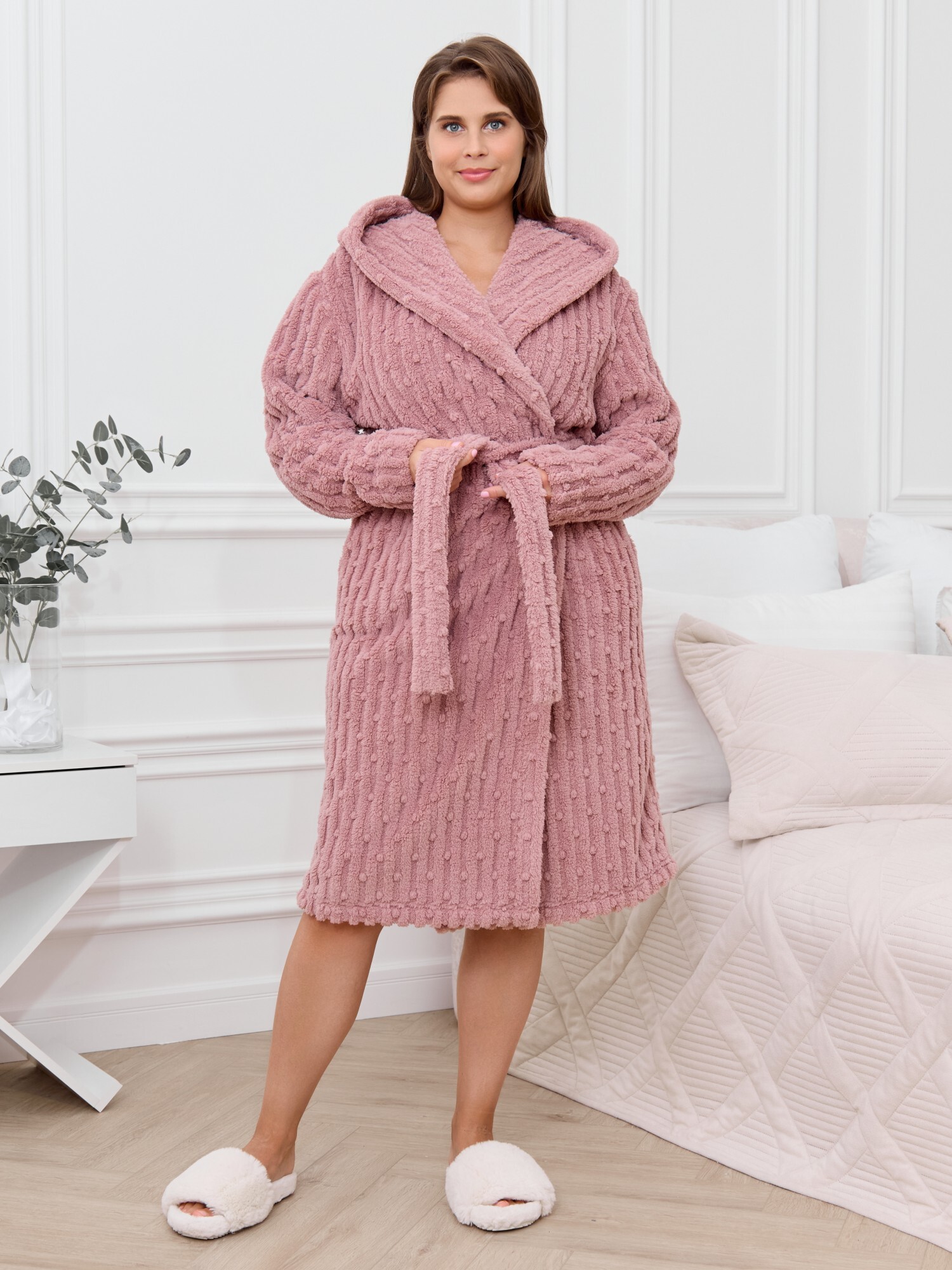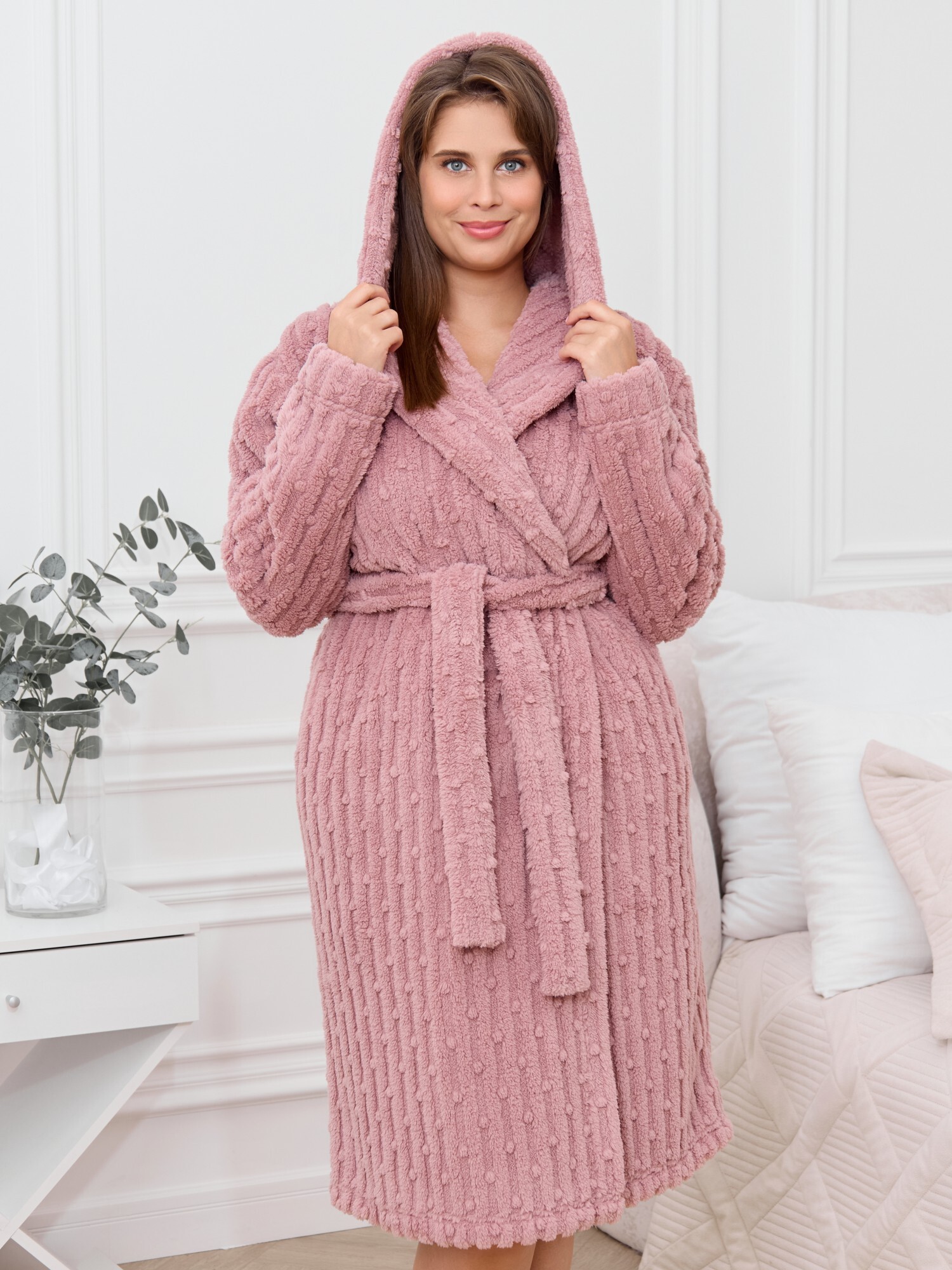 Халат женский из гладкокрашенного трикотажного полотна «велсофт» со стриженым рисунком, прямого силуэта, на запахе, с длинными втачными рукавами, капюшоном, карманами в боковых швах и съемным поясом, фиксирующимся на талии двумя шлевками в боковых швах.