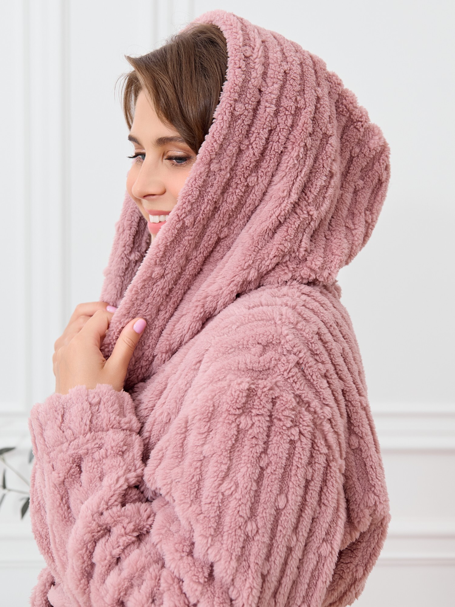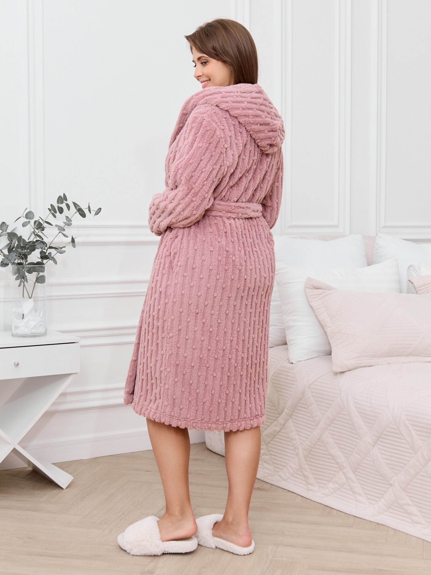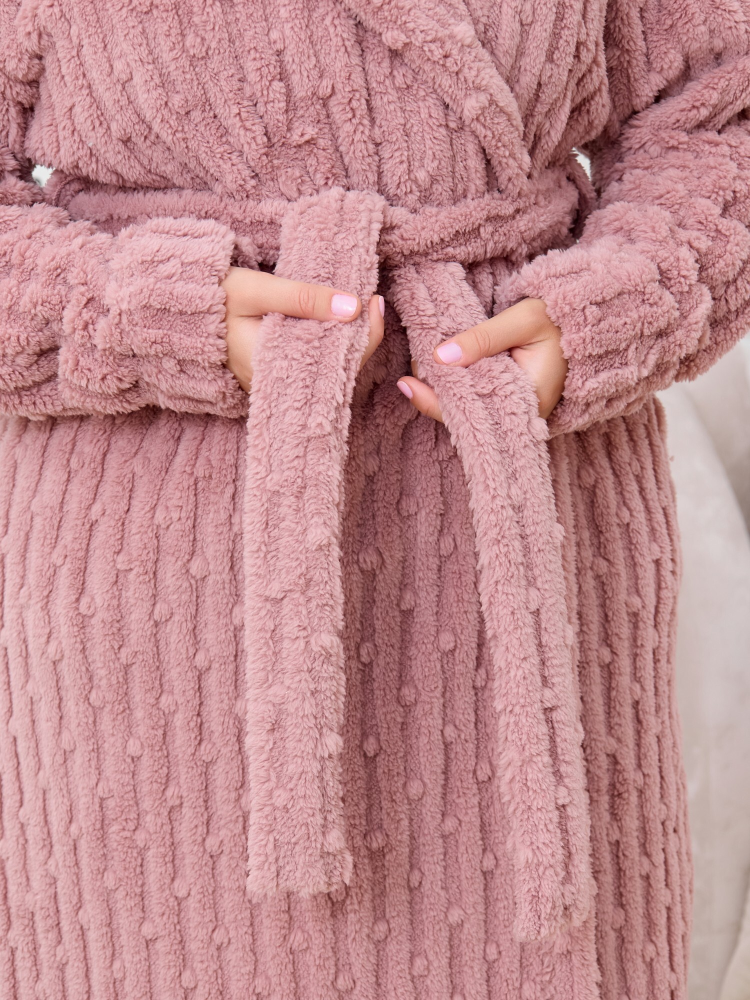 Халат женский из гладкокрашенного трикотажного полотна «велсофт» со стриженым рисунком, прямого силуэта, на запахе, с длинными втачными рукавами, капюшоном, карманами в боковых швах и съемным поясом, фиксирующимся на талии двумя шлевками в боковых швах.