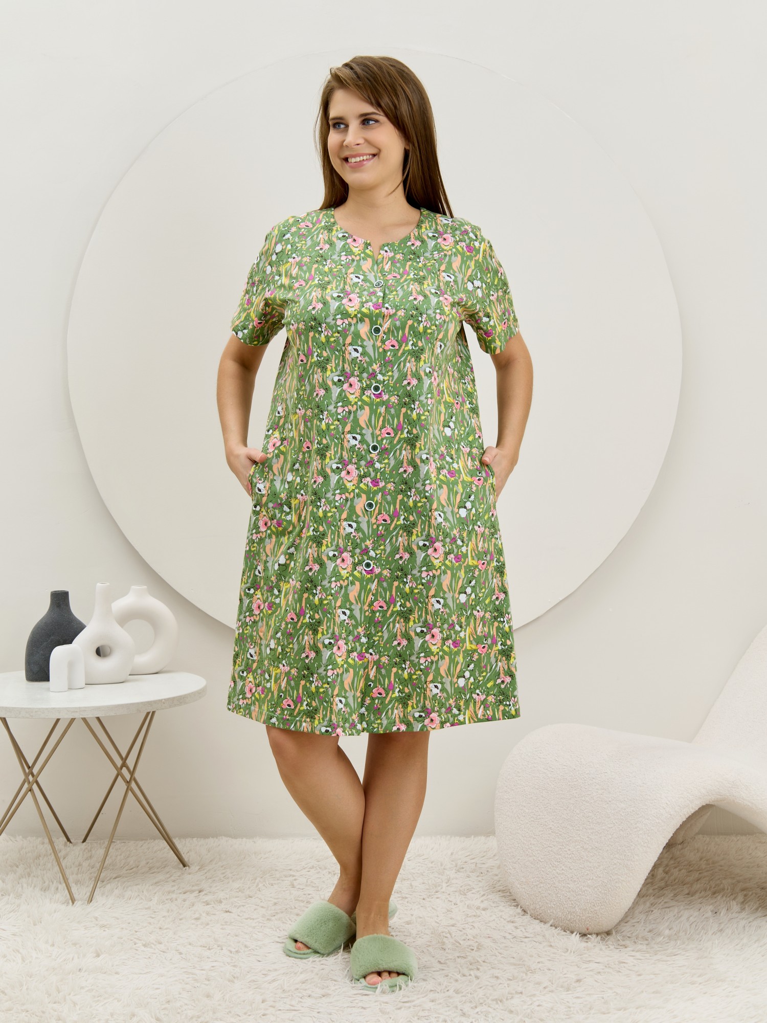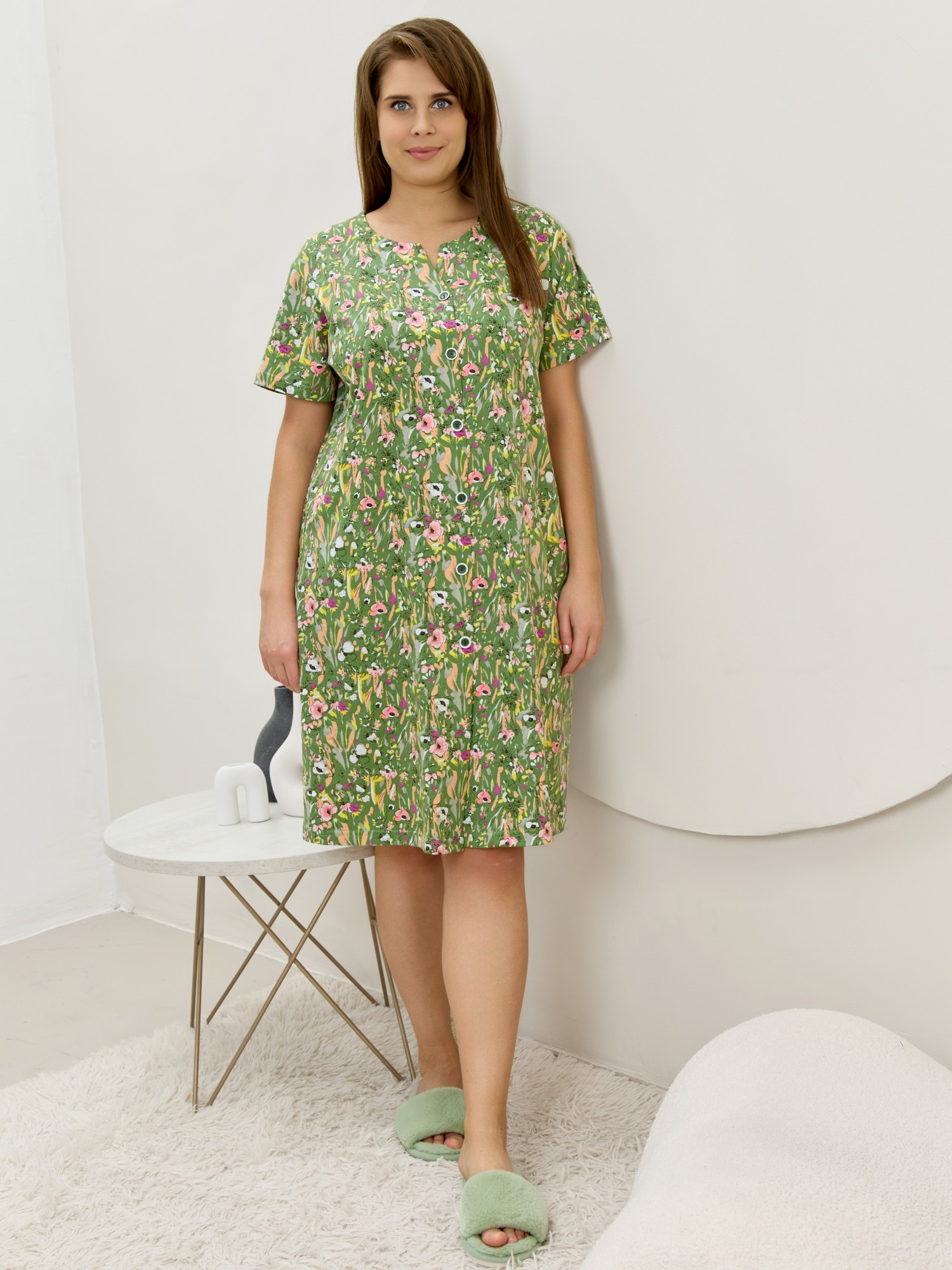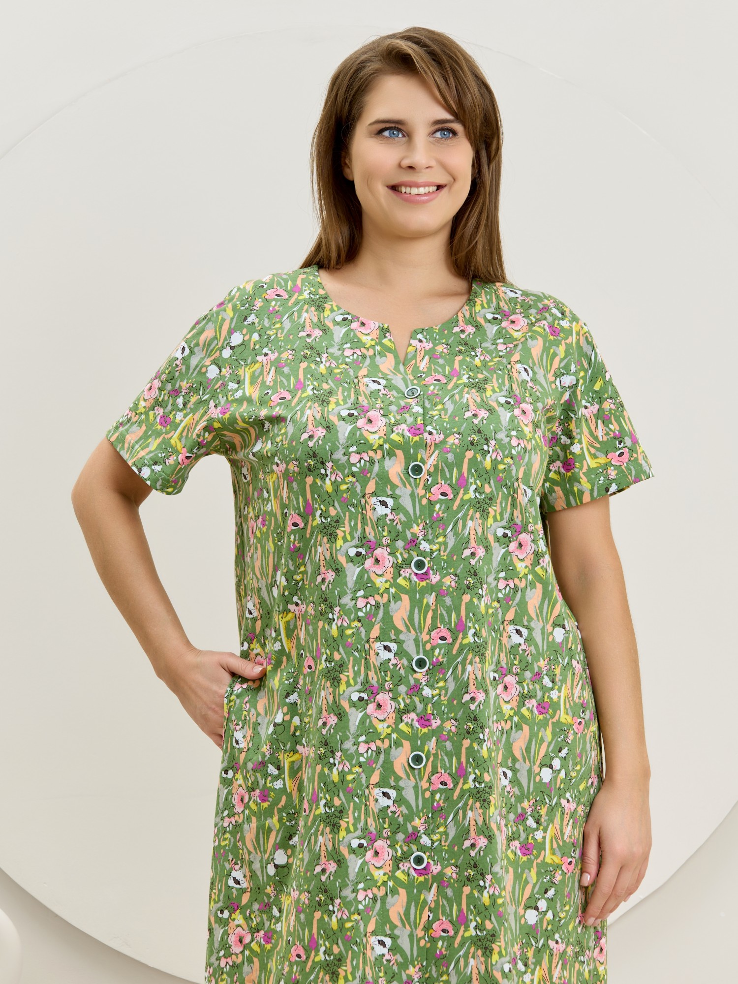 Халат женский из трикотажного полотна «кулирка» с набивным рисунком, прямого силуэта, с короткими втачными рукавами, карманами в боковых швах и центральной бортовой застежкой на обметанные петли и пуговицы. Горловина – овальной формы, переходящая в небольшой v-образный вырез выше верхней пуговицы. Входы в карманы и горловина спинки окантованы.