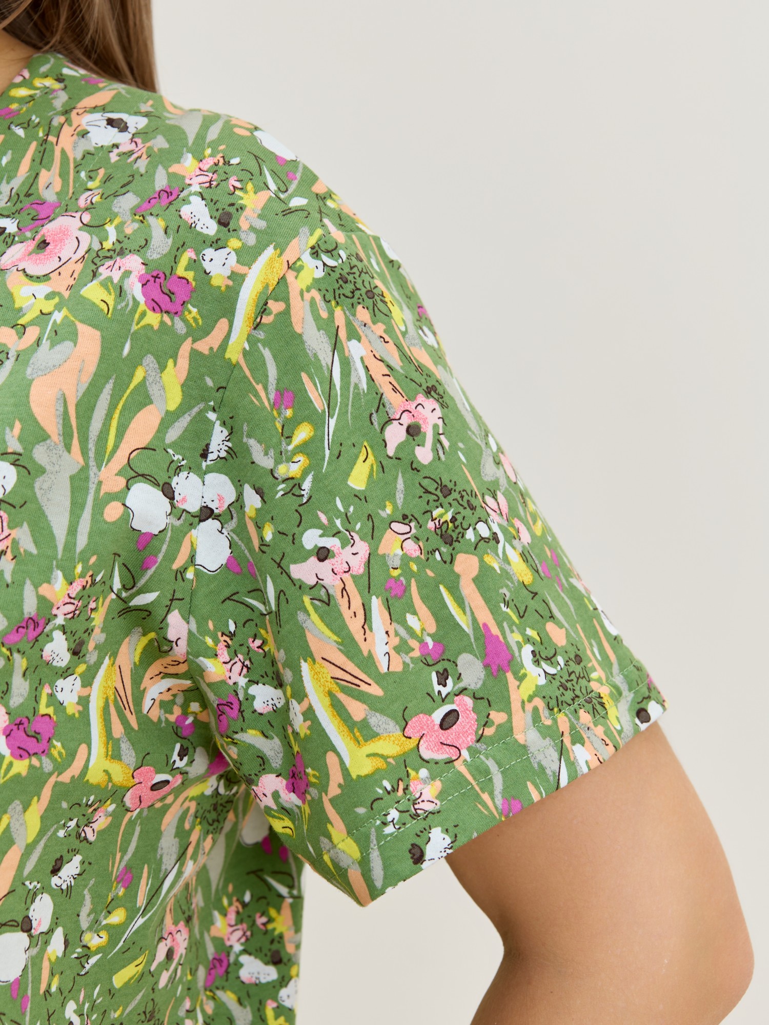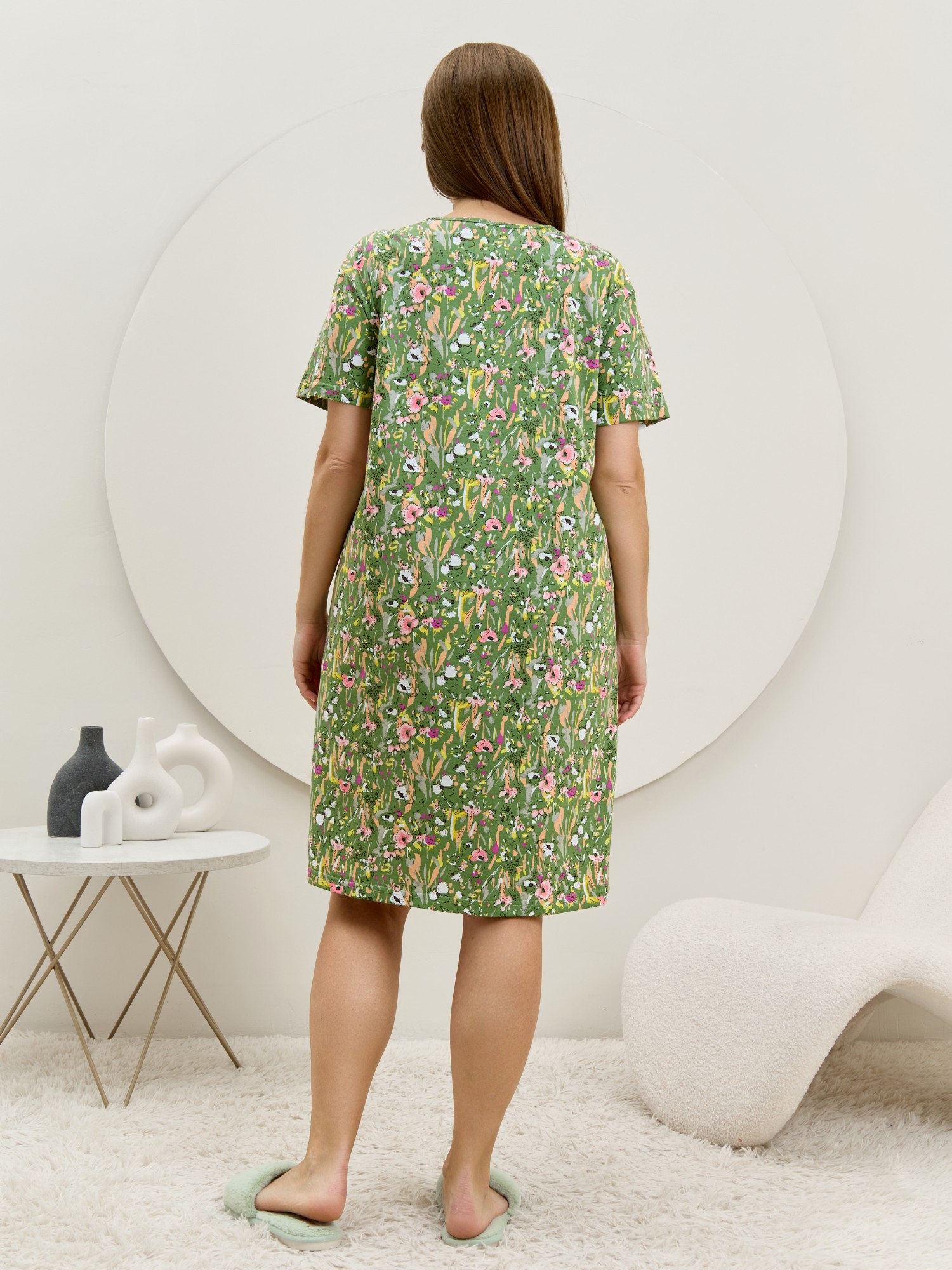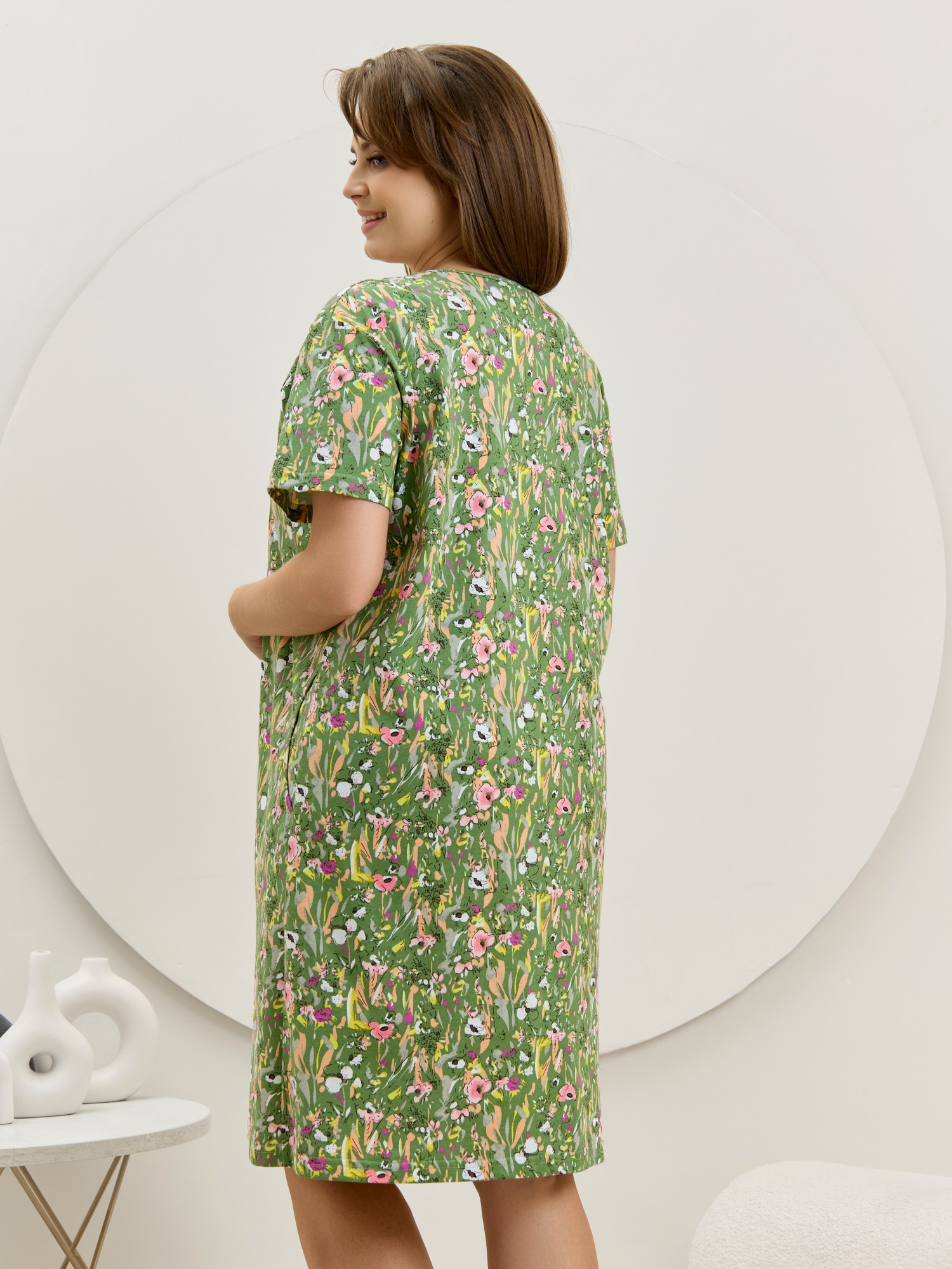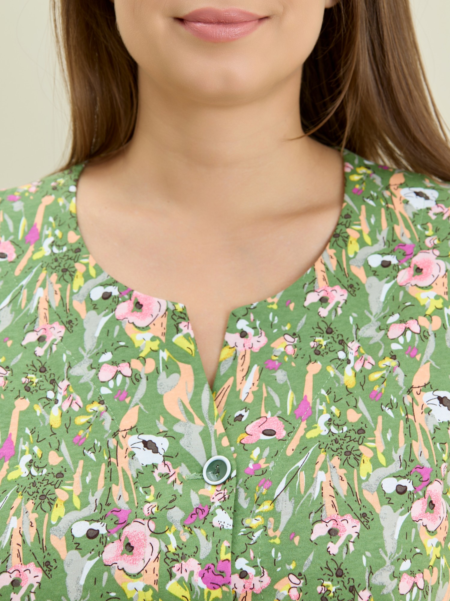 Халат женский из трикотажного полотна «кулирка» с набивным рисунком, прямого силуэта, с короткими втачными рукавами, карманами в боковых швах и центральной бортовой застежкой на обметанные петли и пуговицы. Горловина – овальной формы, переходящая в небольшой v-образный вырез выше верхней пуговицы. Входы в карманы и горловина спинки окантованы.