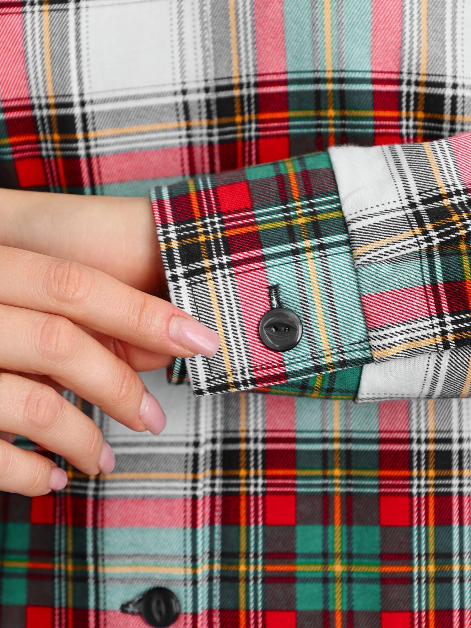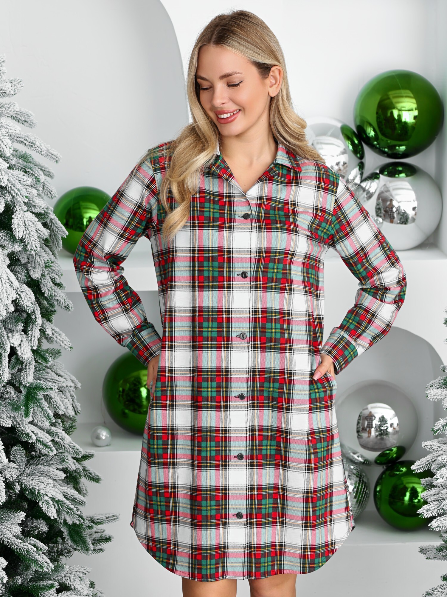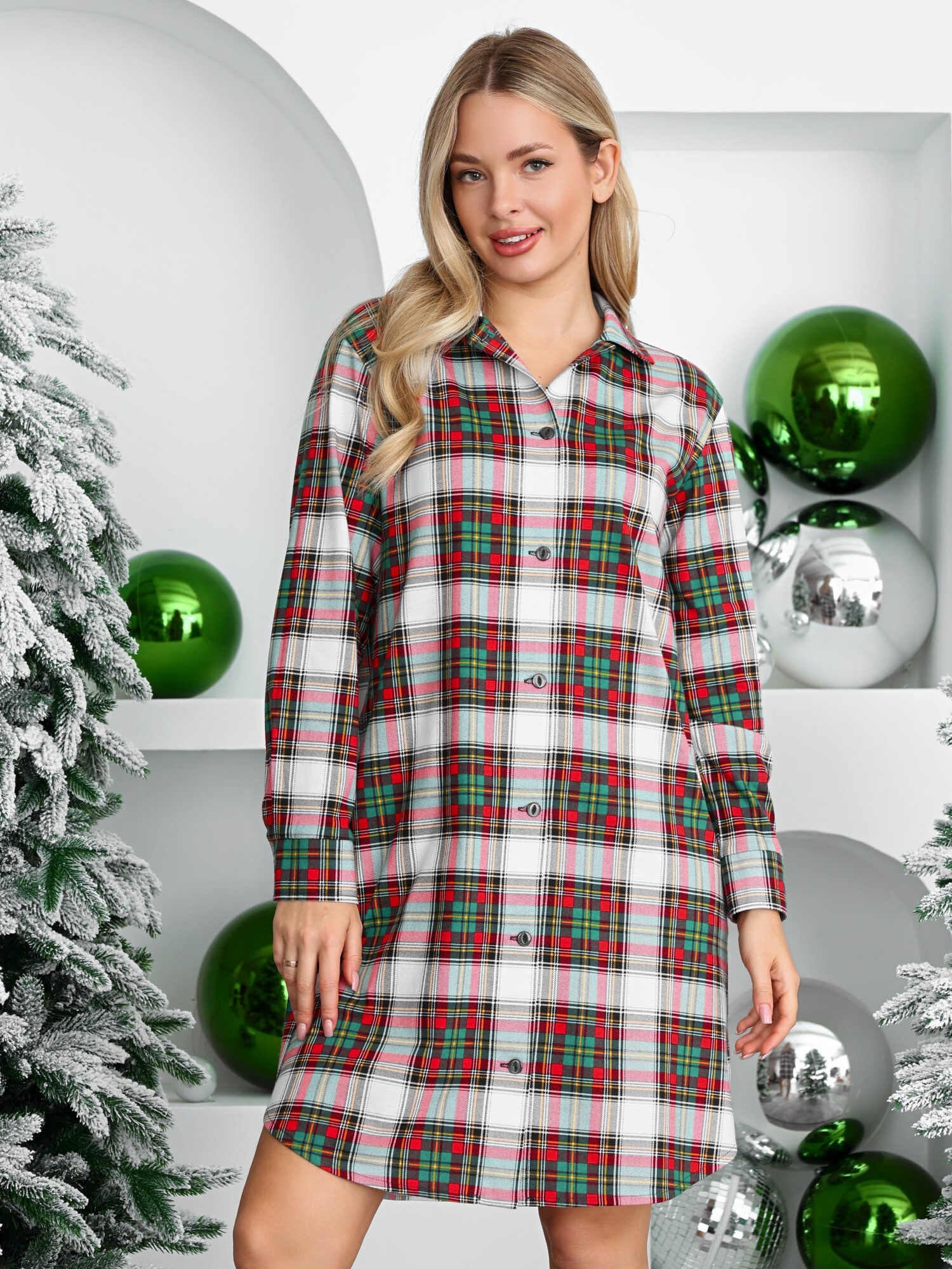 Халат молодежный из трикотажного полотна «кулирка» с набивным рисунком «клетка», прямого силуэта, с длинными втачными рукавами, с застегивающимися манжетами, стояче-отложным воротником, карманами в боковых швах, фигурной линией низа, центральной бортовой застежкой на петли и пуговицы.