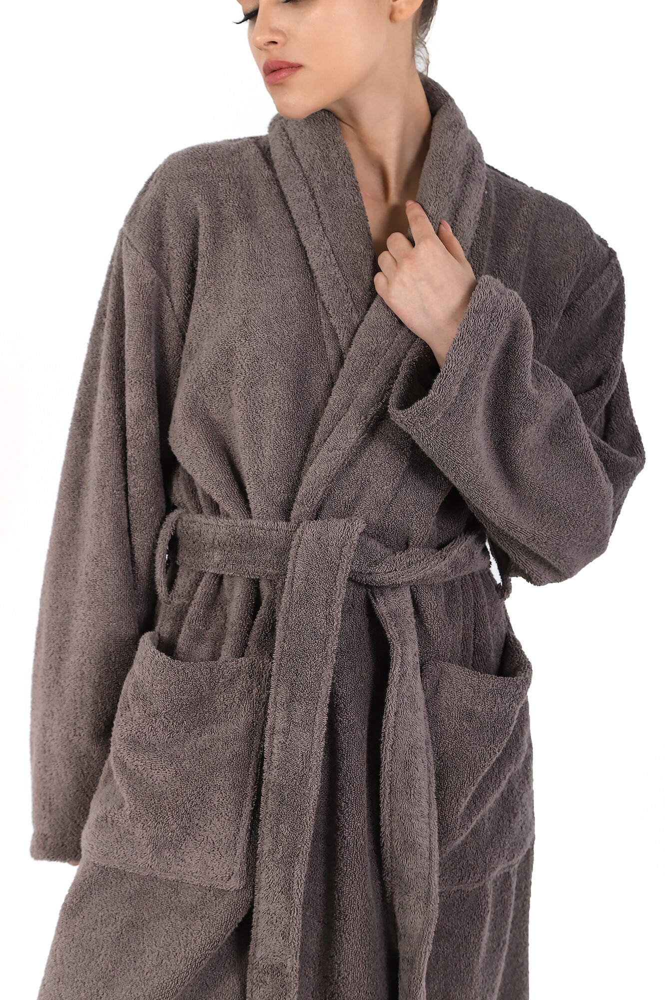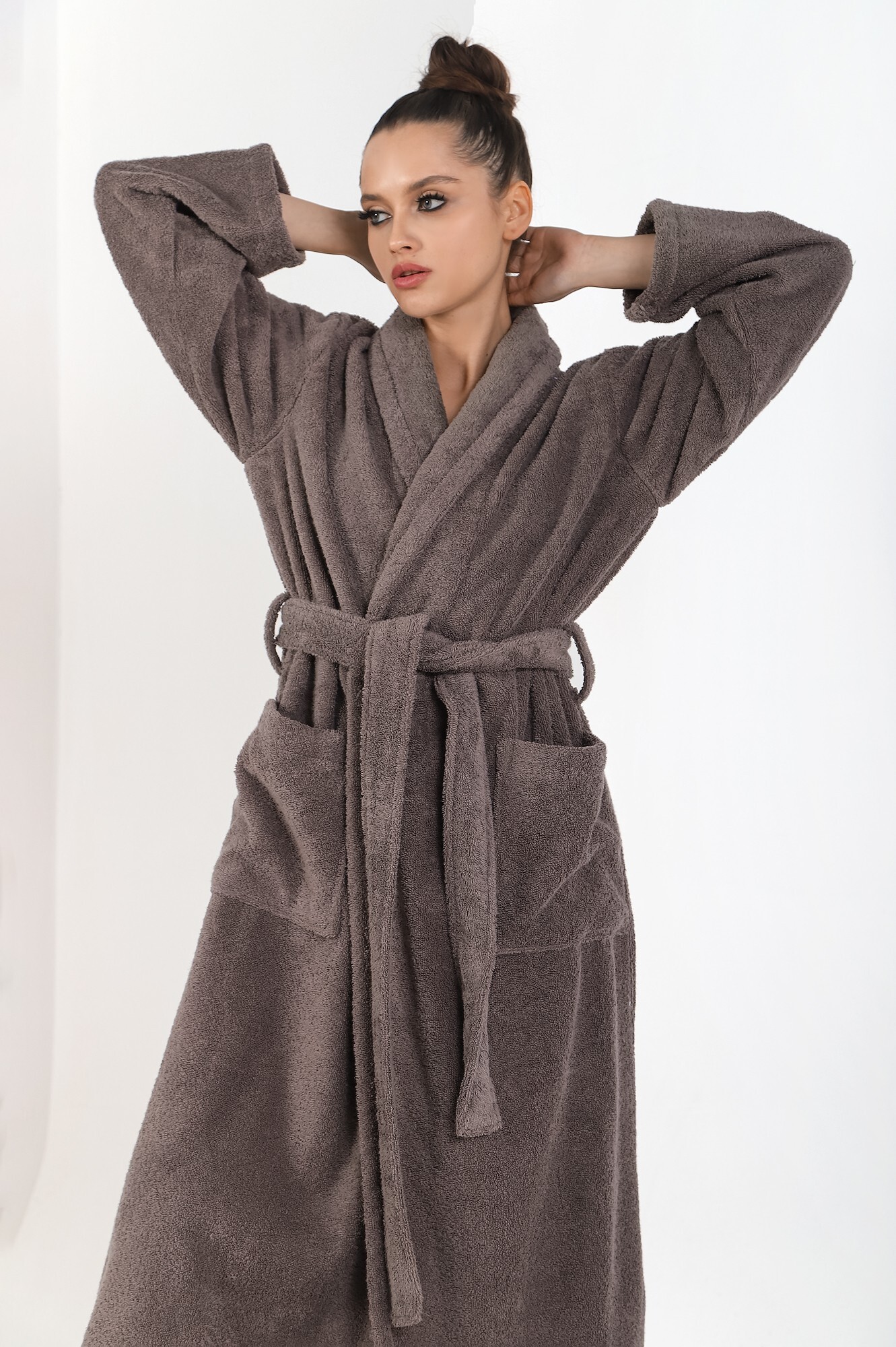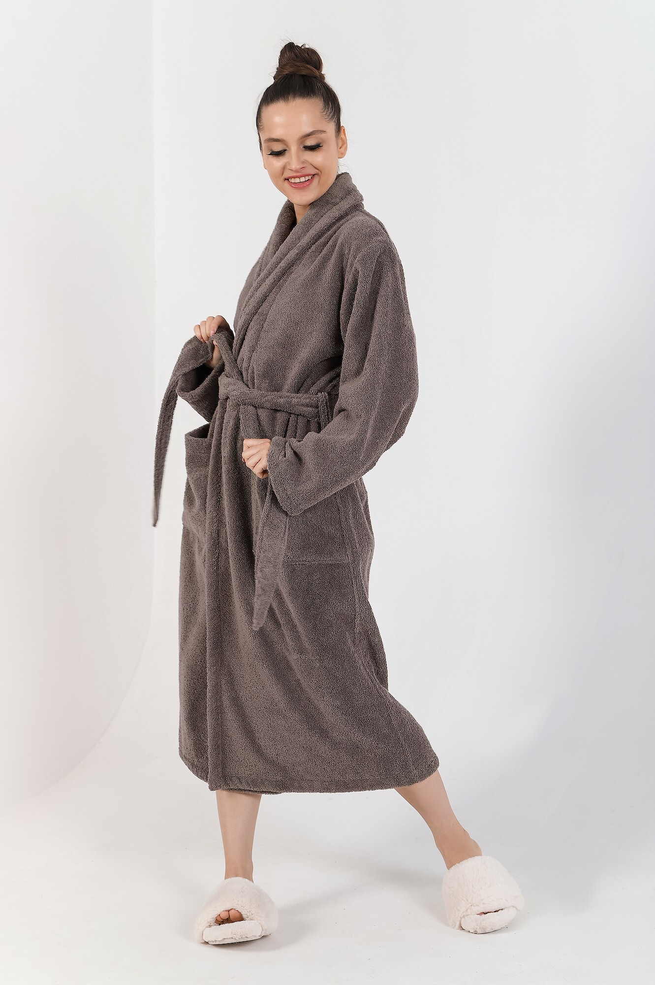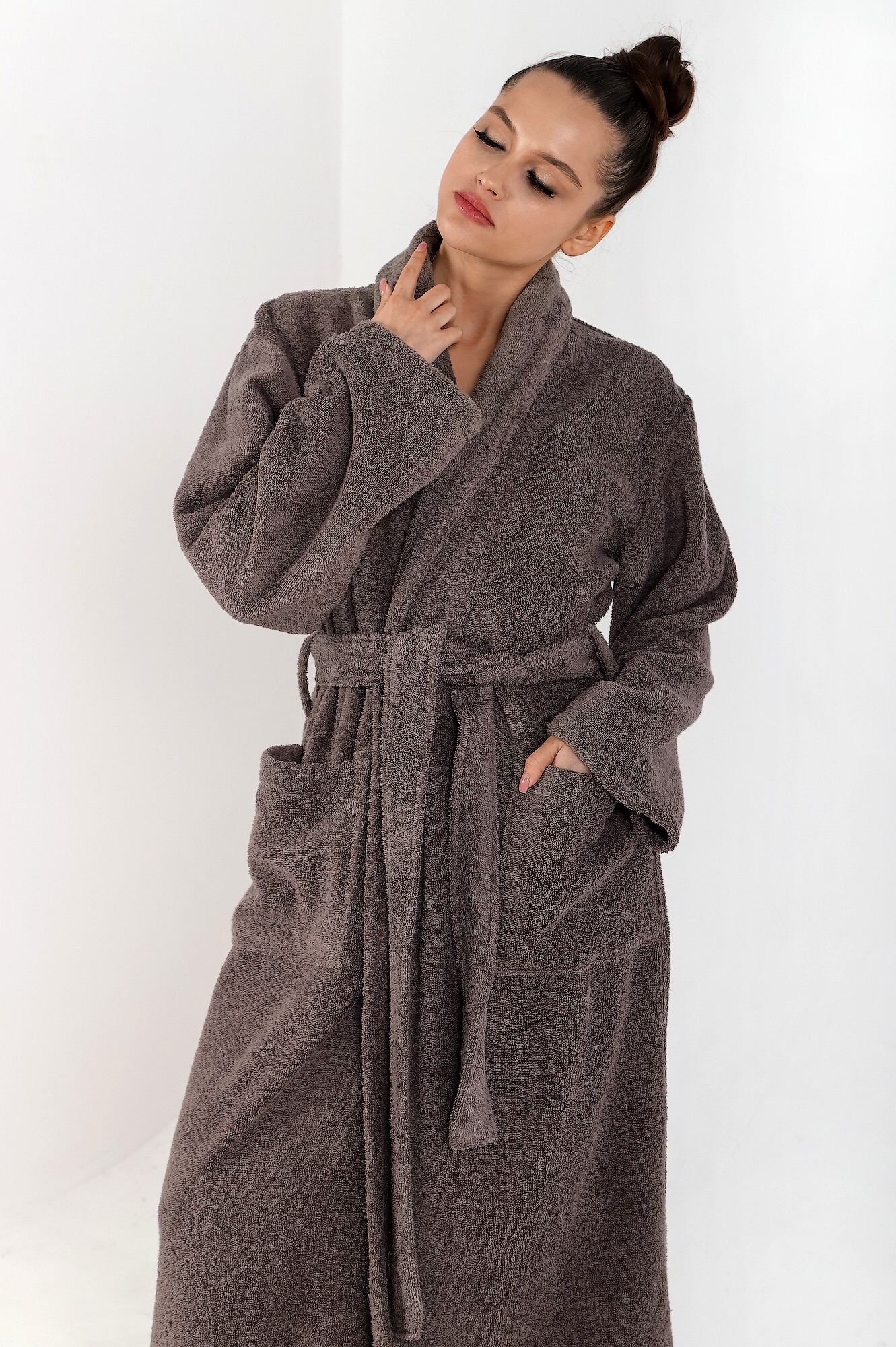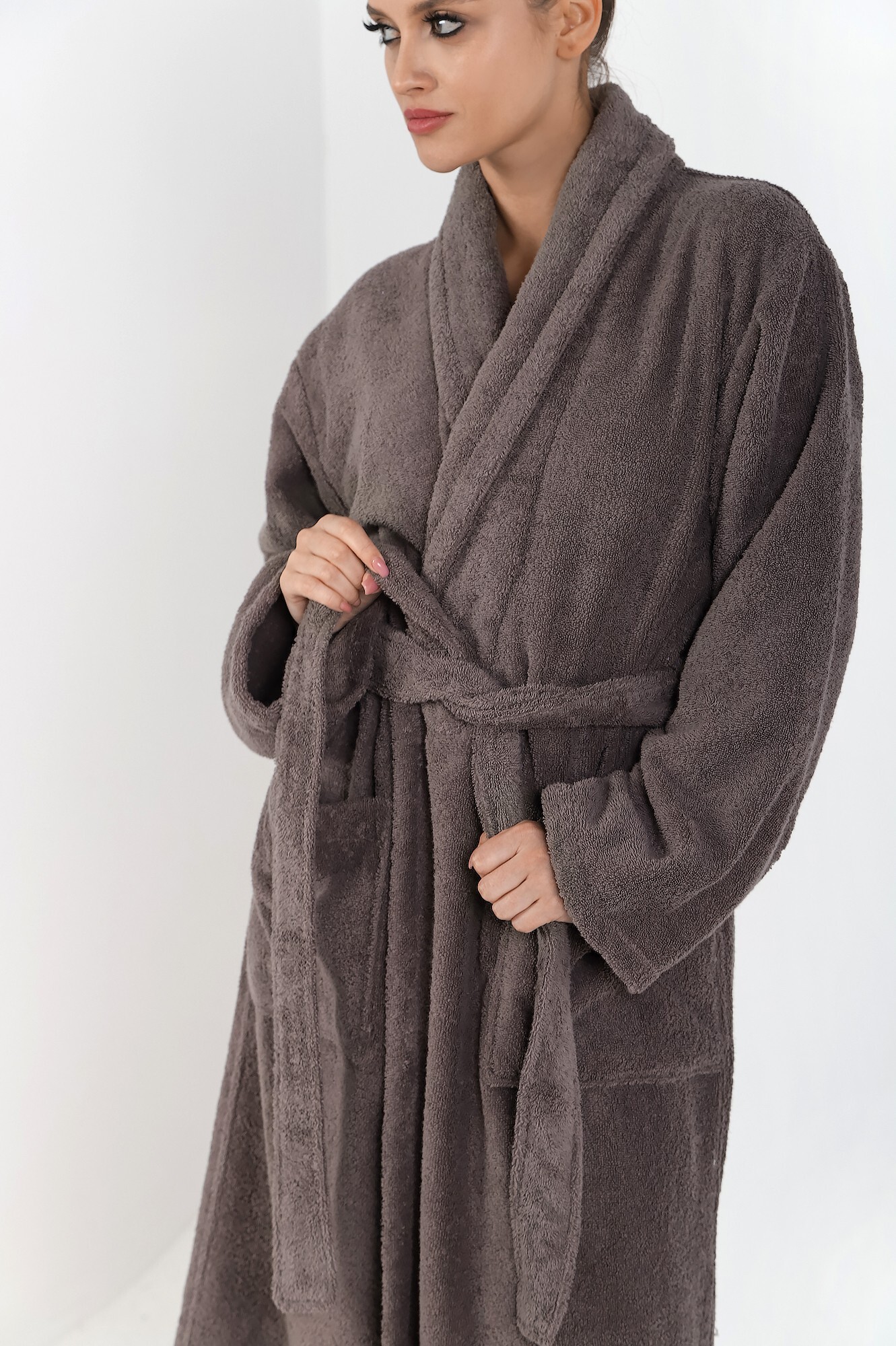 Женский халат из двустороннего махрового хлопкового полотна. Модель на запах, с поясом в шлёвках, с боковыми карманами, с воротником "шаль", с петлей-вешалкой по горловине спинки.