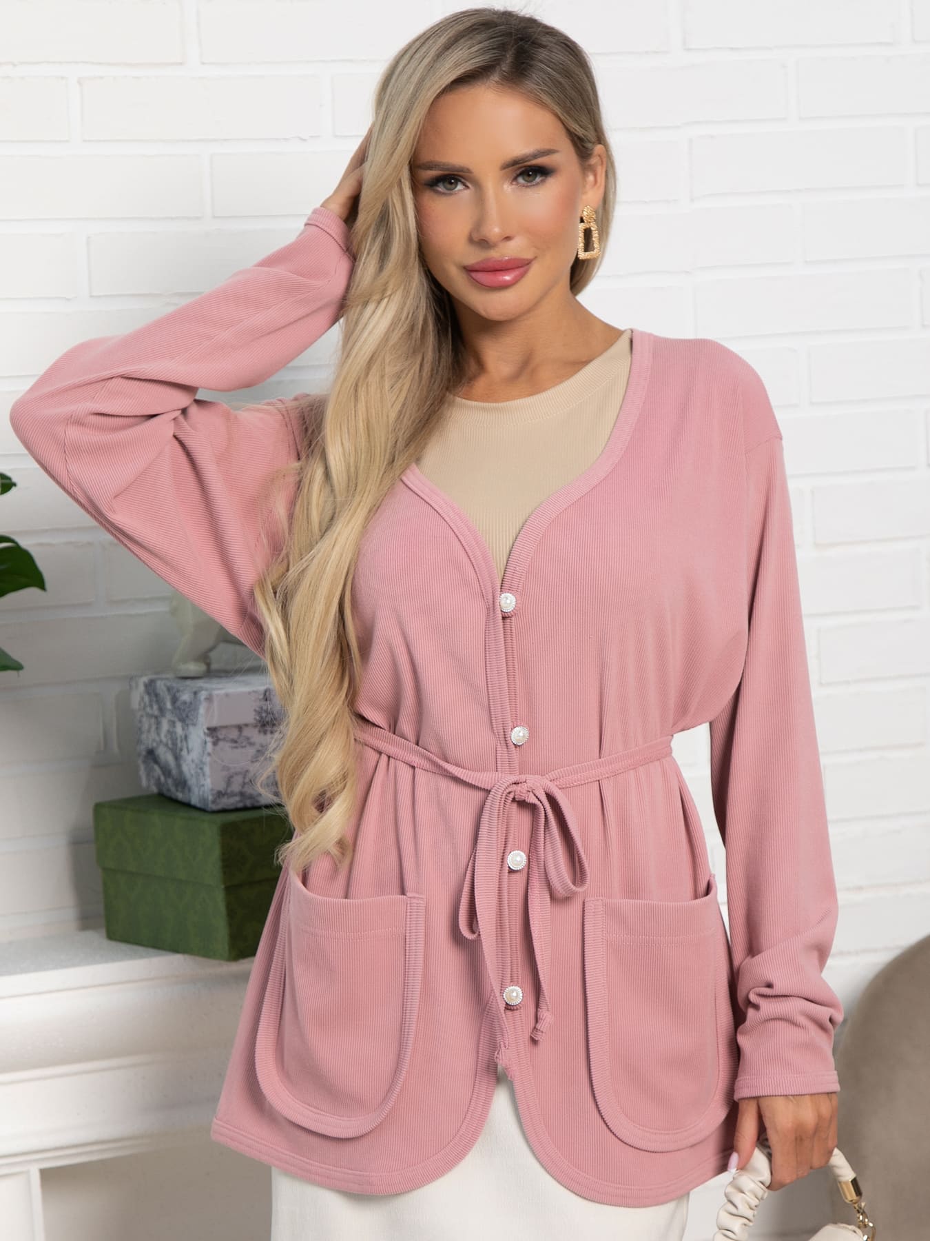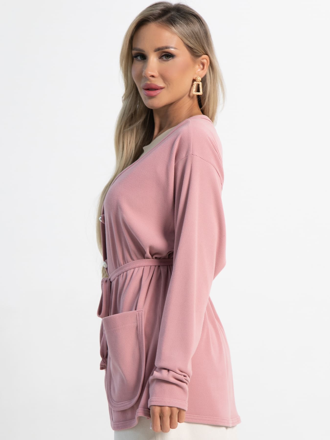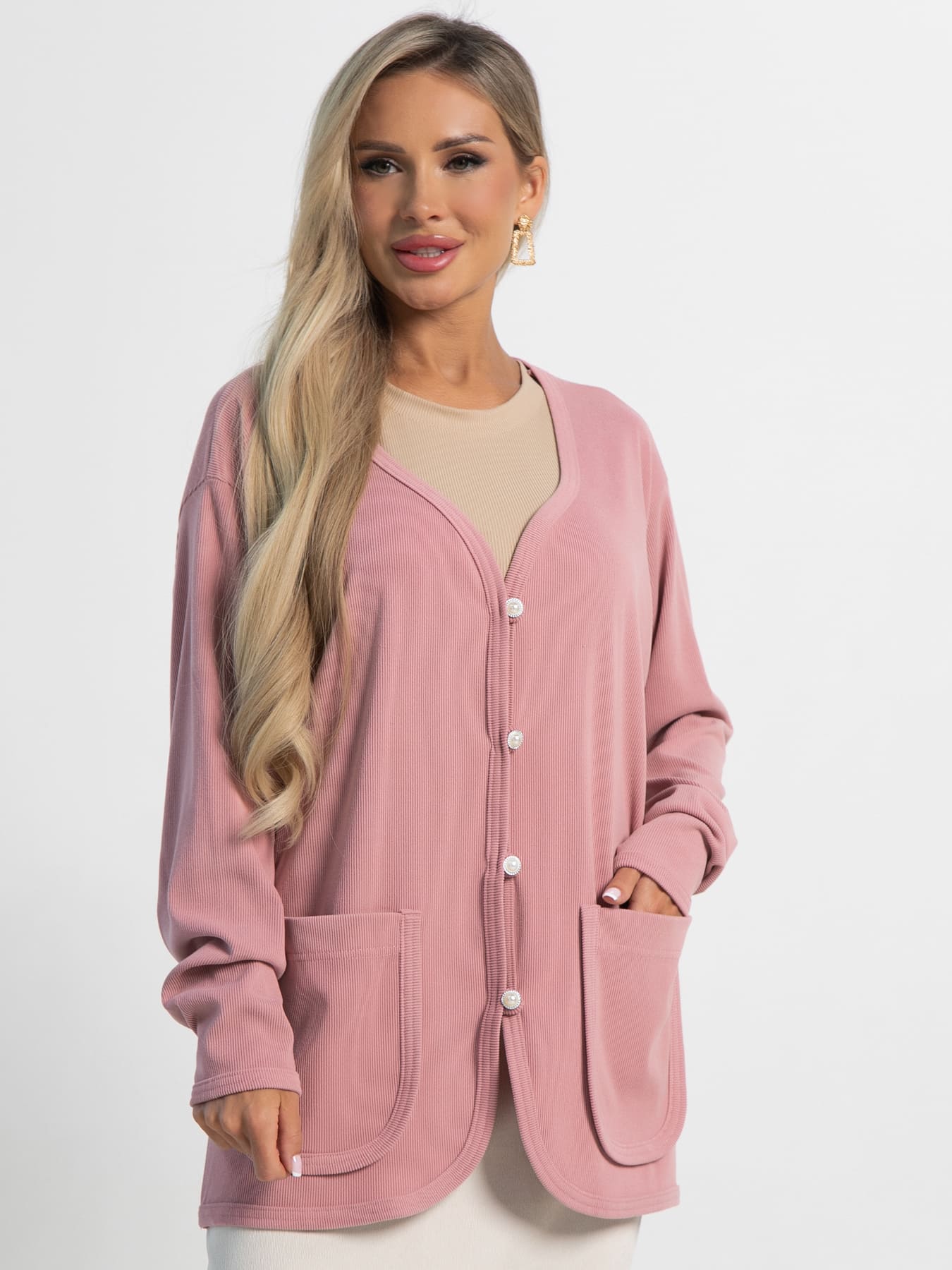Кардиган оверсайз размера в красивом пудровом цвете, свободного прямого силуэта до середины бёдер. В комплекте есть съёмный пояс шнур. Центральная застёжка на декоративные пуговицы и воздушные петли. Кардиган можно носить как самостоятельный элемент одежды, либо комплектовать с брюками или юбкой А-силуэта.