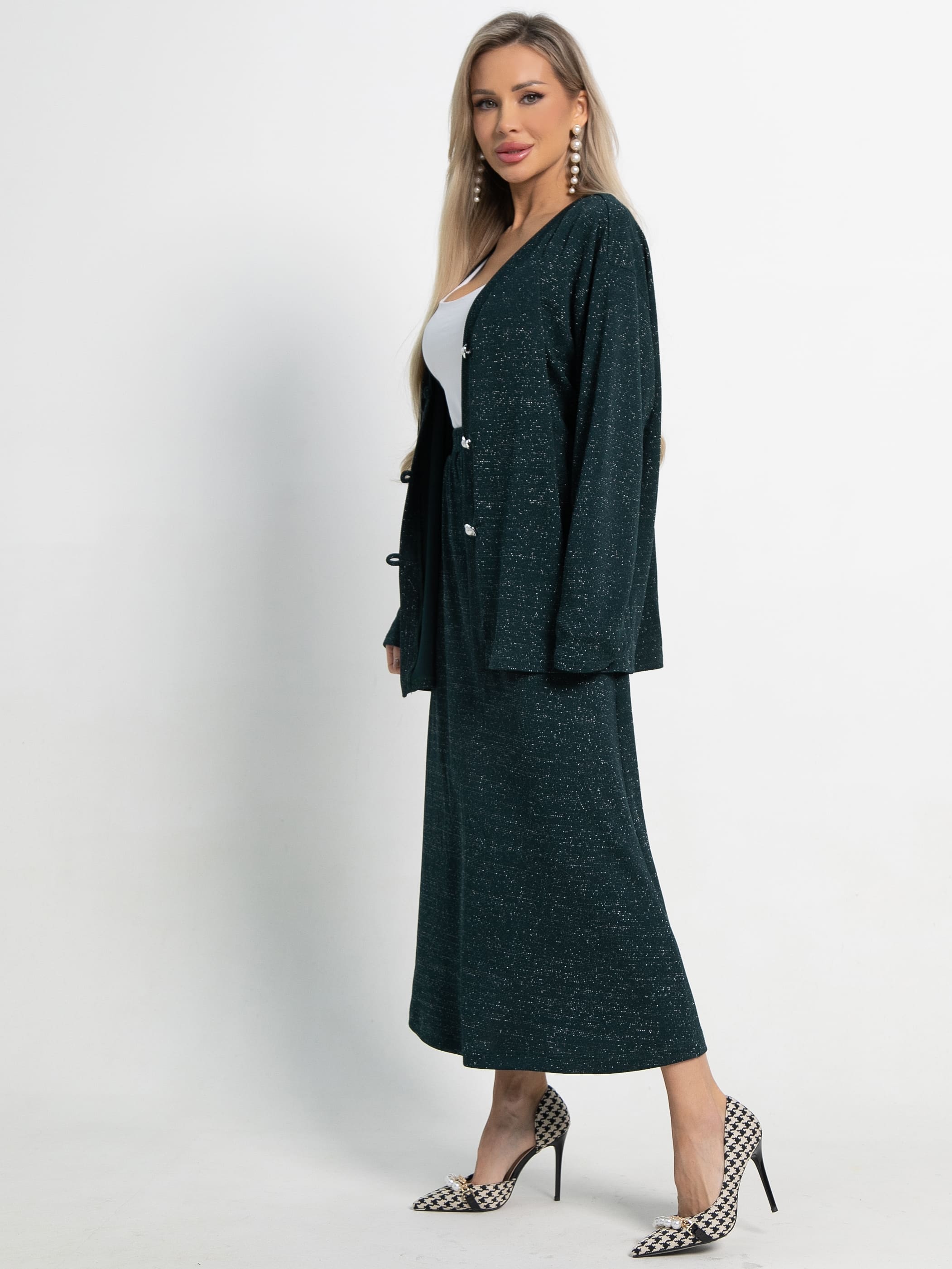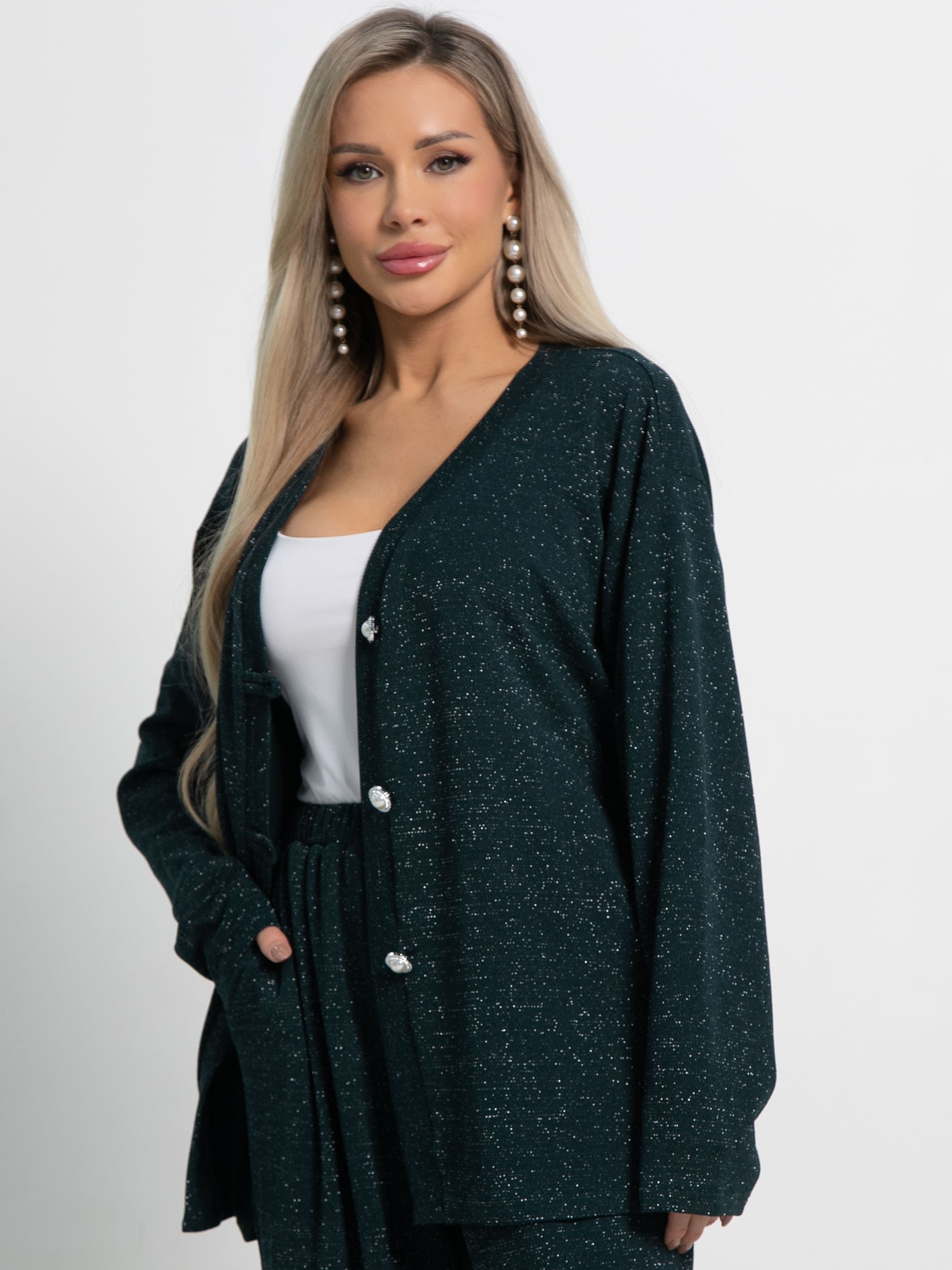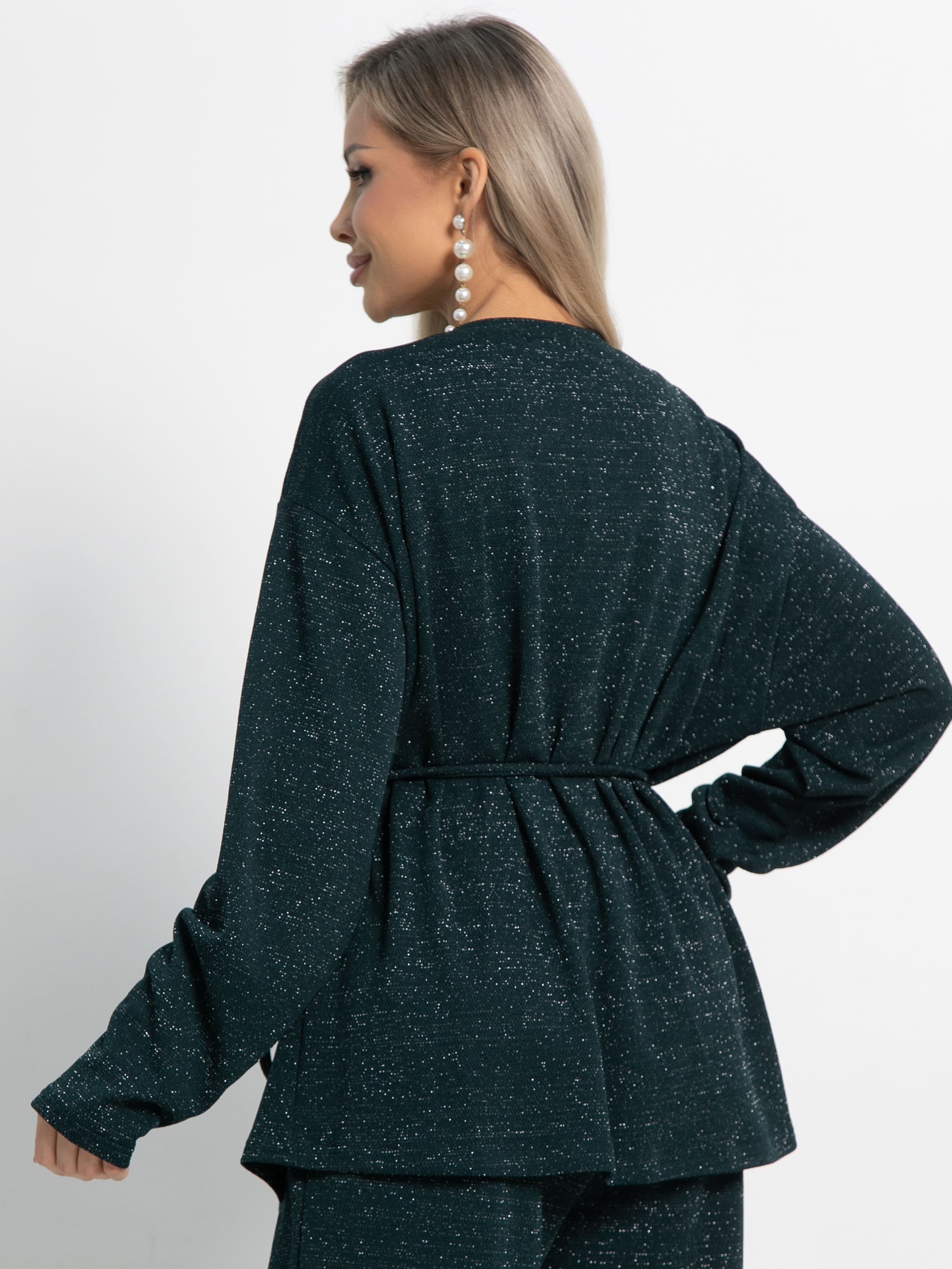 Кардиган свободного силуэта из трикотажного полотна с ниткой люрекс. В комплекте есть съёмный пояс шнур. Центральная застёжка на декоративные пуговицы и воздушные петли. Кардиган можно носить как самостоятельный элемент одежды, либо комплектовать с брюками или юбкой А-силуэта из того же трикотажного полотна.