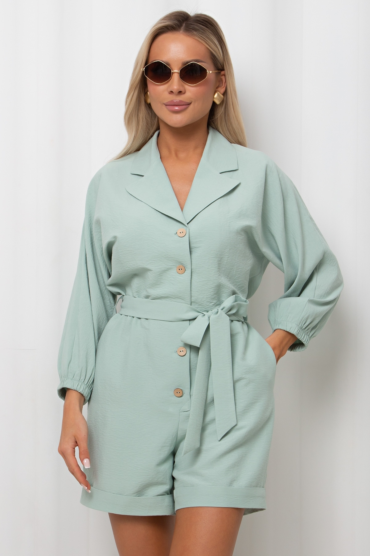 Стильный, летний комбинезон полуприлегающего силуэта с английским отложным воротником. По переду застежка на петли и пуговицы. Цельнокроенный рукав длиной 7/8 присобран на резинку. В боковых швах функциональные карманы. Модель отрезная по линии талии на резинке. Низ шорт оформлен притачными манжетами. Пояс из основной ткани в комплекте.