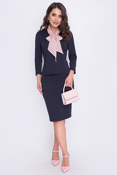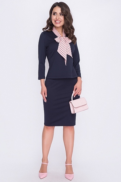 Комплект из трикотажного полотна джерси.Блузон полуприлегающего силуэта,по горловине притачной шарф из шифона в горох,завязывающийся на бант.