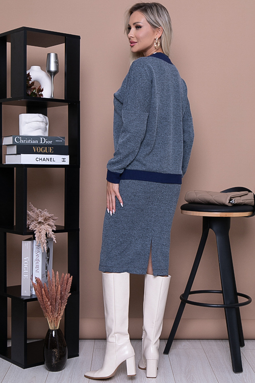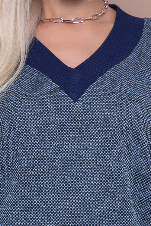 Комплект из джемпера и юбки из трикотажного полотна.Джемпер свободного силуэта со спущенным плечом и контрастной отделкой трикотажной рибаной.Юбка карандаш с разрезом в среднем шве спинки и эластичной резиной по поясу.