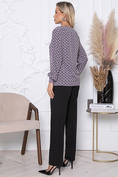 * Комплект состоящий из блузки и брюк. Блузка свободного силуэта из текстильного полотна, низ рукавов с манжетами из трикотажной рибаны.Брюки из костюмной ткани с высокой посадкой, зауженные к низу, по поясу эластичная резина .В среднем шве переда имитация гульфика. По бокам функциональные карманы. Заутюженные стрелки придают стройность фигуре.
