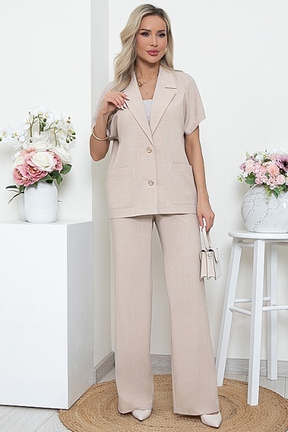 Комплект из легкой костюмной ткани.Жакет свободного силуэта с цельнокроеными рукавами, центральной застежкой на две пуговицы и удобными функциональными карманами по переду.Воротник отложной с лацканами.Брюки свободного,прямого силуэта, удобную посадку по талии обеспечивает эластичный пояс,который по бокам и спинке собран на резину,в боковых швах функциональные карманы.