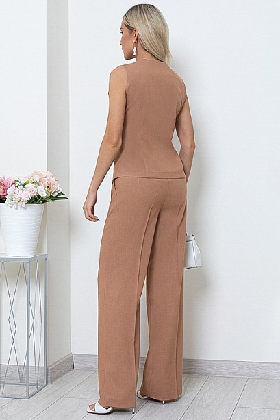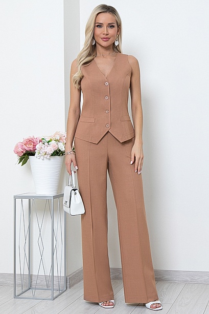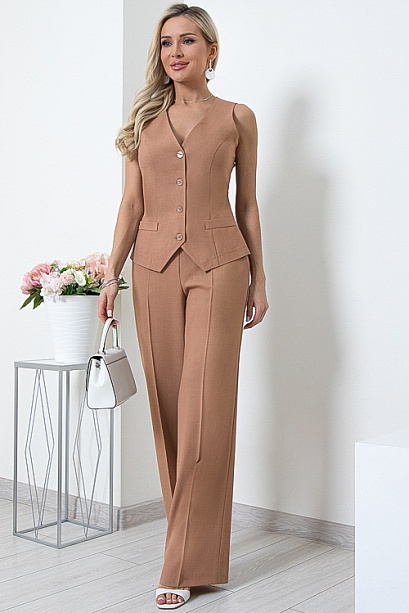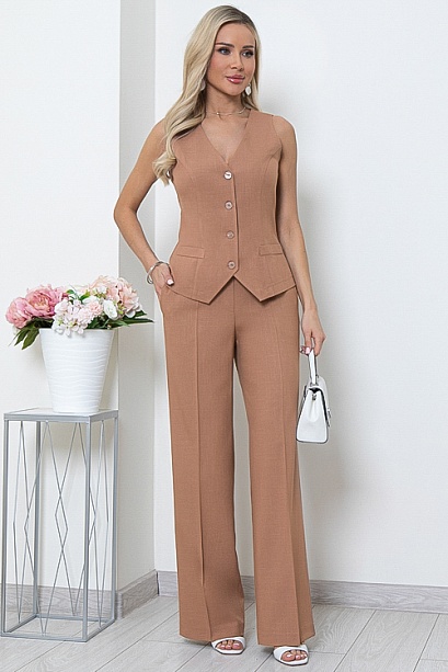 * Комплект из комфортной,качественной костюмной ткани состоящий из жилета и брюк. Жилет полуприлегающего силуэта с центральной застежкой на пуговицы на подкладе.Брюки прямые,свободные с заутюженными стрелками,по бокам функциональные карманы.Пояс притачной с эластичной резиной по спинке.