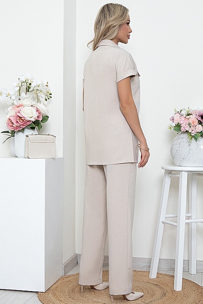 Комплект брючный двух предметный.Брюки с высокой посадкой, прямого силуэта, по поясу эластичная резина,без застежки с имитацией гульфика.Жакет свободного силуэта с центральной застежкой на пуговицы и разрезами в боковых швах.Рукава цельнокроеные с отложной манжетой.Воротник отложной на стойке.Пояс из основной ткани в комплекте.