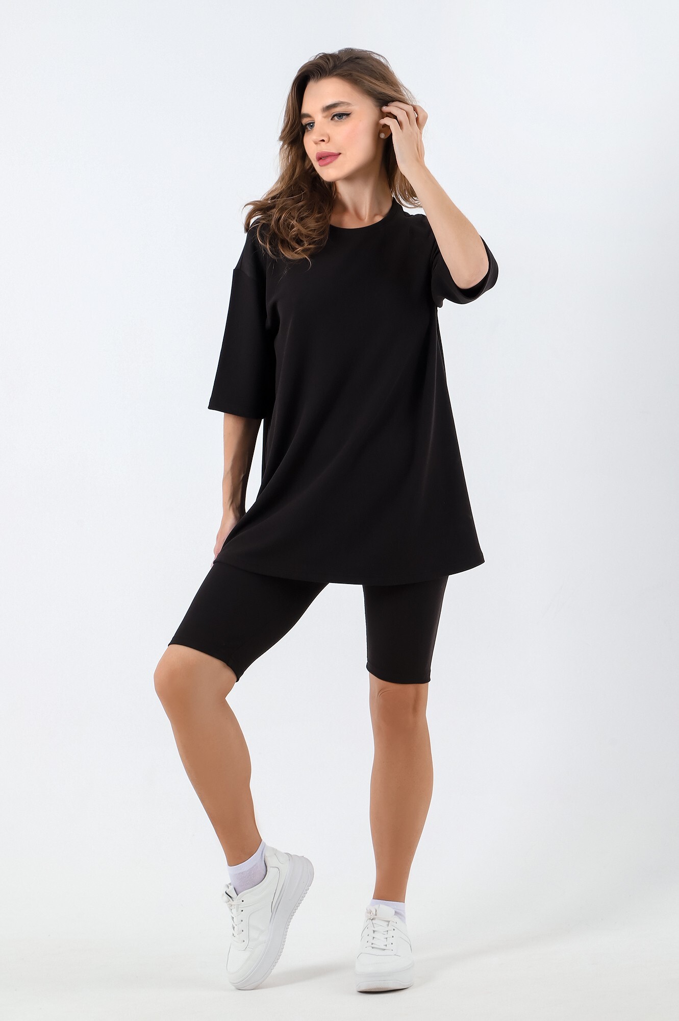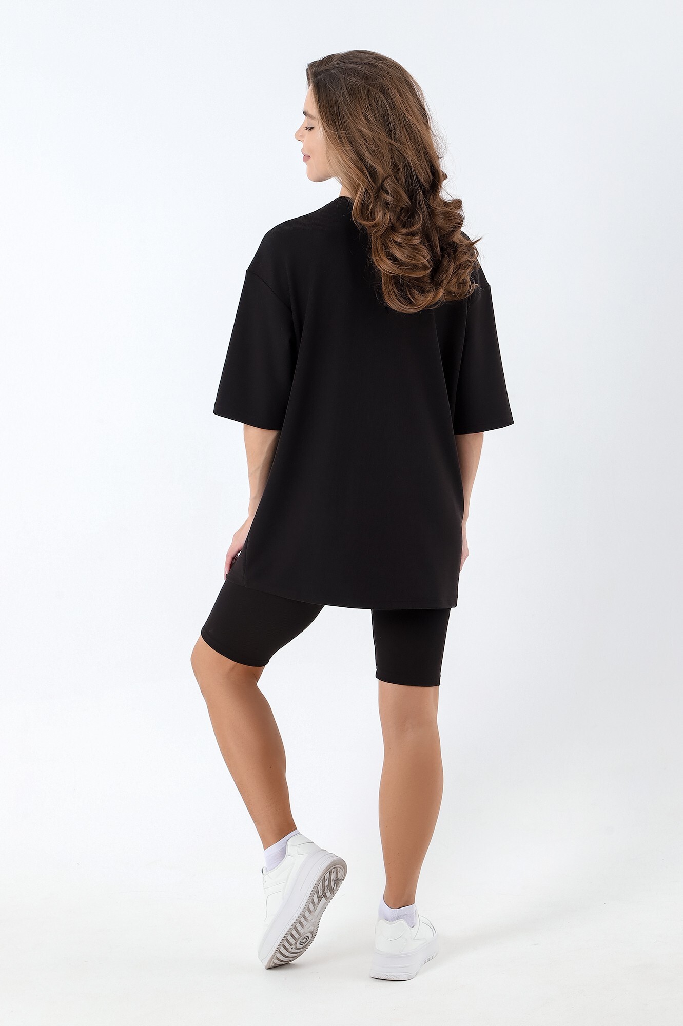 Костюм женский из гладкокрашенного трикотажного полотна в рубчик («лапша»), состоящий из футболки и леггинсов. Футболка – удлиненная, свободного покроя, со спущенной, линией плеча, короткими втачными рукавами, горловиной овальной формы, обработанной втачной планкой.Леггинсы – длиной до колен, с эластичной тесьмой по талии.