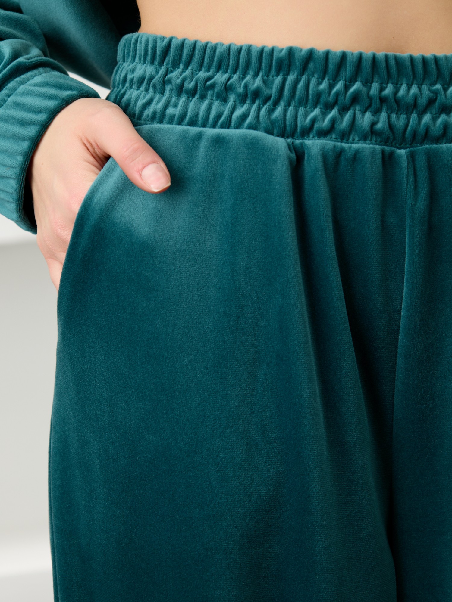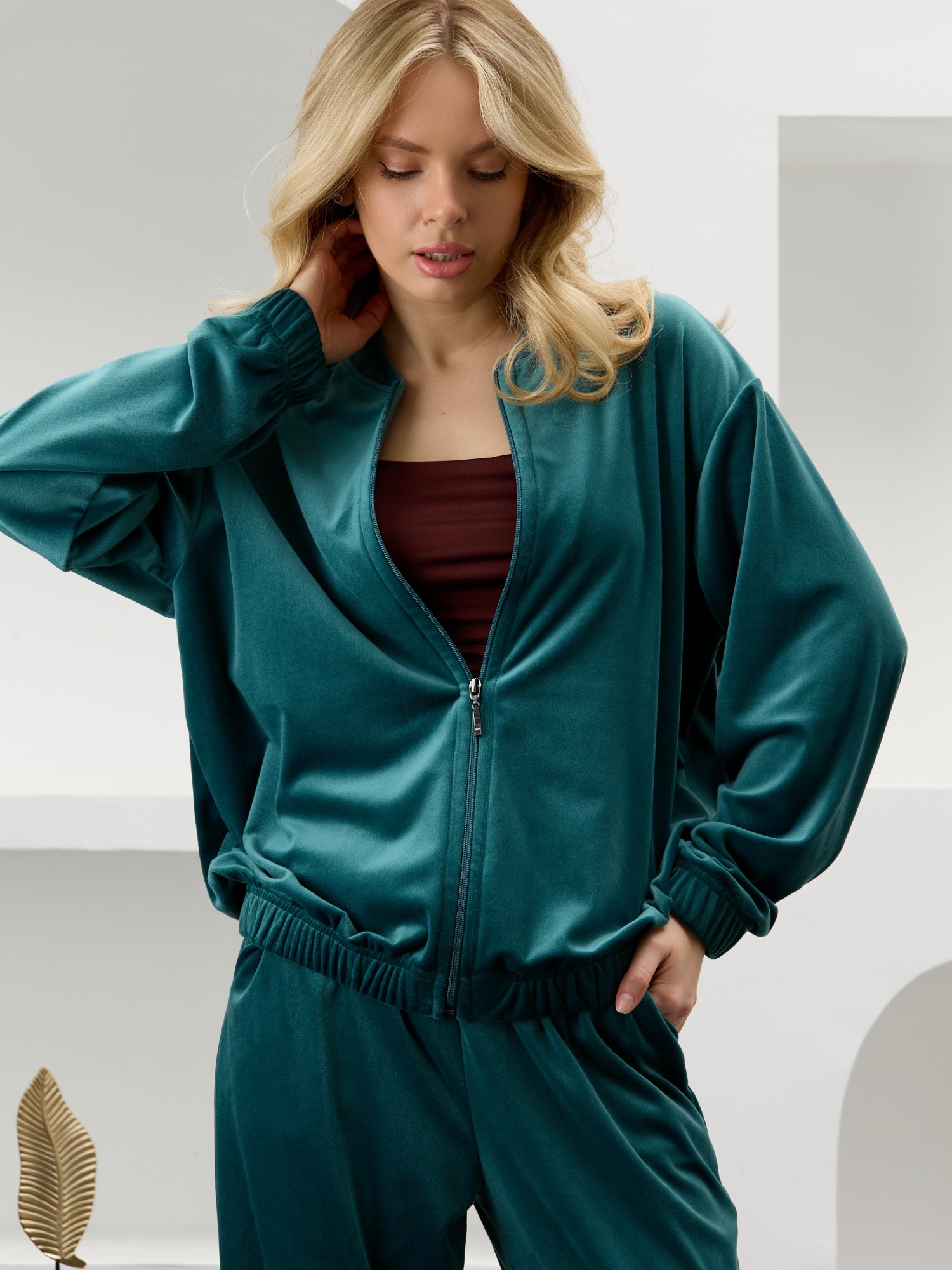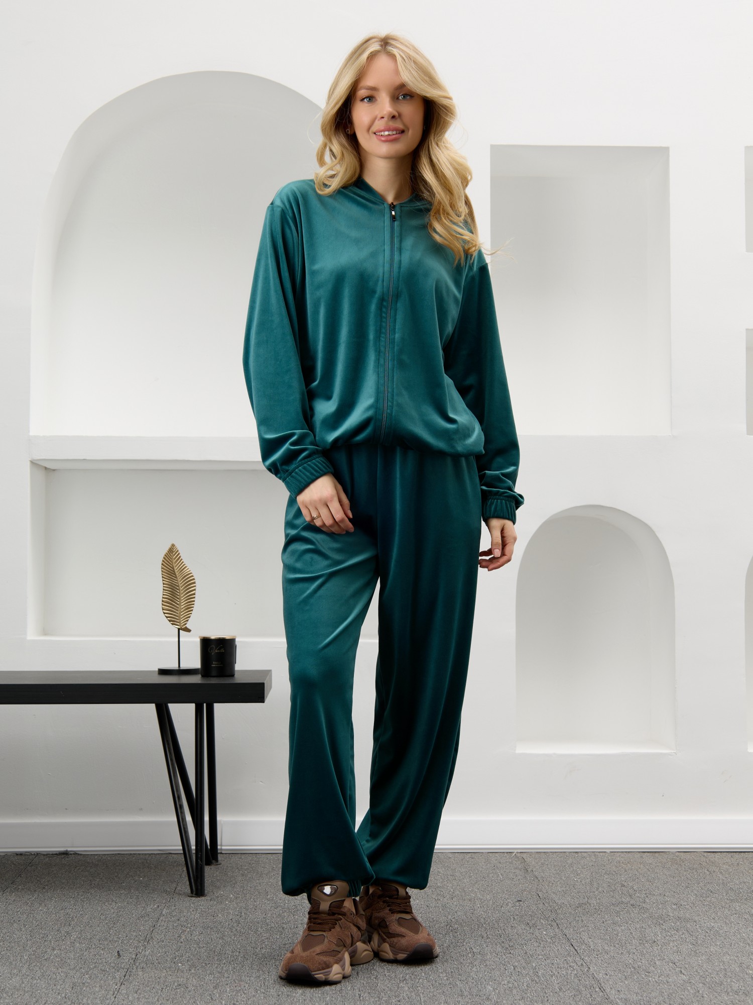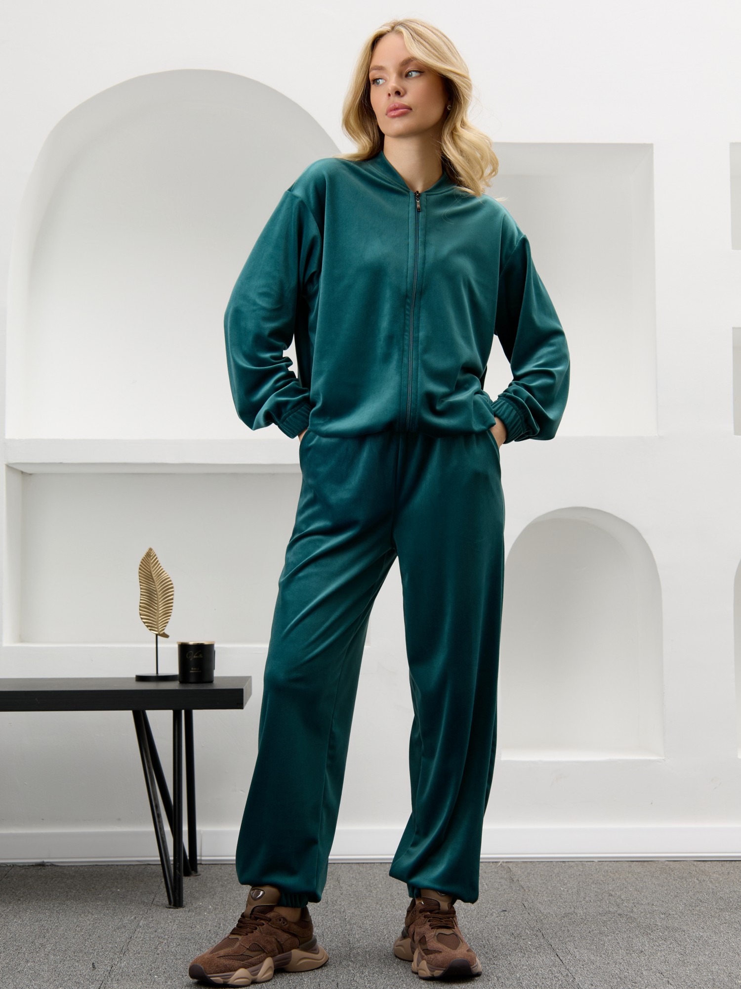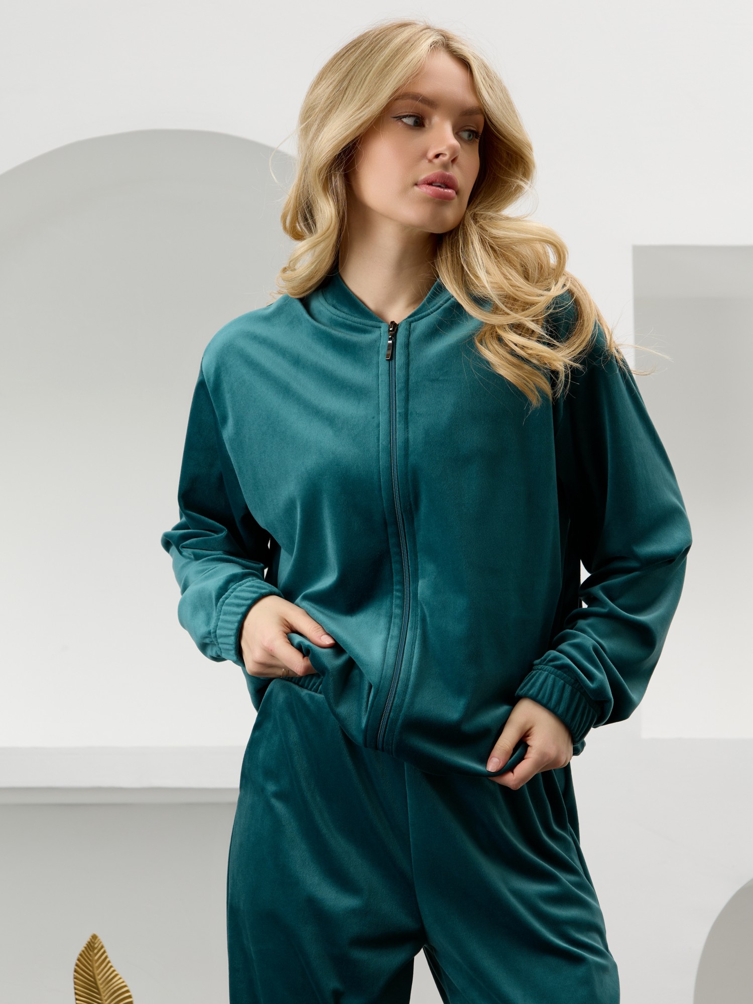 Костюм молодежный из гладкокрашенного полотна «велюр-стрейч», Куртка-бомбер прямого силуэта, свободная, с длинными втачными рукавами, горловиной овальной формы, обработанной втачной планкой, центральной бортовой застежкой на тесьму «молния». Низ изделия и нижние срезы рукавов обработаны подгибкой с вложением широкой эластичной тесьмы.Брюки – длинные, с карманами в боковых швах, на притачном поясе с эластичной тесьмой внутри. Нижние срезы обработаны подгибкой с вложением эластичной тесьмы.