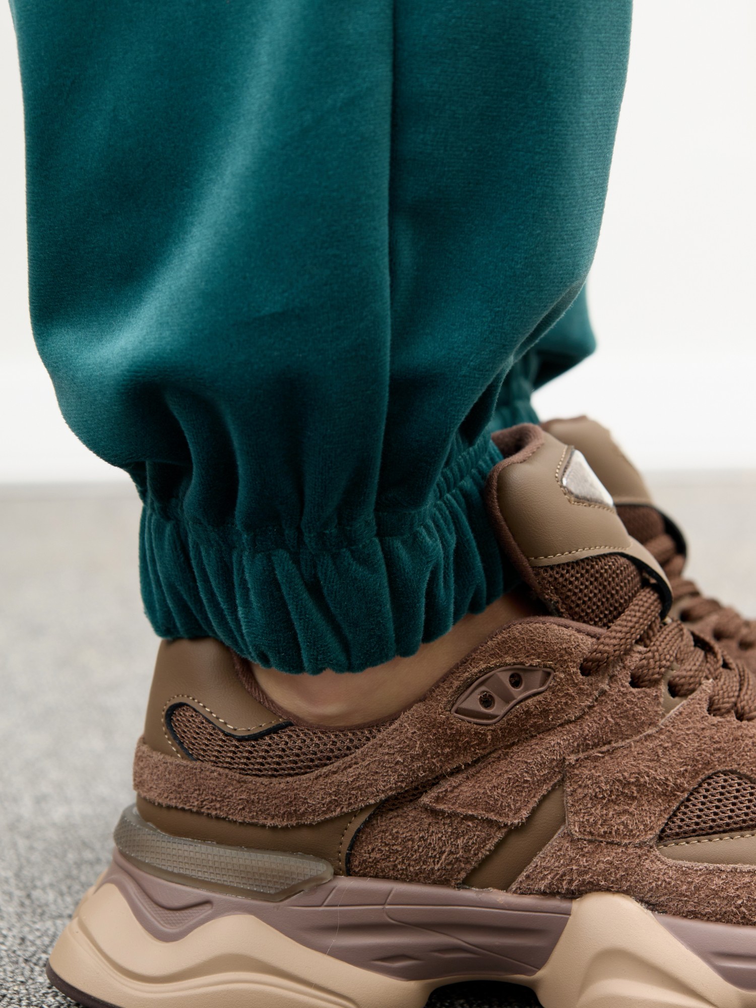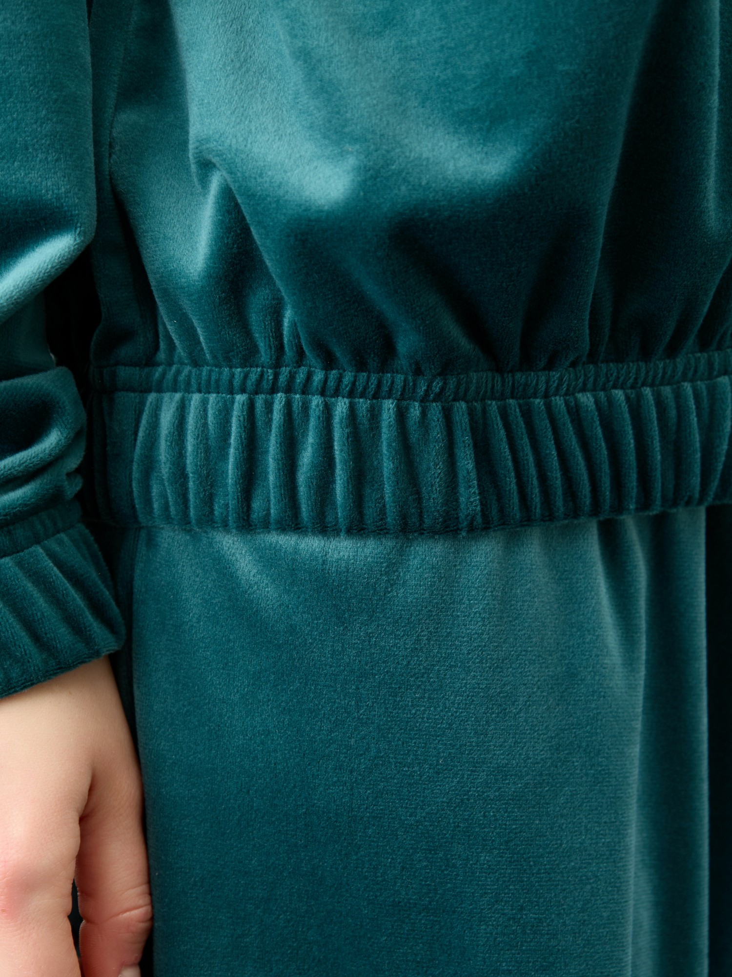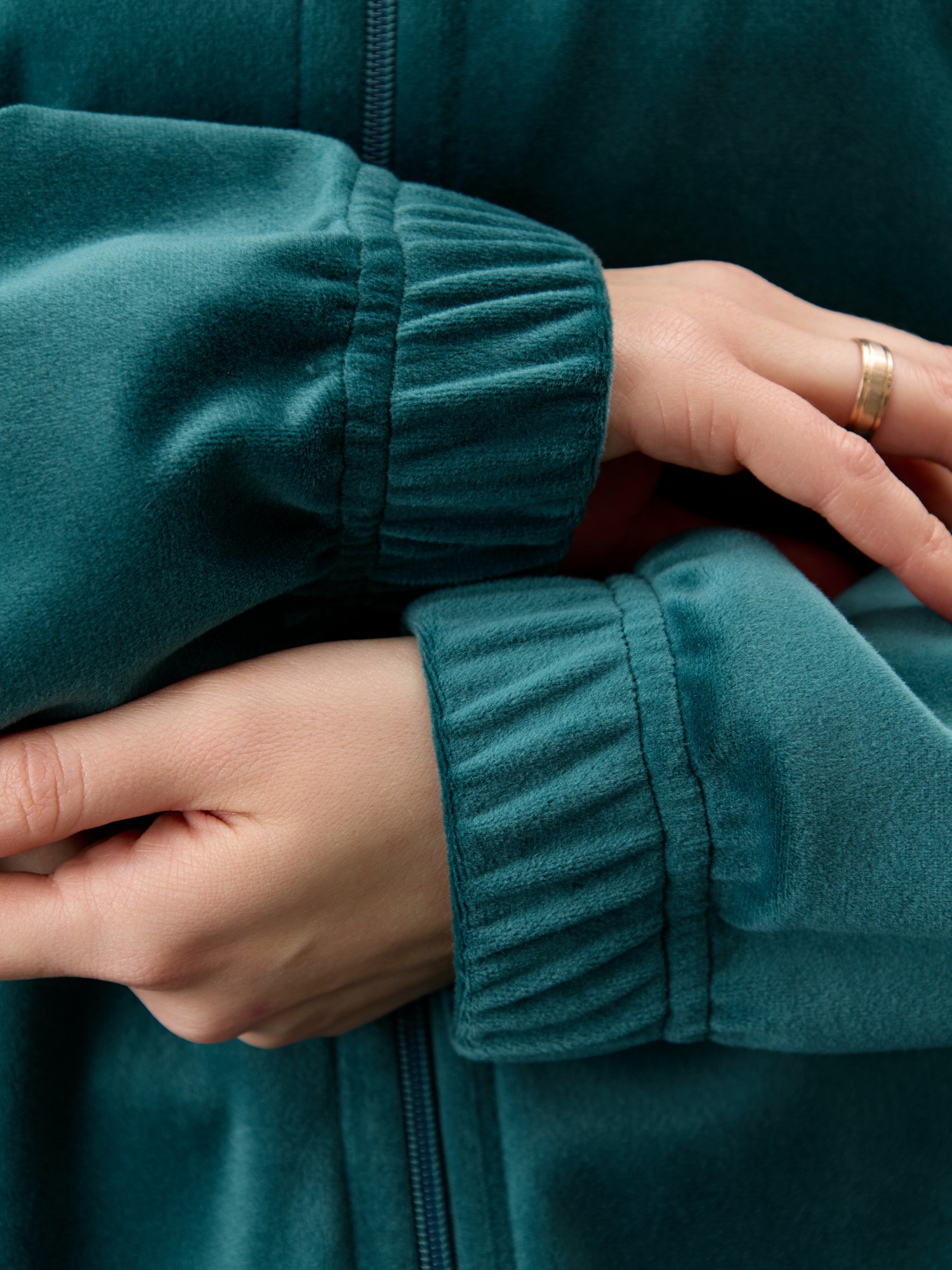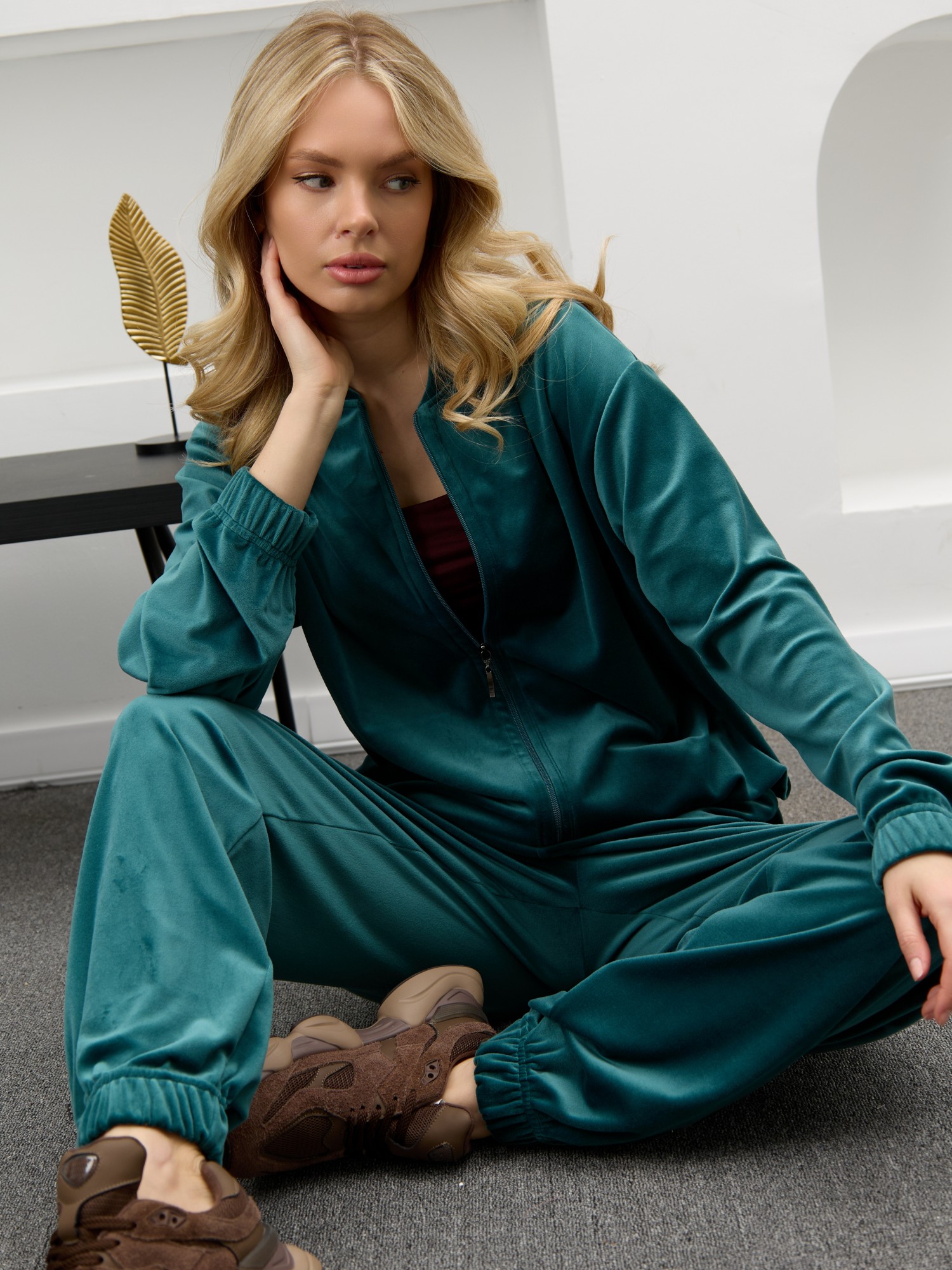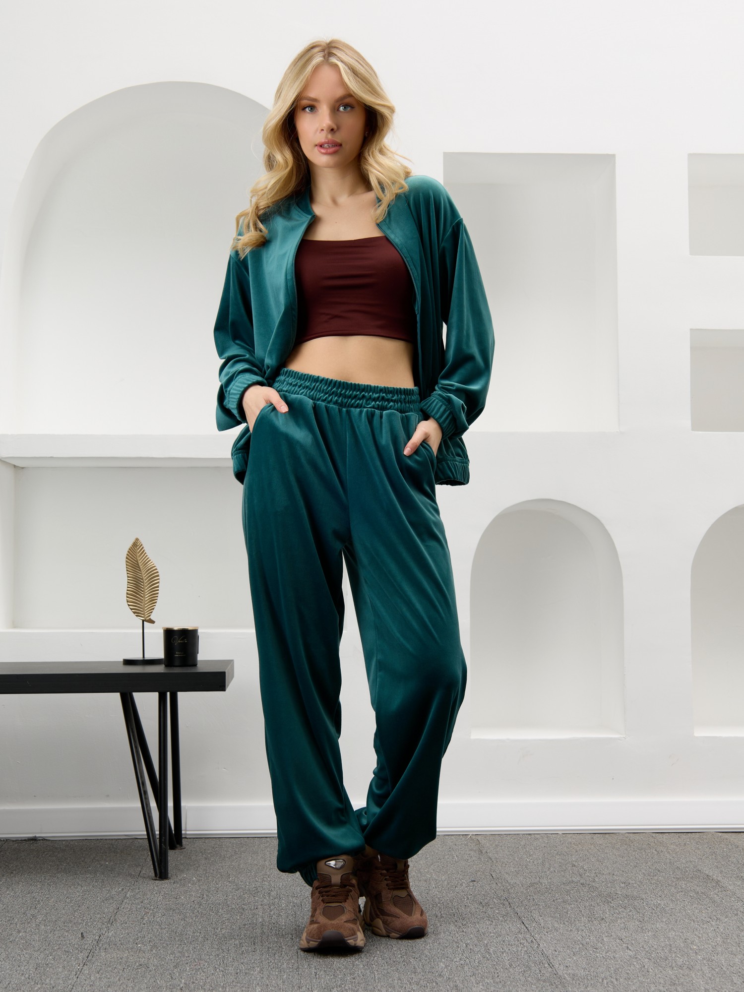 Костюм молодежный из гладкокрашенного полотна «велюр-стрейч», Куртка-бомбер прямого силуэта, свободная, с длинными втачными рукавами, горловиной овальной формы, обработанной втачной планкой, центральной бортовой застежкой на тесьму «молния». Низ изделия и нижние срезы рукавов обработаны подгибкой с вложением широкой эластичной тесьмы.Брюки – длинные, с карманами в боковых швах, на притачном поясе с эластичной тесьмой внутри. Нижние срезы обработаны подгибкой с вложением эластичной тесьмы.