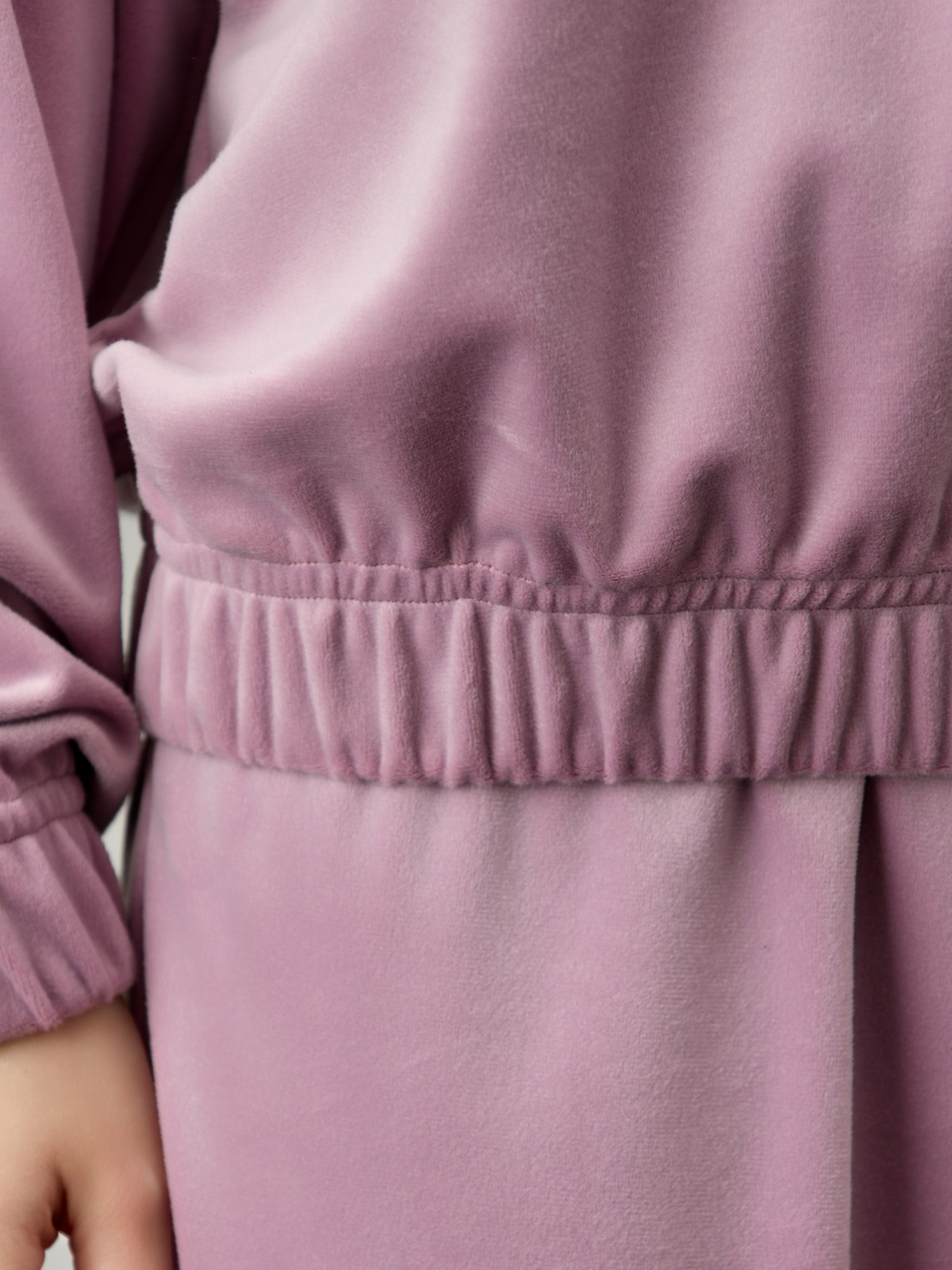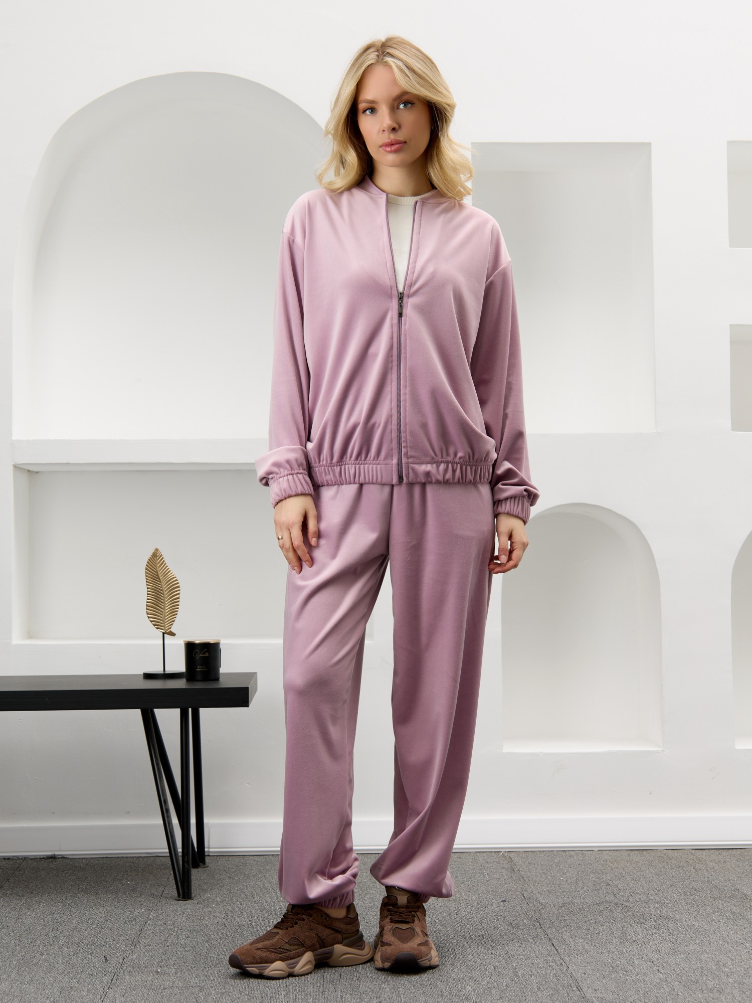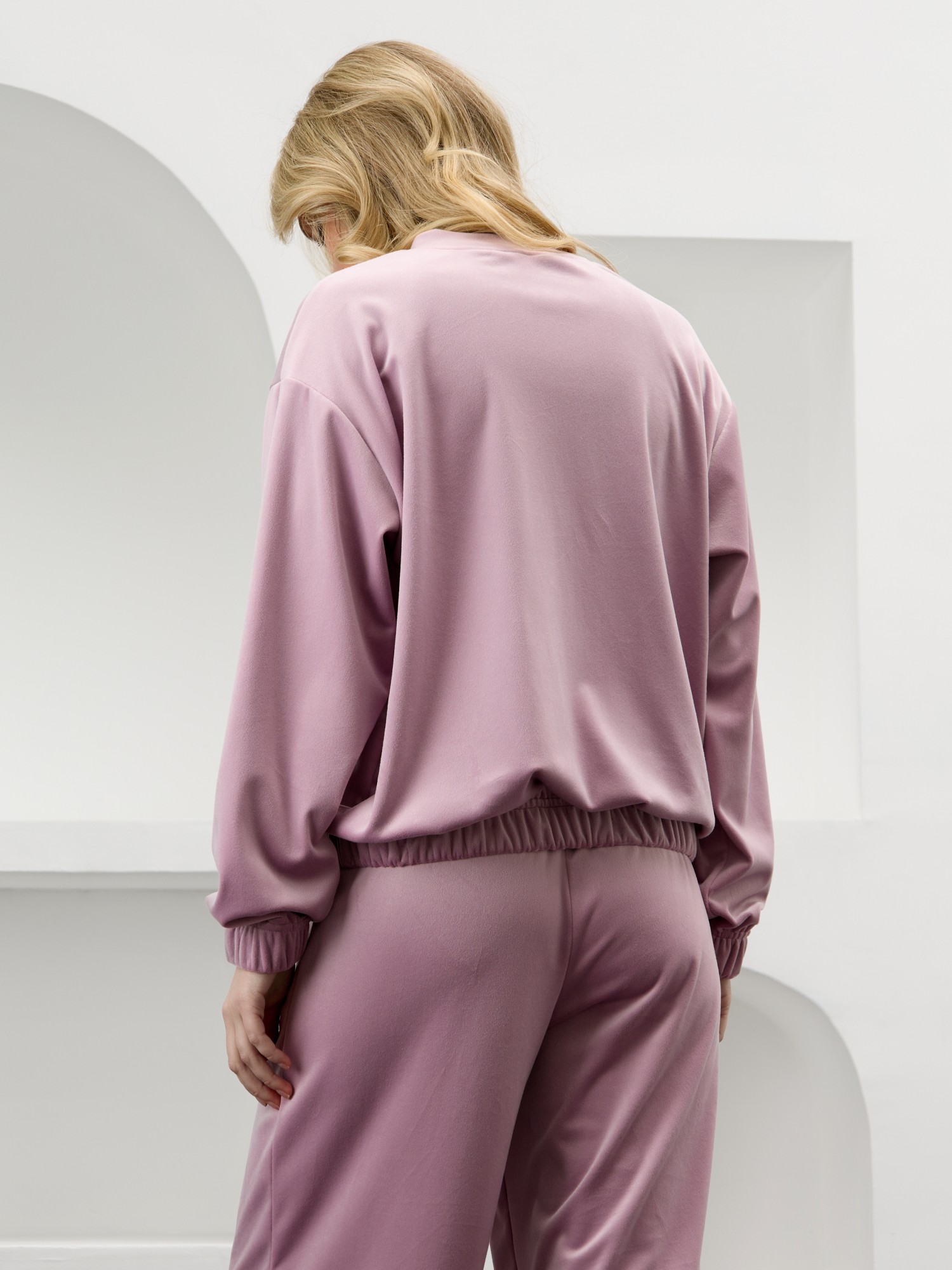Костюм молодежный из гладкокрашенного полотна «велюр-стрейч», Куртка-бомбер прямого силуэта, свободная, с длинными втачными рукавами, горловиной овальной формы, обработанной втачной планкой, центральной бортовой застежкой на тесьму «молния». Низ изделия и нижние срезы рукавов обработаны подгибкой с вложением широкой эластичной тесьмы.Брюки – длинные, с карманами в боковых швах, на притачном поясе с эластичной тесьмой внутри. Нижние срезы обработаны подгибкой с вложением эластичной тесьмы.