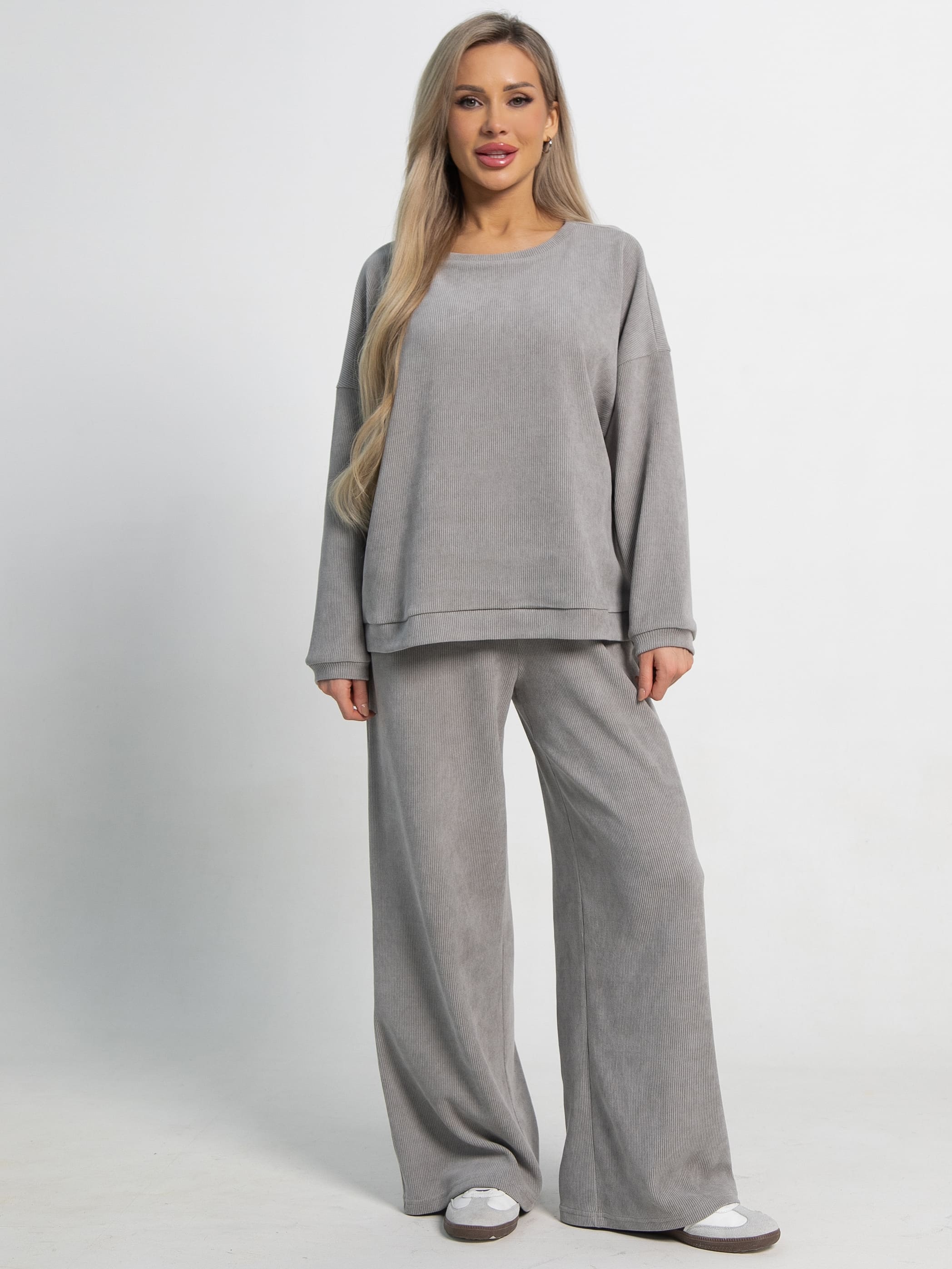Ваш идеальный выбор для комфортных образов — костюм свободного кроя в сером цвете! Отличительная особенность этой модели — широкие брюки палаццо. Свободный крой верха и спущенный рукав создают ощущение комфорта, что особенно актуально в прохладную погоду. Брюки по талии на резинке обеспечивают дополнительный комфорт. По боковым швам расположены карманы. Этот комплект идеально подойдет тем, кто ценит свободу движений и уют без лишних деталей.