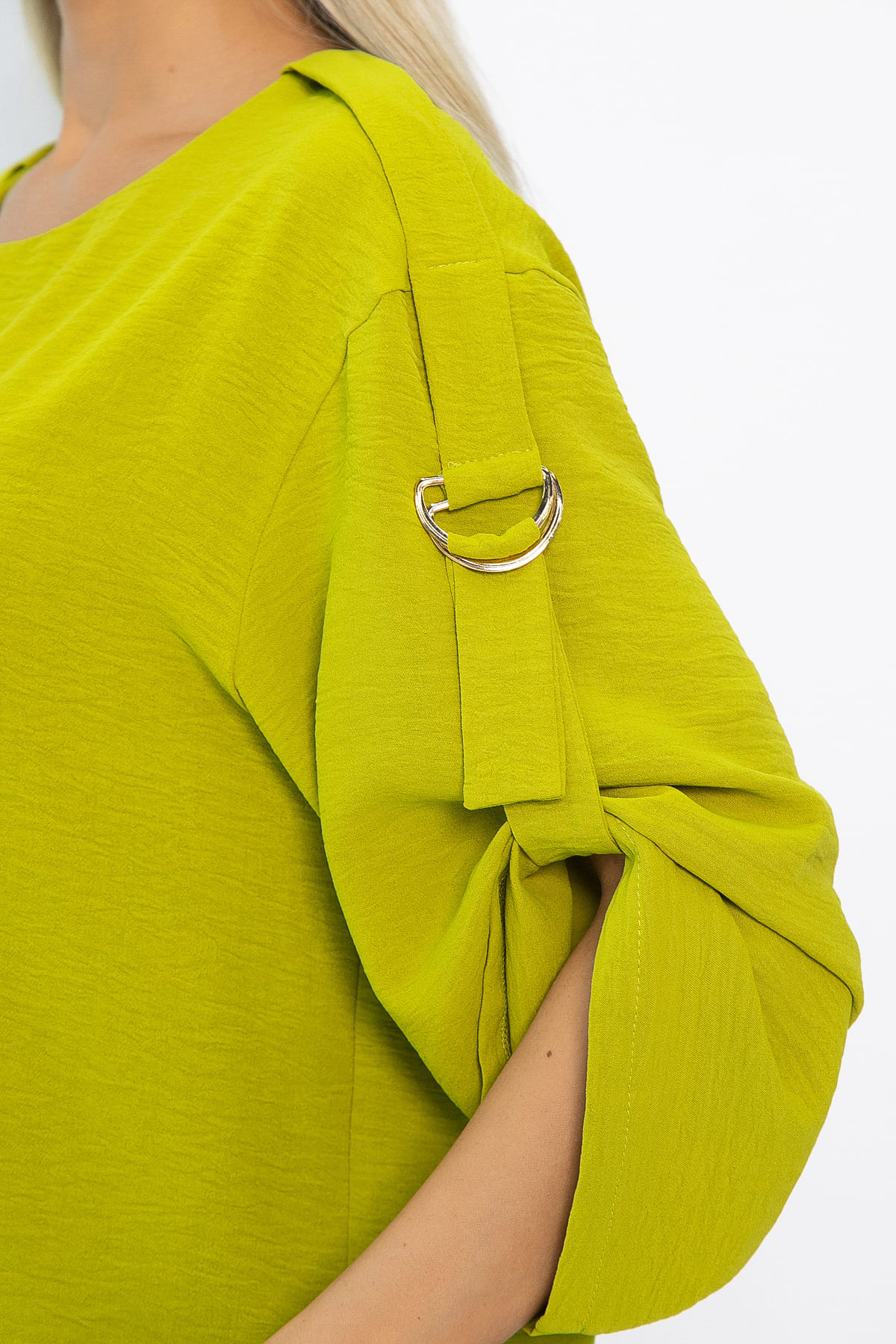 Летний женский костюм в оттенке зелёное яблоко — это универсальное решение для любого случая. Он сочетает в себе всё необходимое для создания идеального летнего образа. Брюки прямого кроя обеспечивают свободу движений и комфорт. Резинка на талии обеспечивает удобную посадку, а карманы по бокам добавляют практичности. Блузка с асимметричным кроем украшена декоративными элементами: полукольцами под золото на рукавах и хлястиками для регулирования длины. Это незаменимый выбор для тех, кто ценит лёгкость, элегантность и функциональность в одном комплекте.