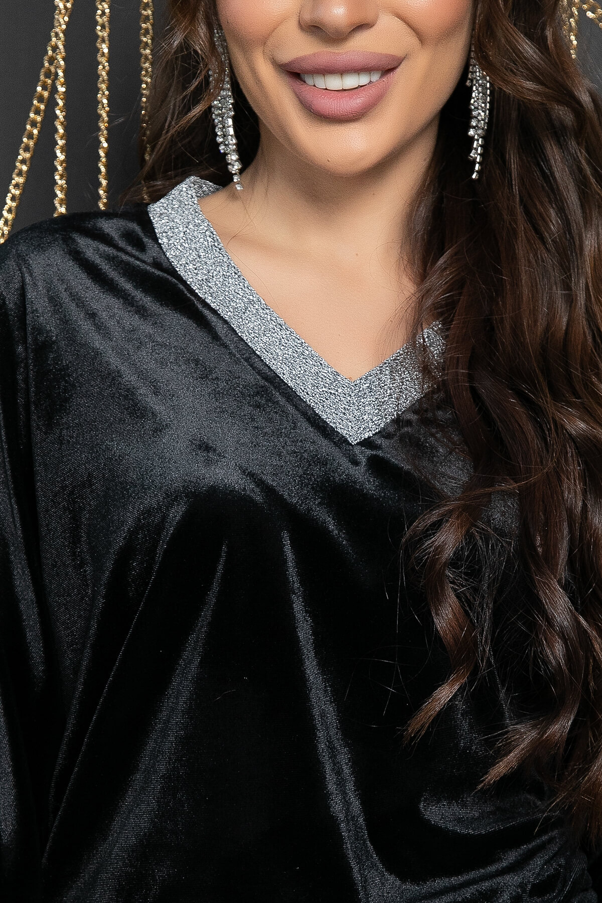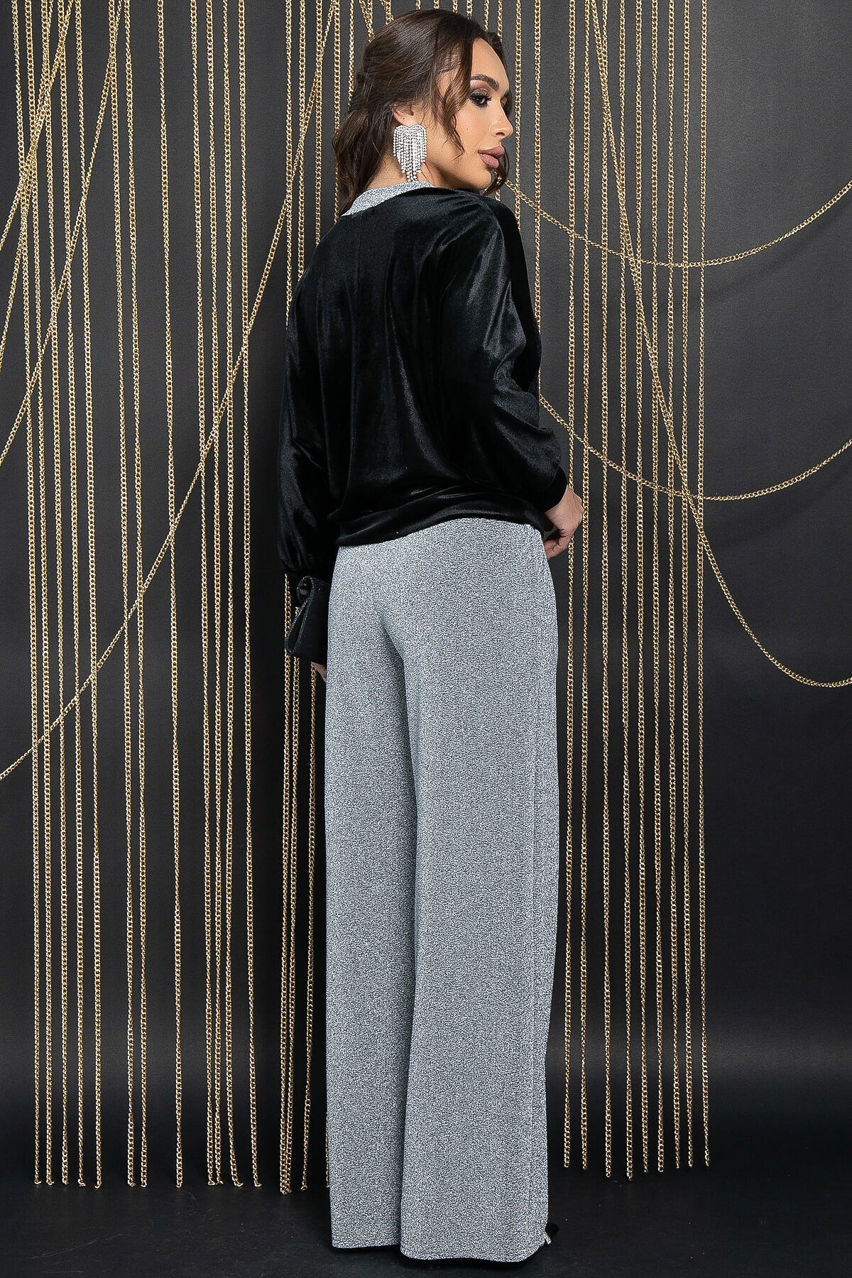 Этот восхитительный костюм — настоящая находка для любителей комфорта. Джемпер из бархата, свободного силуэта, с V-образной горловиной — это воплощение уюта и стиля. Мерцающие брюки выполнены из той же ткани, что и горловина у джемпера, что придаёт образу завершённость. Этот костюм станет прекрасным выбором как для повседневной носки, так и для торжественных случаев.