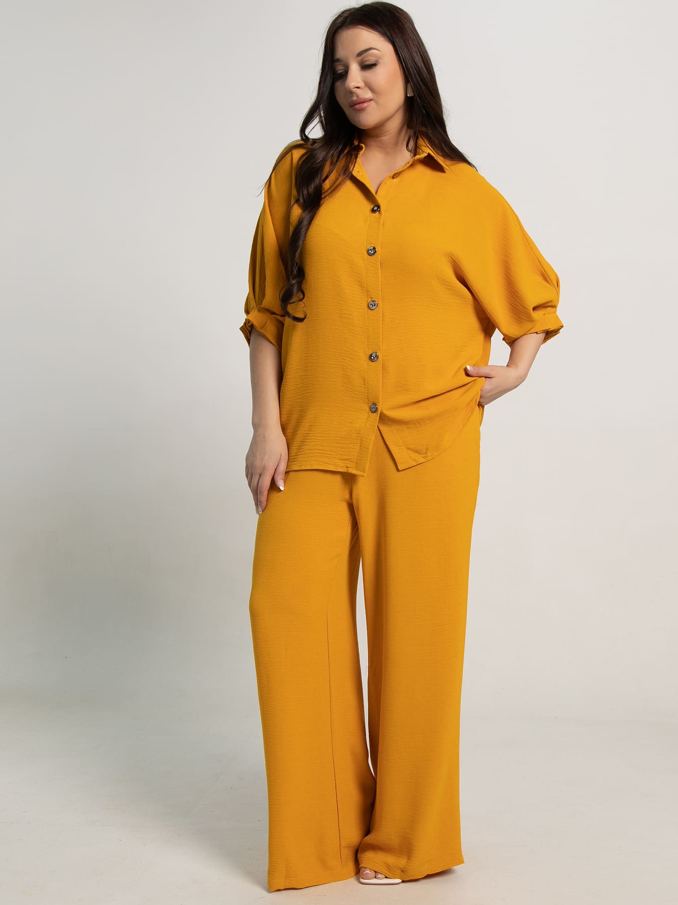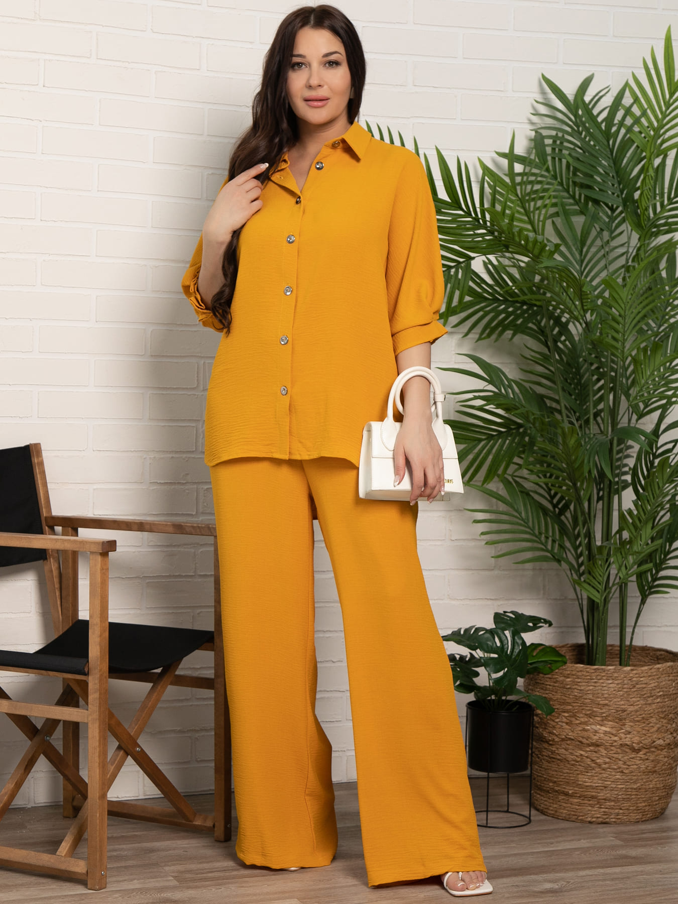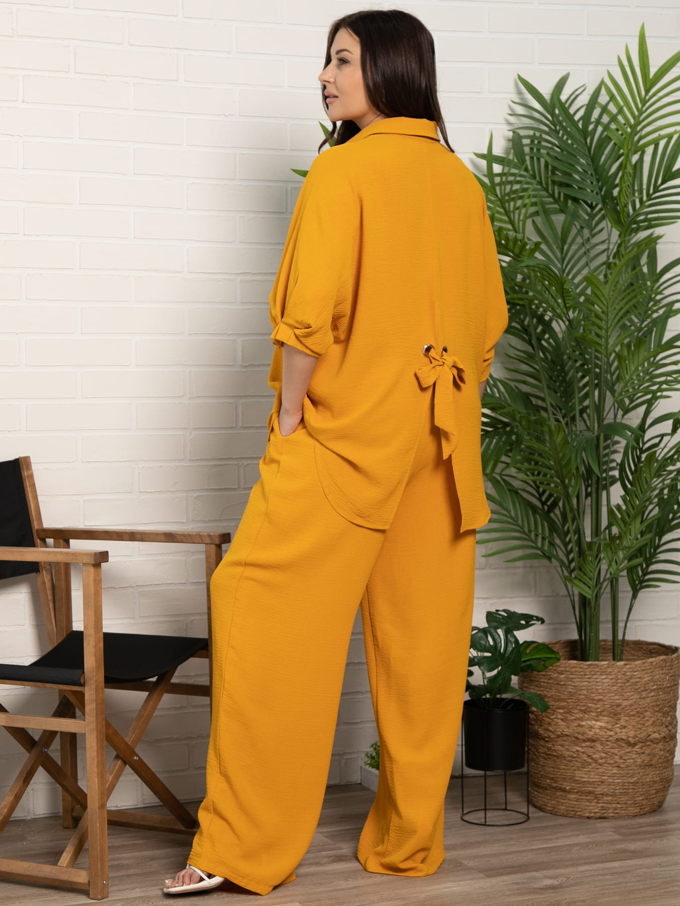 Женский костюм-двойка горчичного цвета подарит вам стильный и удобный образ на каждый день! Яркий и современный комплект станет отличным выбором для прогулок, встреч и спокойных выходных. Верх с рукавом три четверти и воротником-стойкой придает образу легкость и элегантность. Пояс с люверсами по спинке добавляет изюминку и позволяет адаптировать посадку. Брюки свободного кроя с резинкой на талии обеспечивают удобство и свободу движений. Легкий и практичный дизайн делает этот костюм универсальным элементом гардероба.