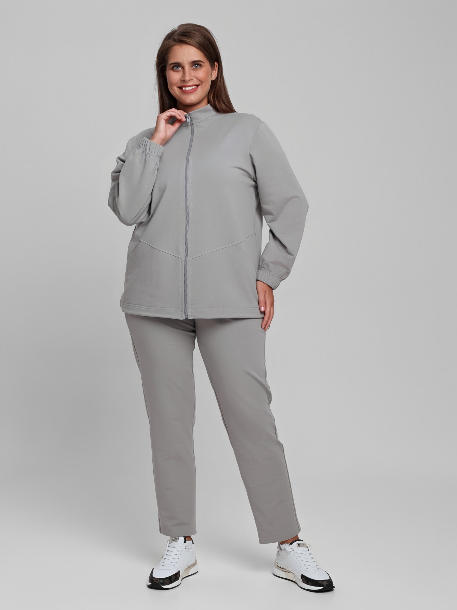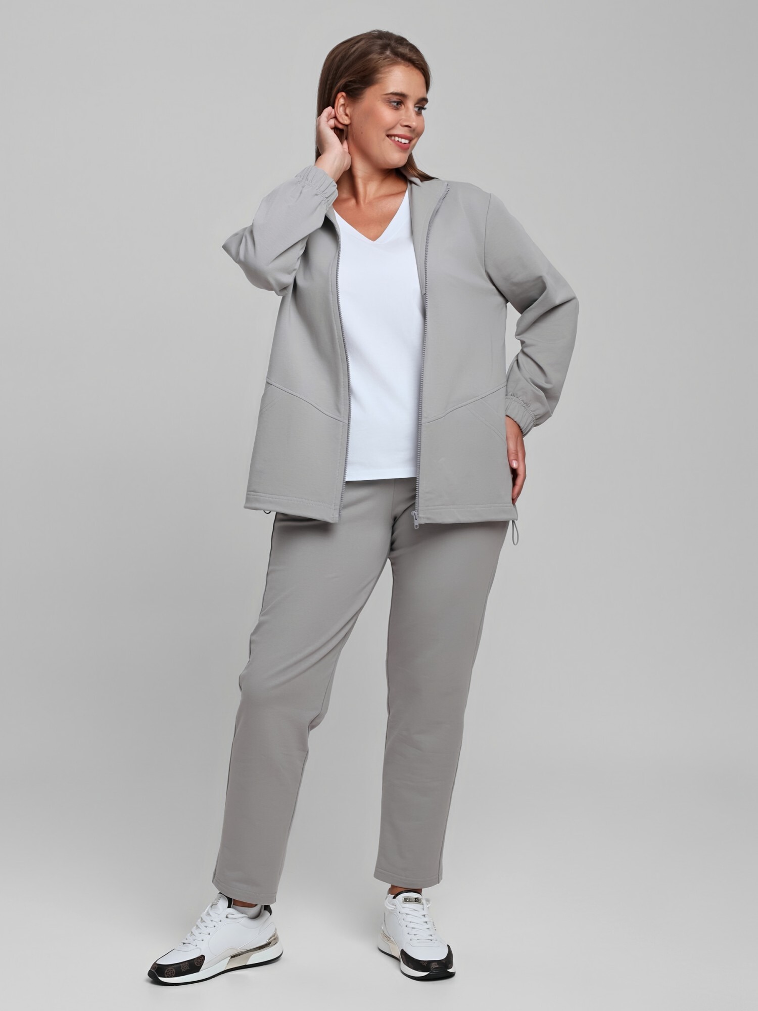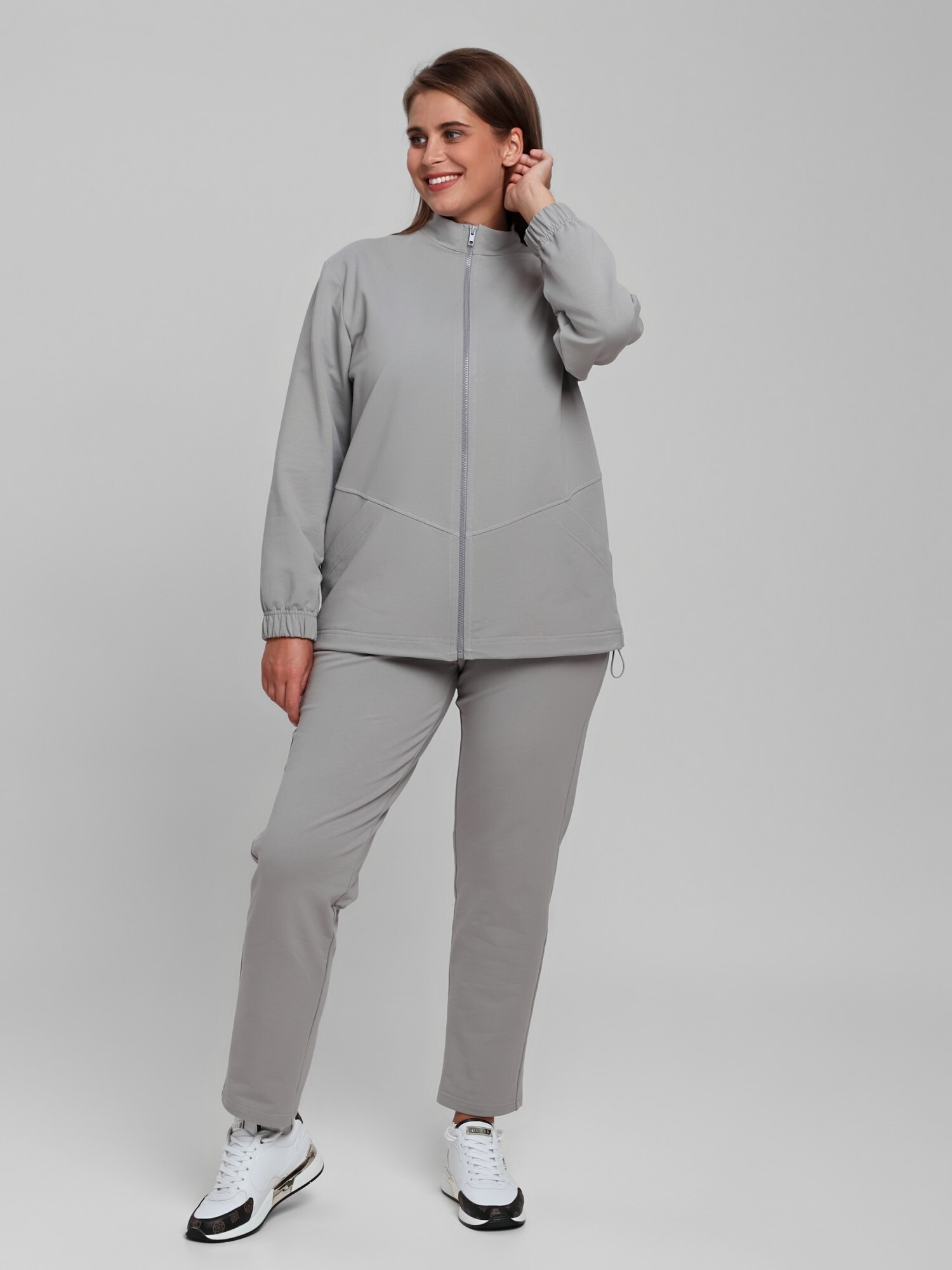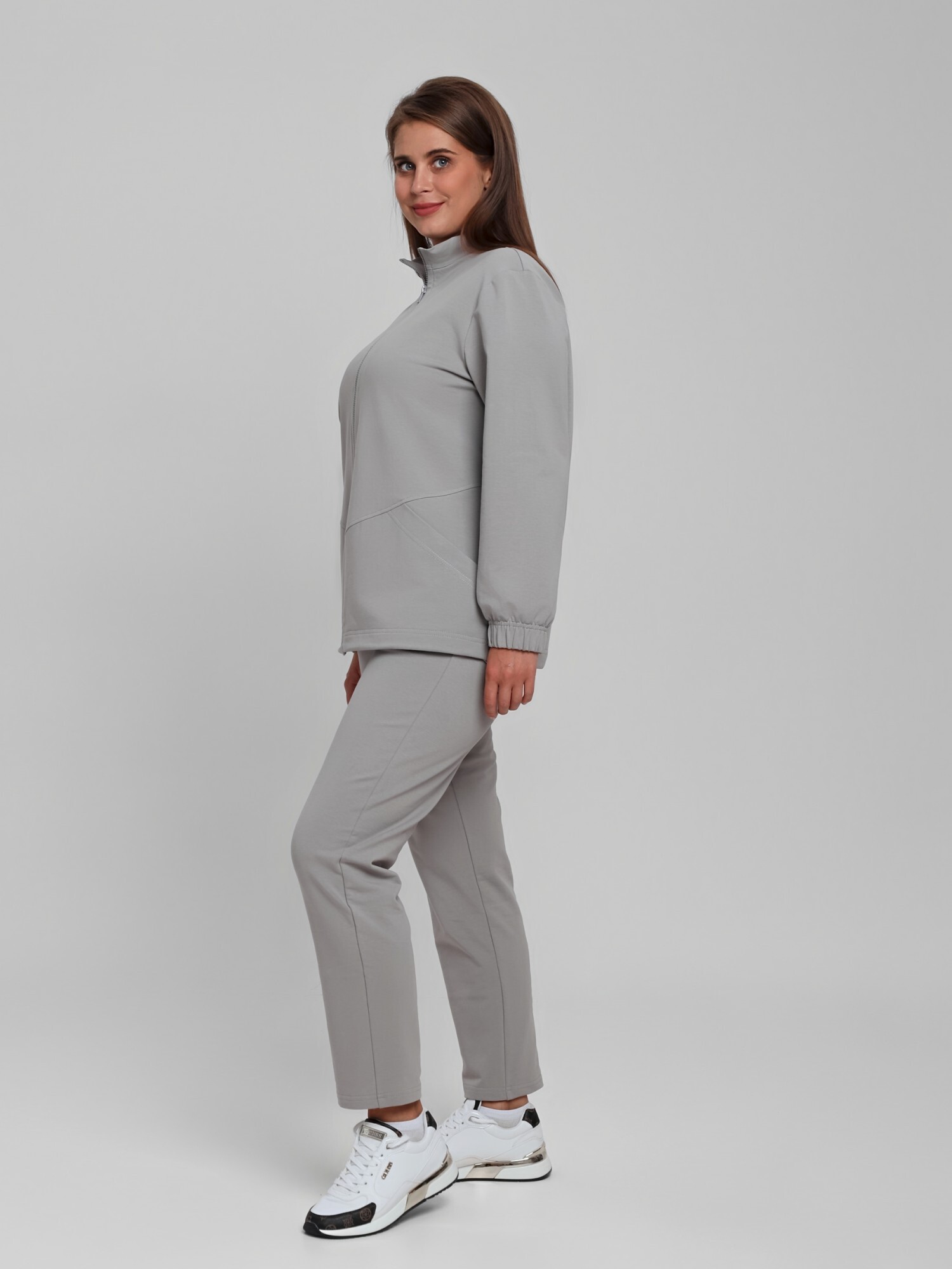 Костюм женский из трикотажного полотна «футер-двунитка» в единой цветовой гамме, состоящий из куртки и брюк. Куртка - прямого силуэта, свободная с длинными втачными рукавами, воротником «стойкой». Полочка состоит из двух частей соединенных по-косой, с накладными карманами и центральной бортовой застежкой на тесьму «молния». Низ рукавов обработан эластичной тесьмой, низ изделия с подгибкой с вложение эластичной тесьмы и регулируется по длине с помощью фиксаторов.Брюки - длинные, классического покроя, на притачном поясе с эластичной тесьмой внутри и карманами в боковых шва, на задних половинах обработаны две вытачки в области линии талии.