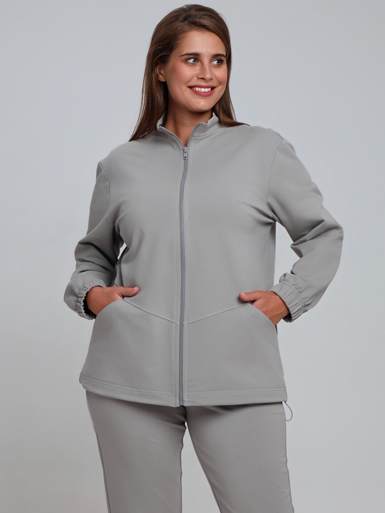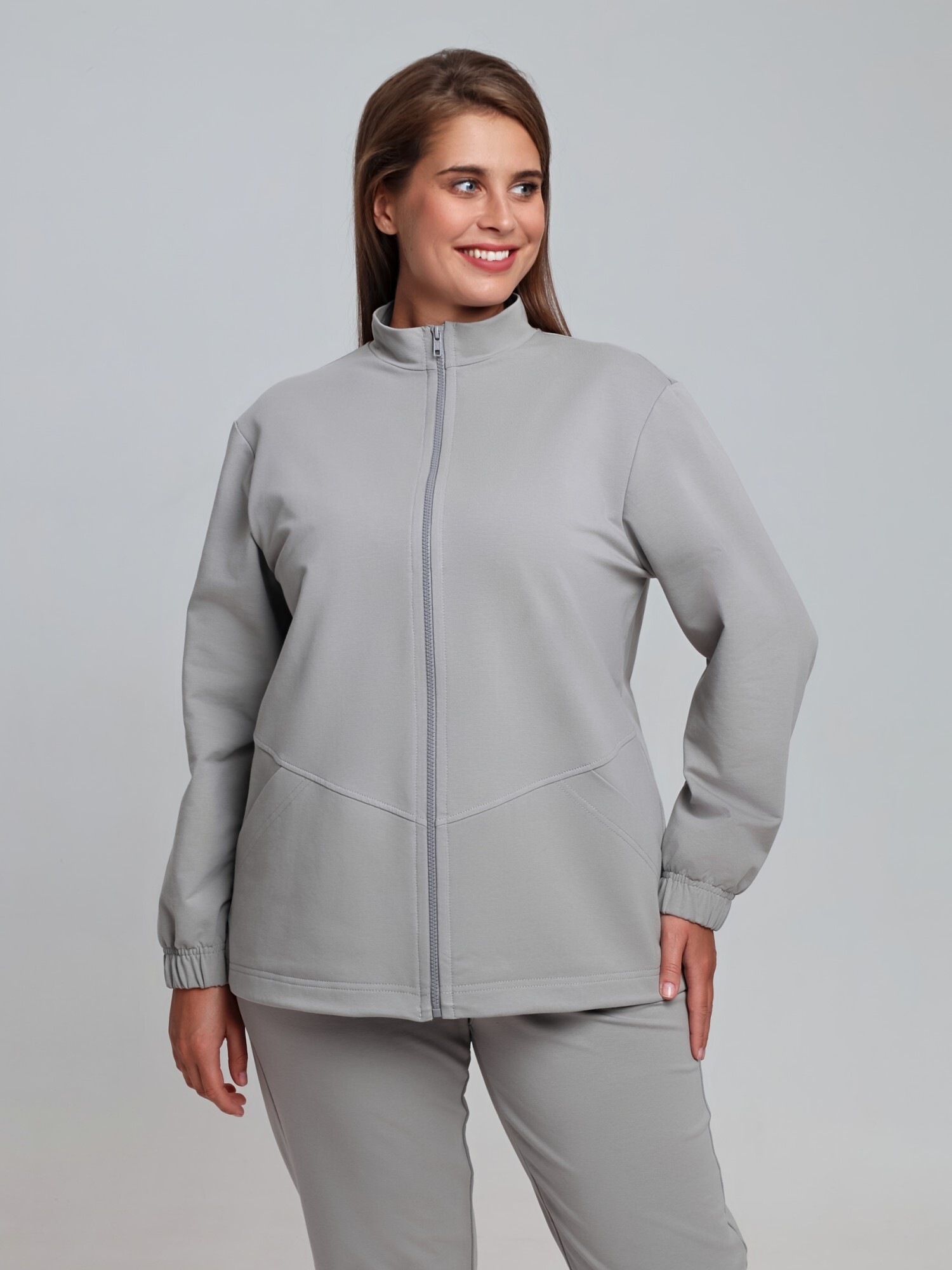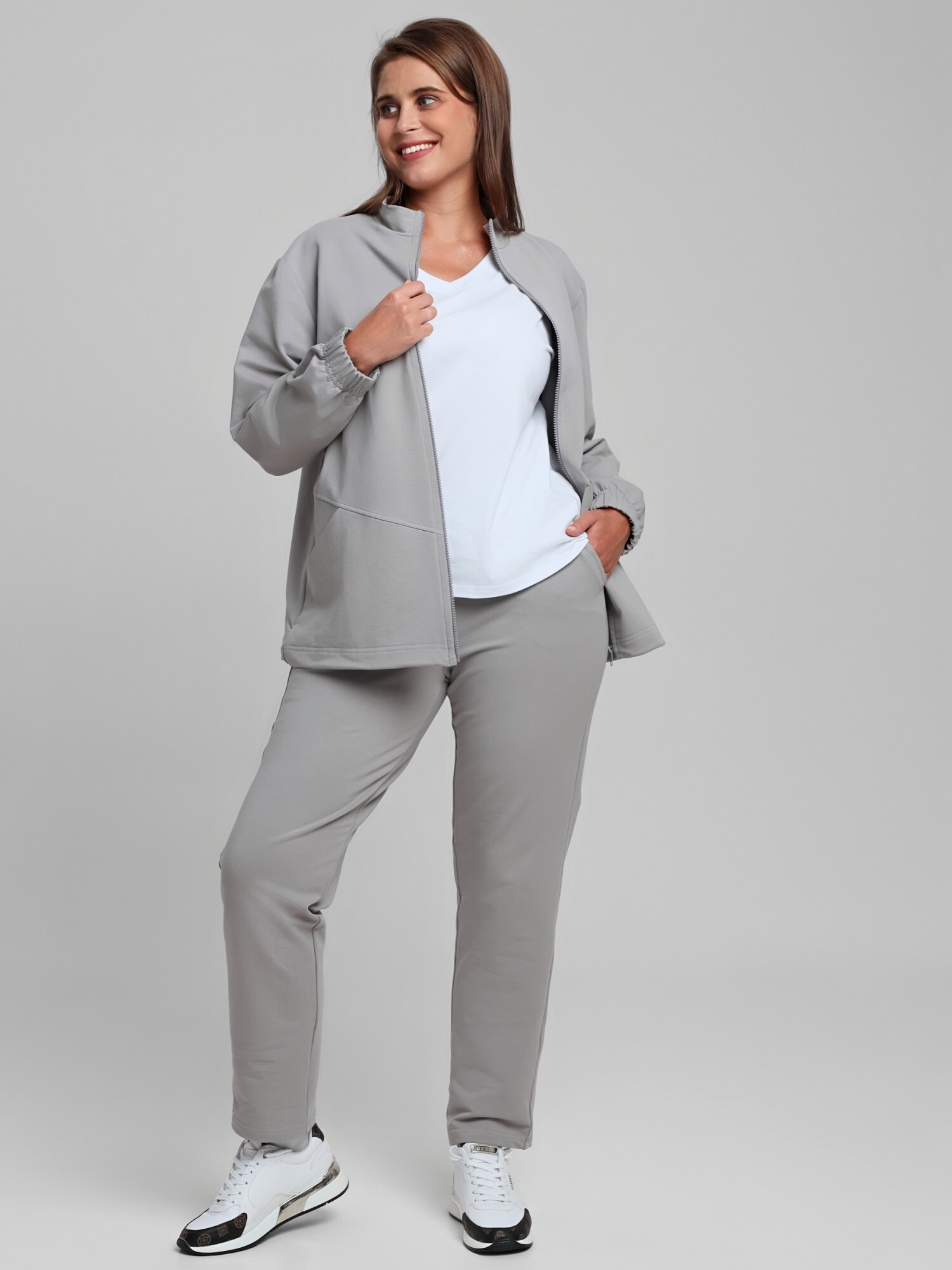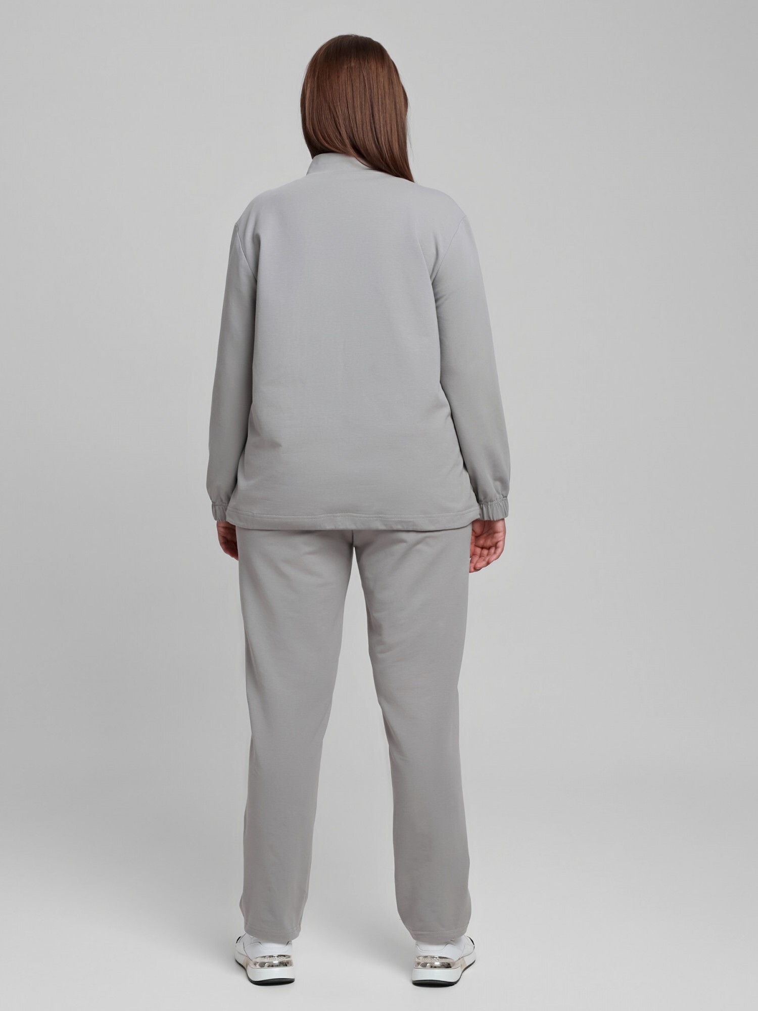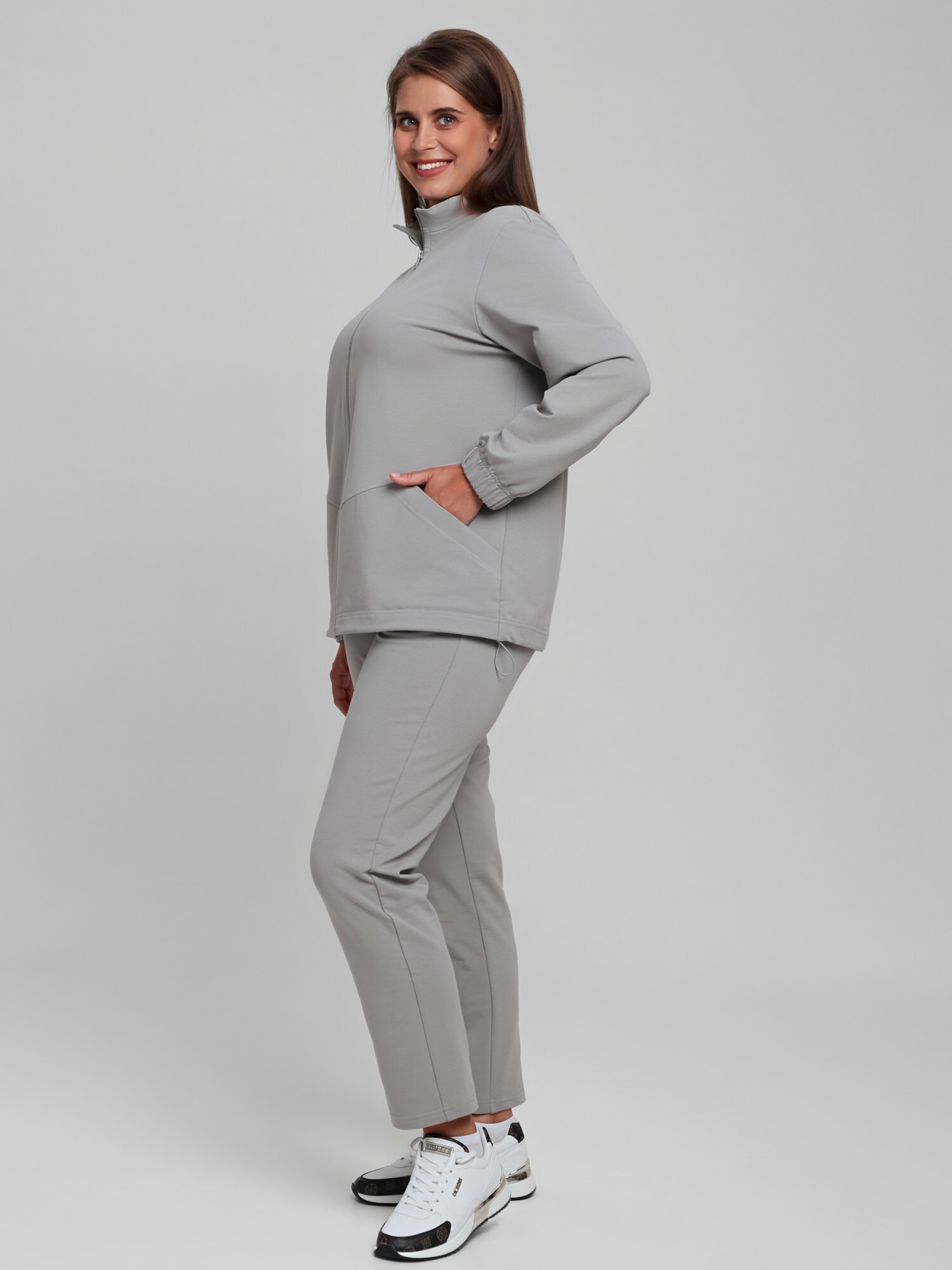 Костюм женский из трикотажного полотна «футер-двунитка» в единой цветовой гамме, состоящий из куртки и брюк. Куртка - прямого силуэта, свободная с длинными втачными рукавами, воротником «стойкой». Полочка состоит из двух частей соединенных по-косой, с накладными карманами и центральной бортовой застежкой на тесьму «молния». Низ рукавов обработан эластичной тесьмой, низ изделия с подгибкой с вложение эластичной тесьмы и регулируется по длине с помощью фиксаторов.Брюки - длинные, классического покроя, на притачном поясе с эластичной тесьмой внутри и карманами в боковых шва, на задних половинах обработаны две вытачки в области линии талии.