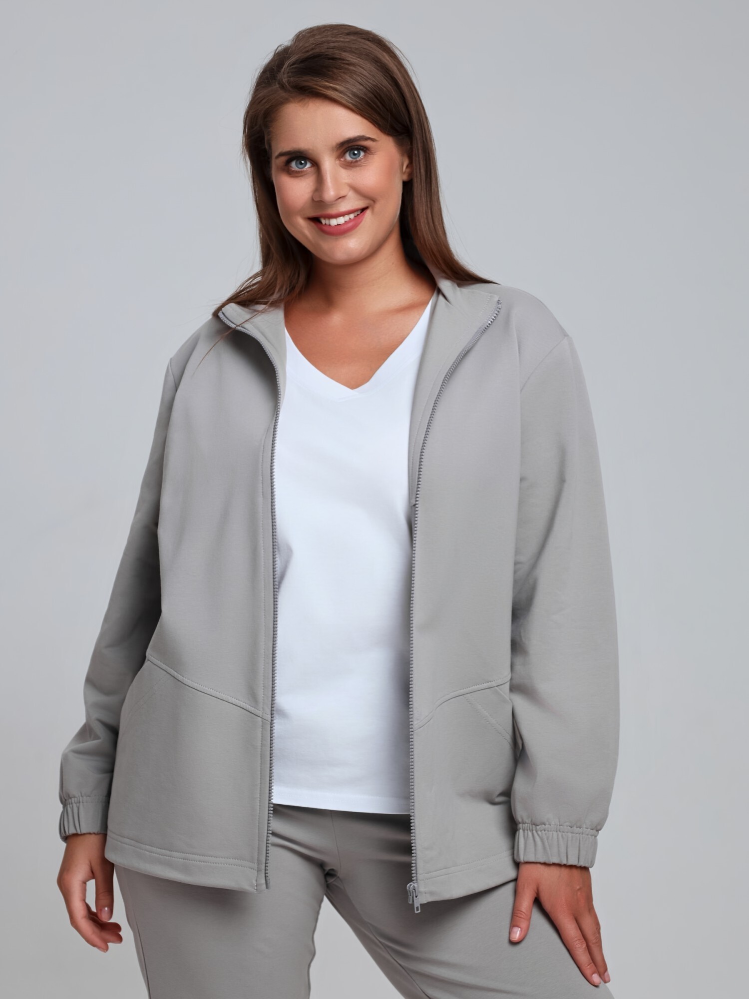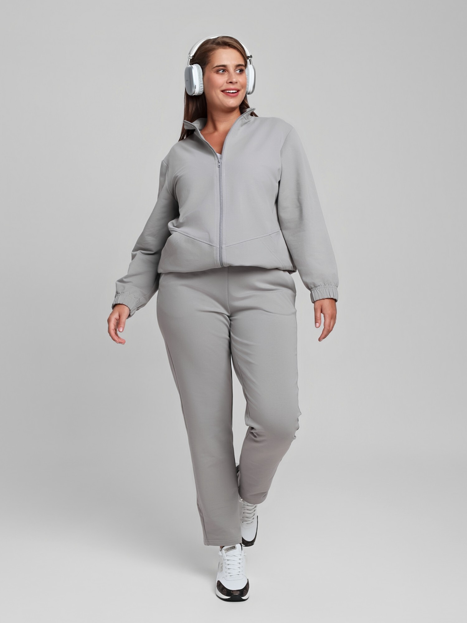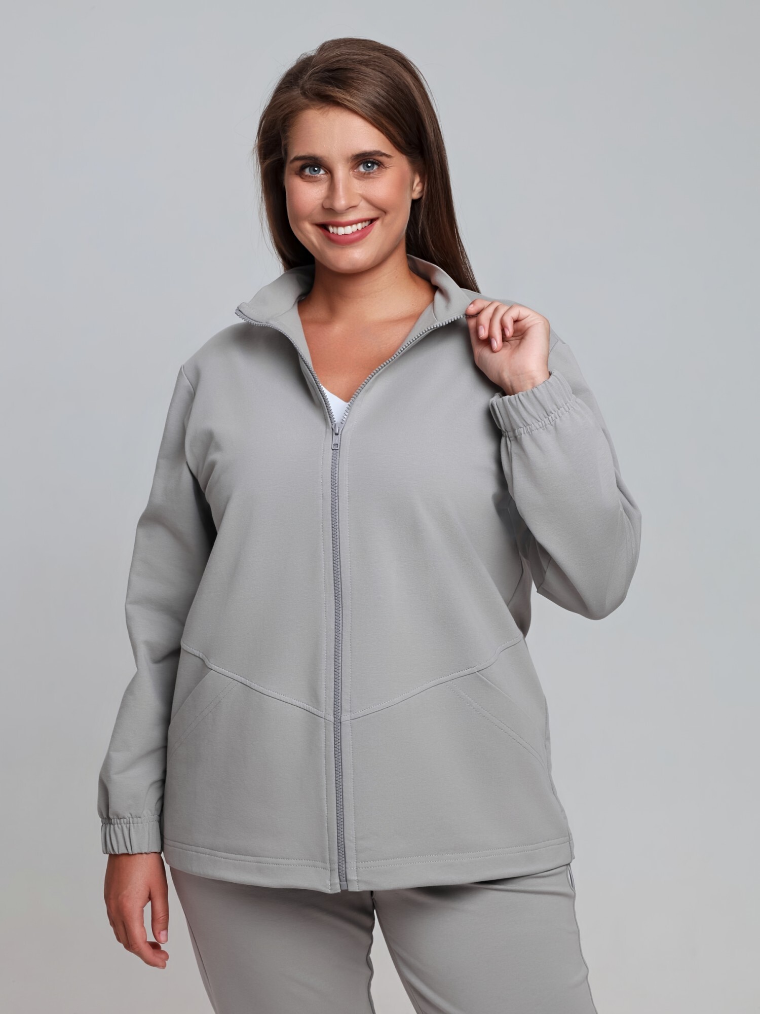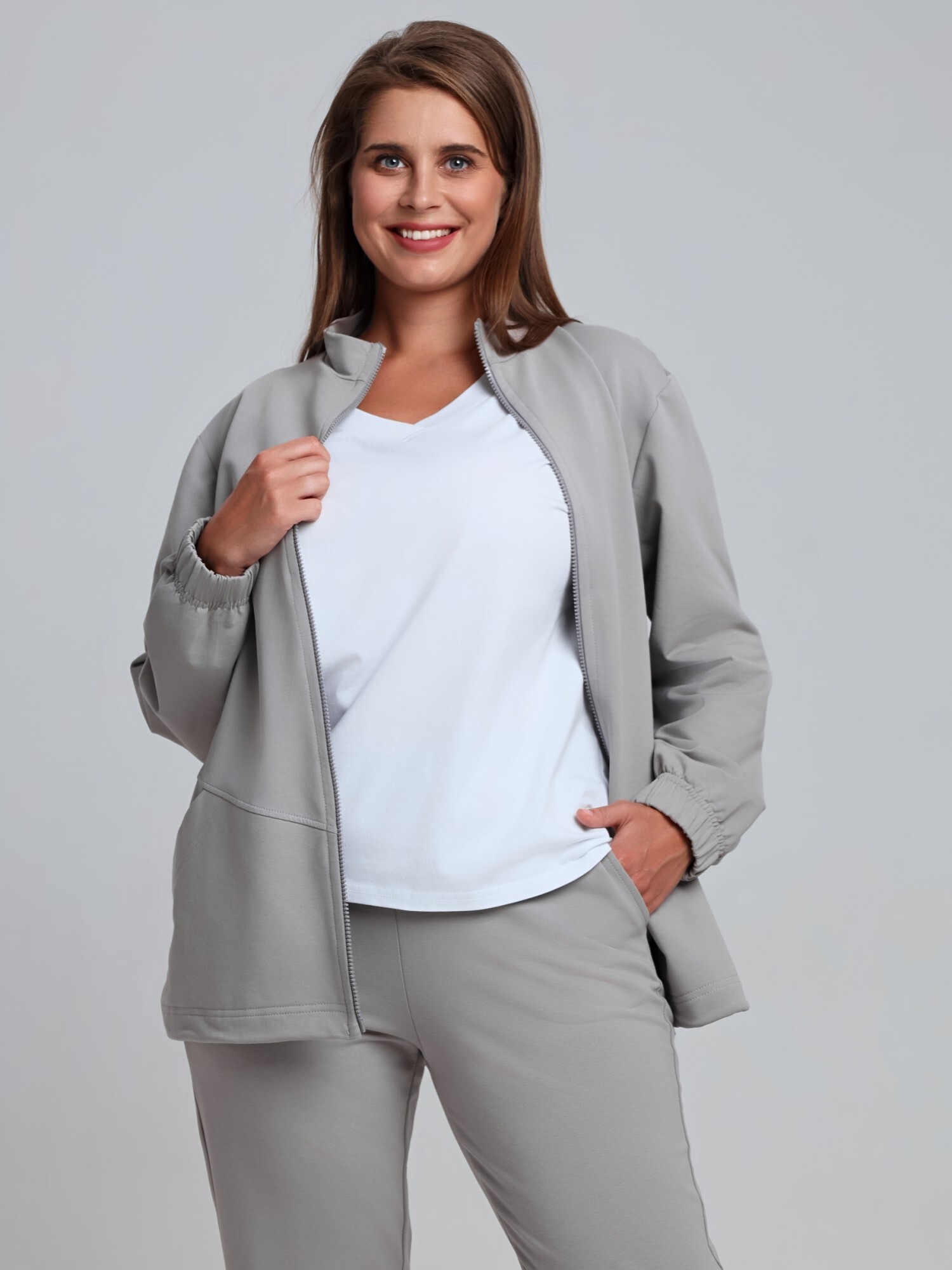 Костюм женский из трикотажного полотна «футер-двунитка» в единой цветовой гамме, состоящий из куртки и брюк. Куртка - прямого силуэта, свободная с длинными втачными рукавами, воротником «стойкой». Полочка состоит из двух частей соединенных по-косой, с накладными карманами и центральной бортовой застежкой на тесьму «молния». Низ рукавов обработан эластичной тесьмой, низ изделия с подгибкой с вложение эластичной тесьмы и регулируется по длине с помощью фиксаторов.Брюки - длинные, классического покроя, на притачном поясе с эластичной тесьмой внутри и карманами в боковых шва, на задних половинах обработаны две вытачки в области линии талии.
