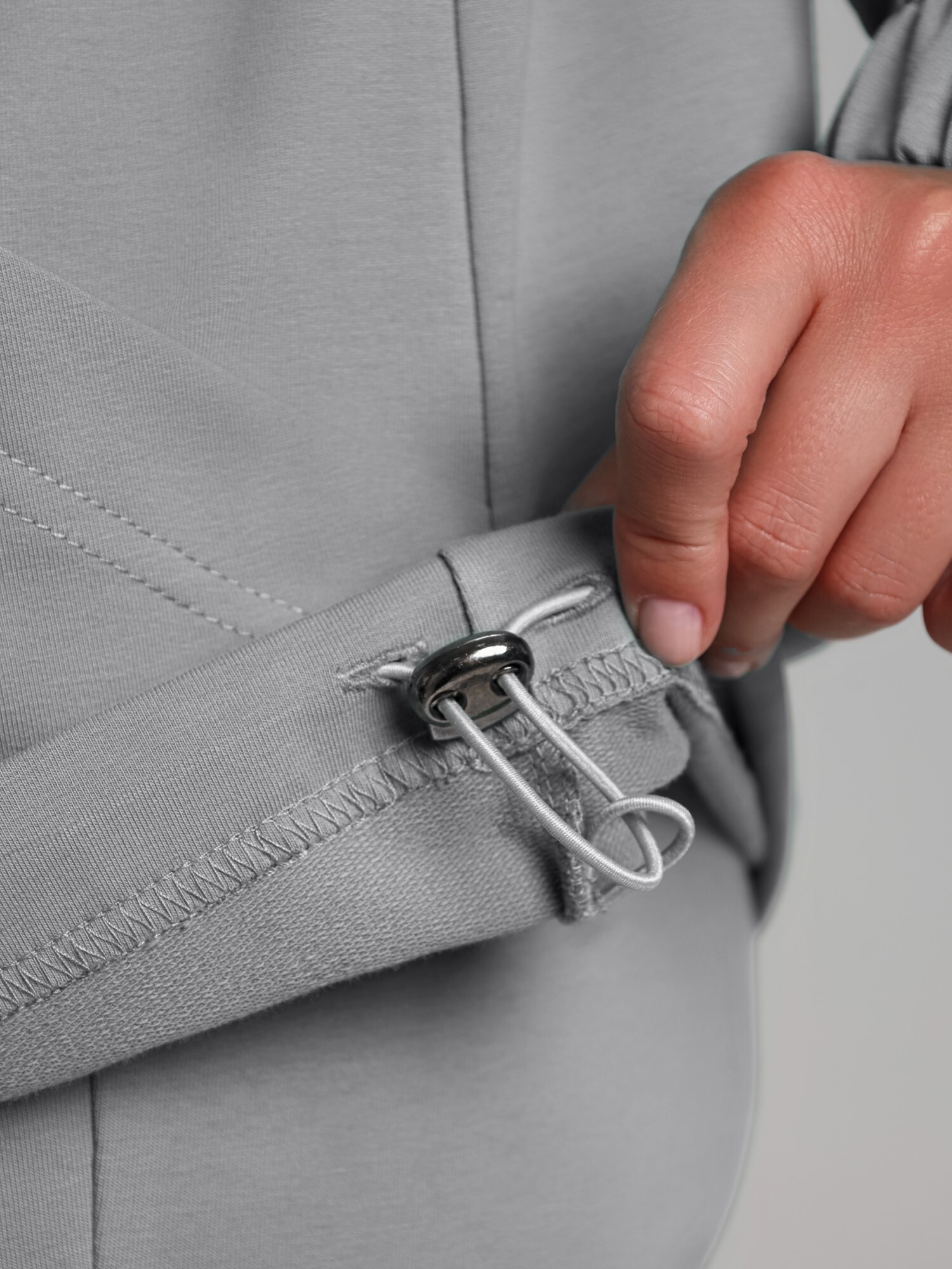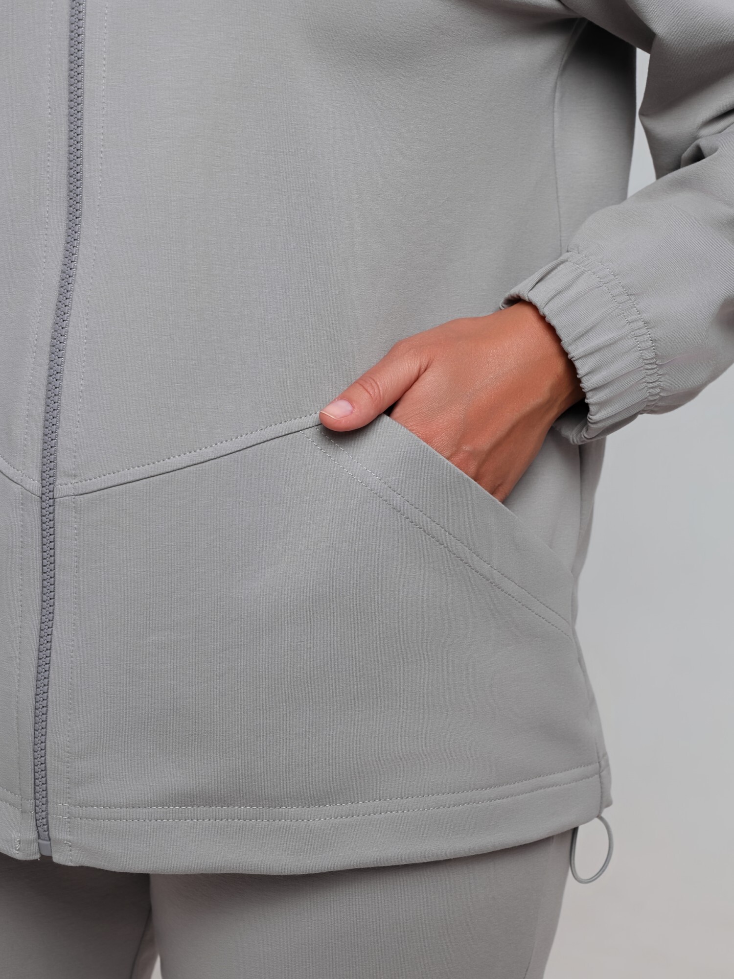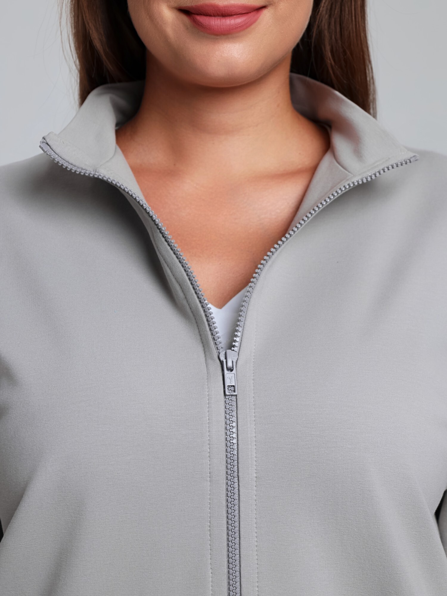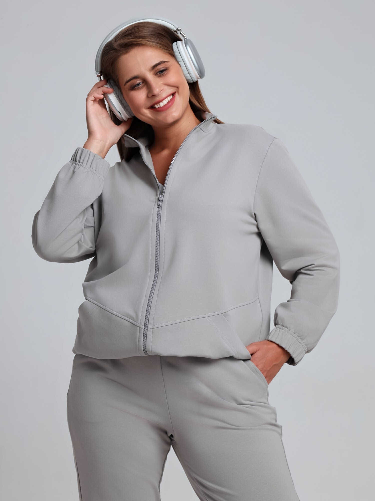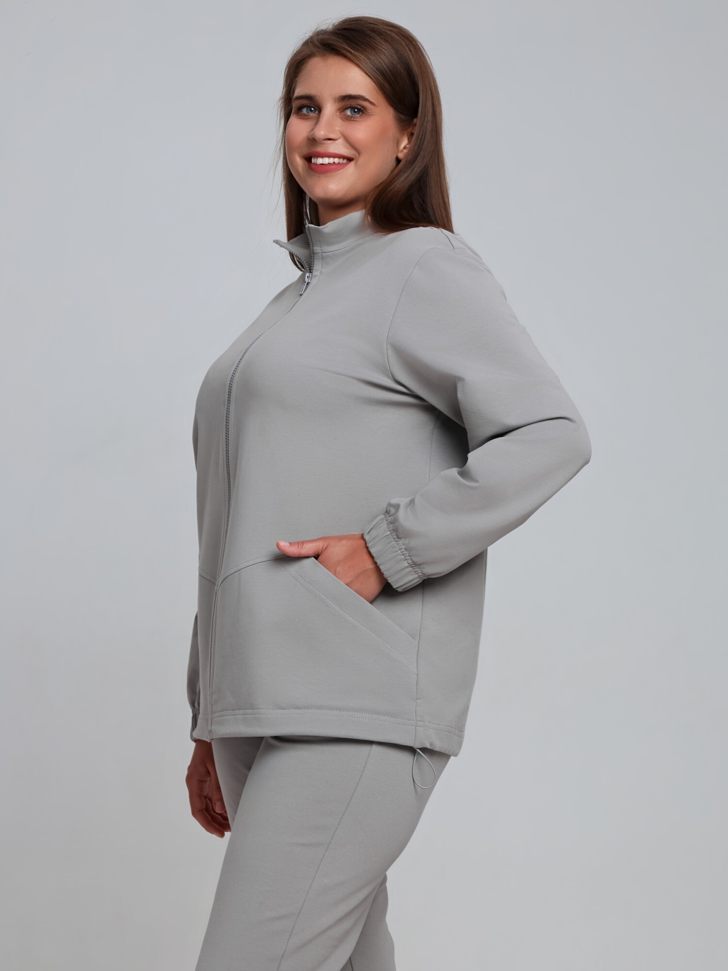 Костюм женский из трикотажного полотна «футер-двунитка» в единой цветовой гамме, состоящий из куртки и брюк. Куртка - прямого силуэта, свободная с длинными втачными рукавами, воротником «стойкой». Полочка состоит из двух частей соединенных по-косой, с накладными карманами и центральной бортовой застежкой на тесьму «молния». Низ рукавов обработан эластичной тесьмой, низ изделия с подгибкой с вложение эластичной тесьмы и регулируется по длине с помощью фиксаторов.Брюки - длинные, классического покроя, на притачном поясе с эластичной тесьмой внутри и карманами в боковых шва, на задних половинах обработаны две вытачки в области линии талии.